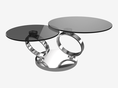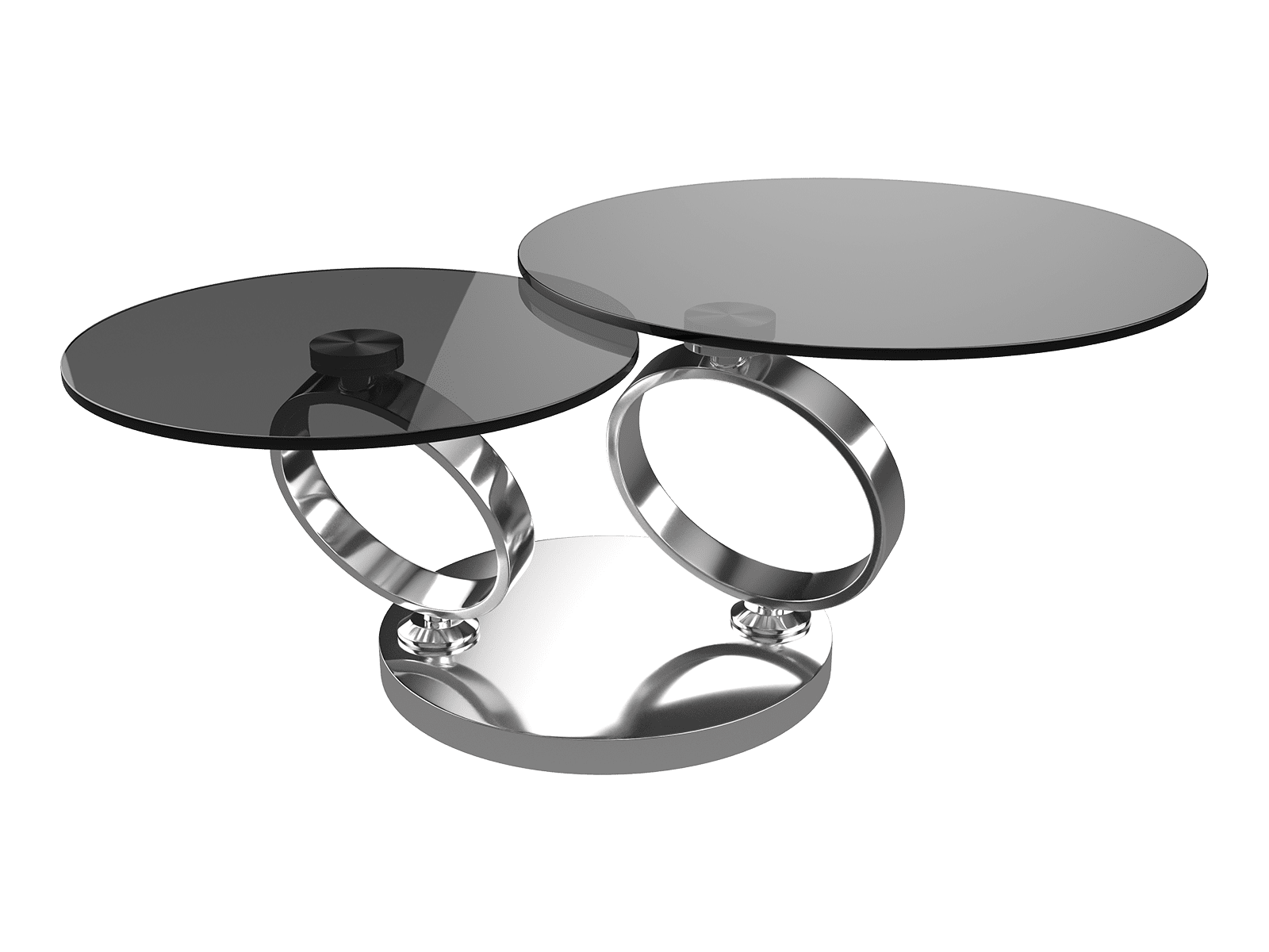 Der Couchtisch Eolia ist seit vielen Jahren ein großer Klassiker unter den Möbeln. Es handelt sich um einen Funktionstisch mit einem synchronisierten Rotationsmechanismus. Die Bodenplatte besteht aus schwarz lackiertem Edelstahl und ist sehr schwer, was die Stabilität des Tisches gewährleistet. Seine Arme bestehen aus zwei kreisförmigen Ringe, die sich beim Ausfahren der Platten synchron drehen. Dieser Couchtisch ist in verschiedenen Ausführungen erhältlich, und zwar mit einer aus Edelstahl polierten (glänzend) oder einer schwarz lackierten Bodenplatte. Die Glastischplatten gibt es in klar oder grau getönt. Die in Spanien hergestellten Keramikplatten gibt es in vier verschiedenen Ausführungen. Sie sind auf 6 mm starkem Glas verklebt. Die untere Platte ist immer eine 10 mm starke Temperglasplatte. Der hier abgebildete Couchtisch EOLIA hat zwei Platten aus grau getöntem Glas und ein Gestell in Edelstahl poliert.