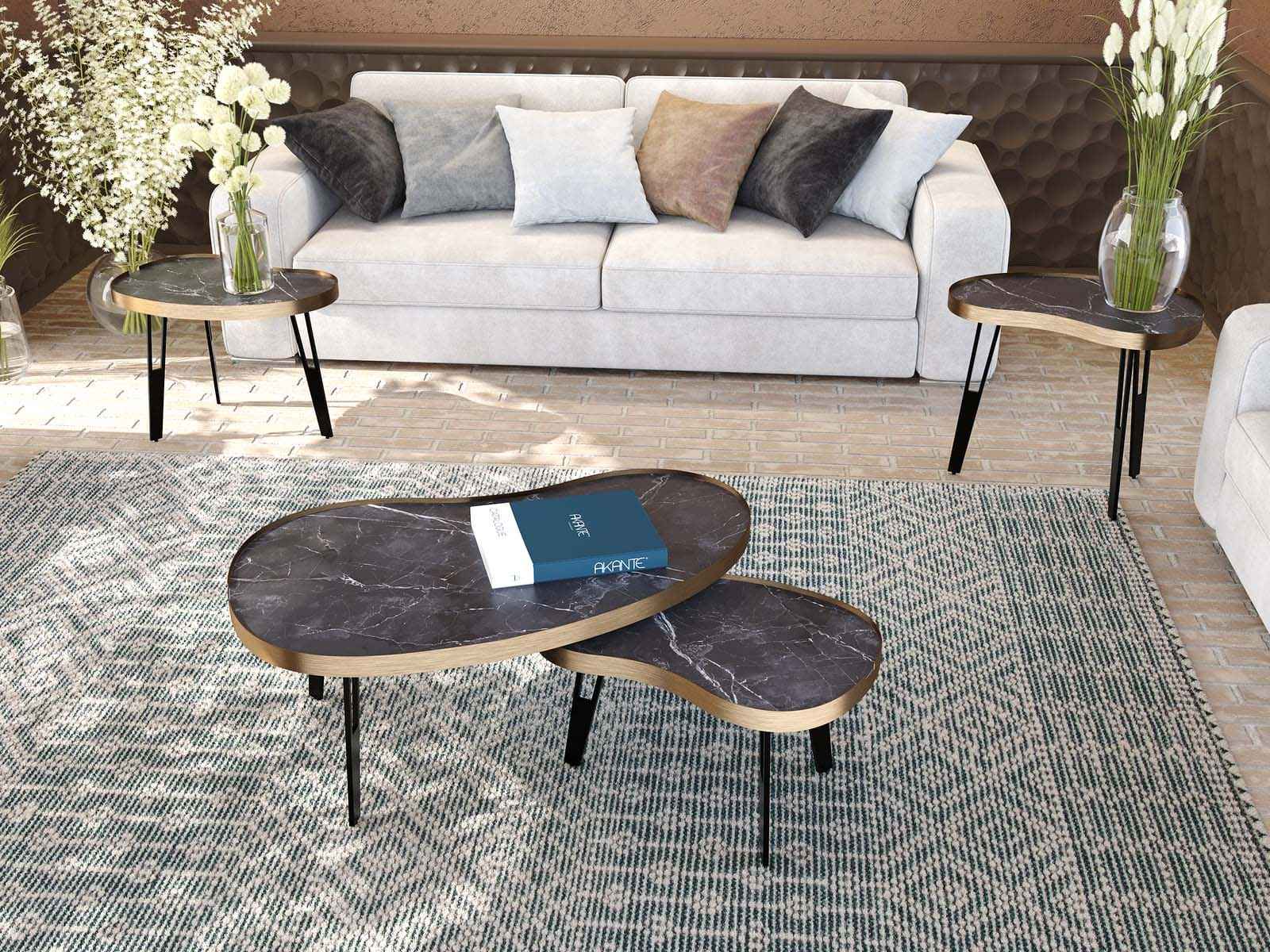 Akante präsentiert Ihnen den Couchtisch Monza. Mit seiner einzigartigen Keramikplatte aus Marquina-Marmor wird er sich leicht in Ihre Einrichtung einfügen. Die Keramik ist elegant, schlicht und besitzt eine Dicke von 11 mm. Die Stahleinfassung in Messingoptik verleiht dem Design des Tisches den letzten Schliff. Das durchbrochene Gestell aus mattschwarz lackiertem Stahl verleiht Ihrem Wohnzimmer einen trendigen Look. Seine Höhe beträgt 38 cm. Kombinieren Sie Monza mit einem Beistelltisch aus derselben Serie, um eine harmonische Einrichtung zu erhalten.