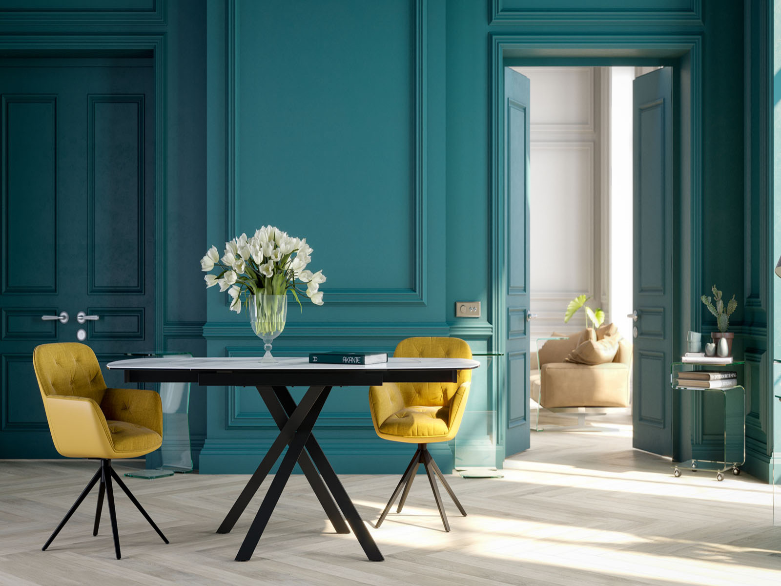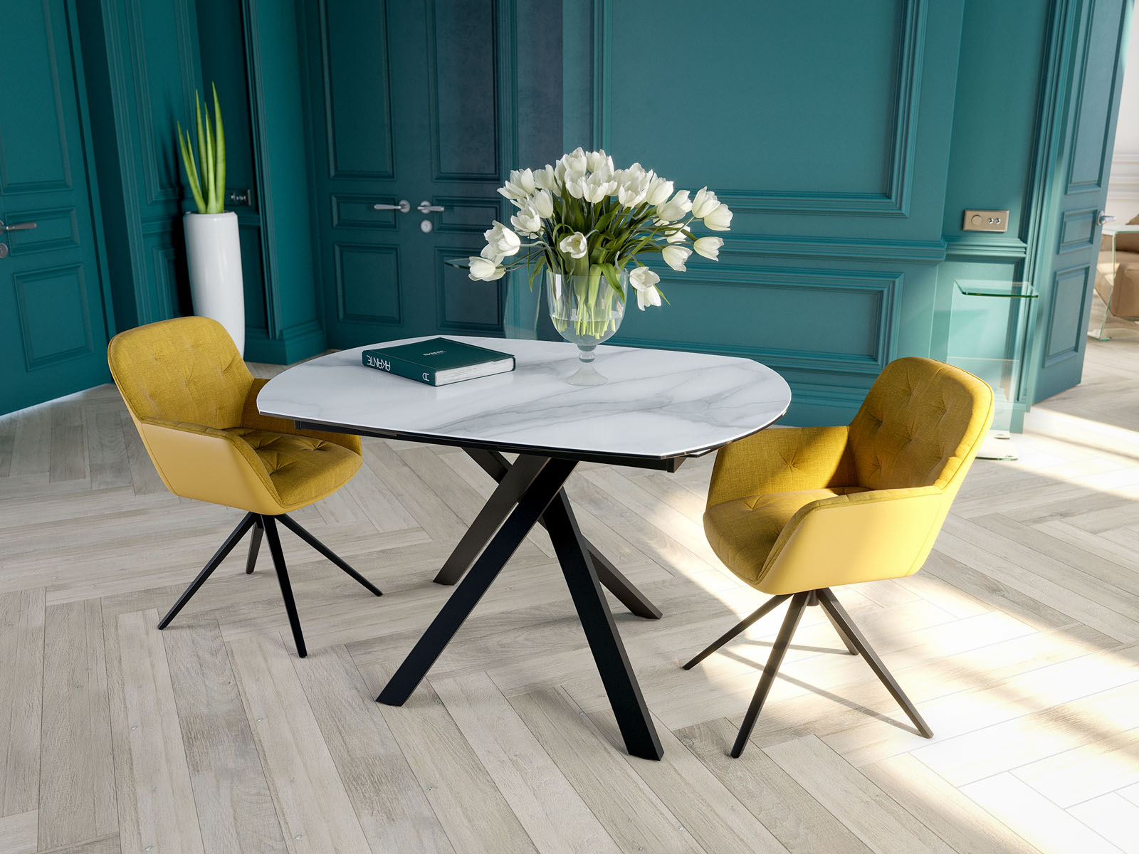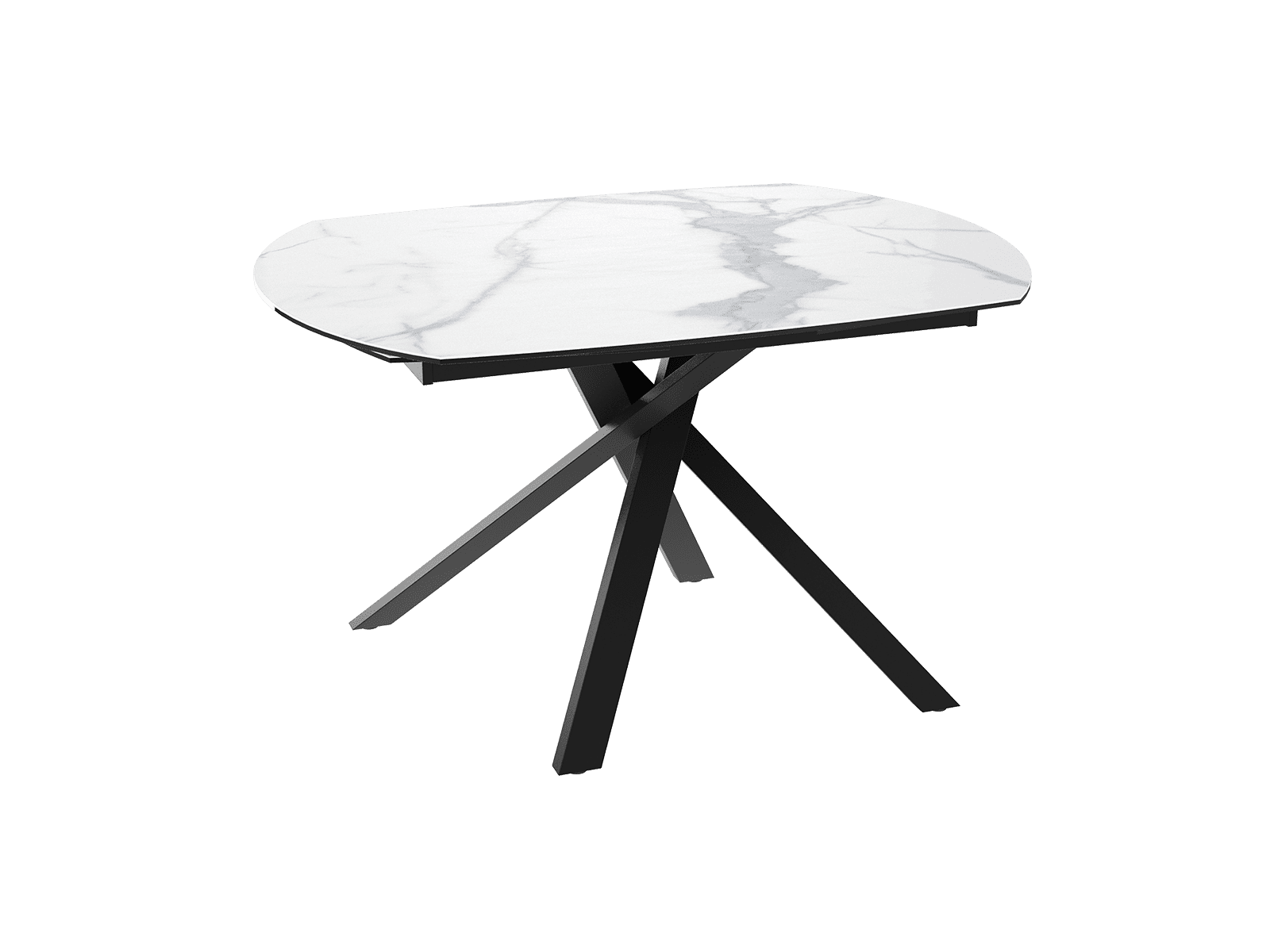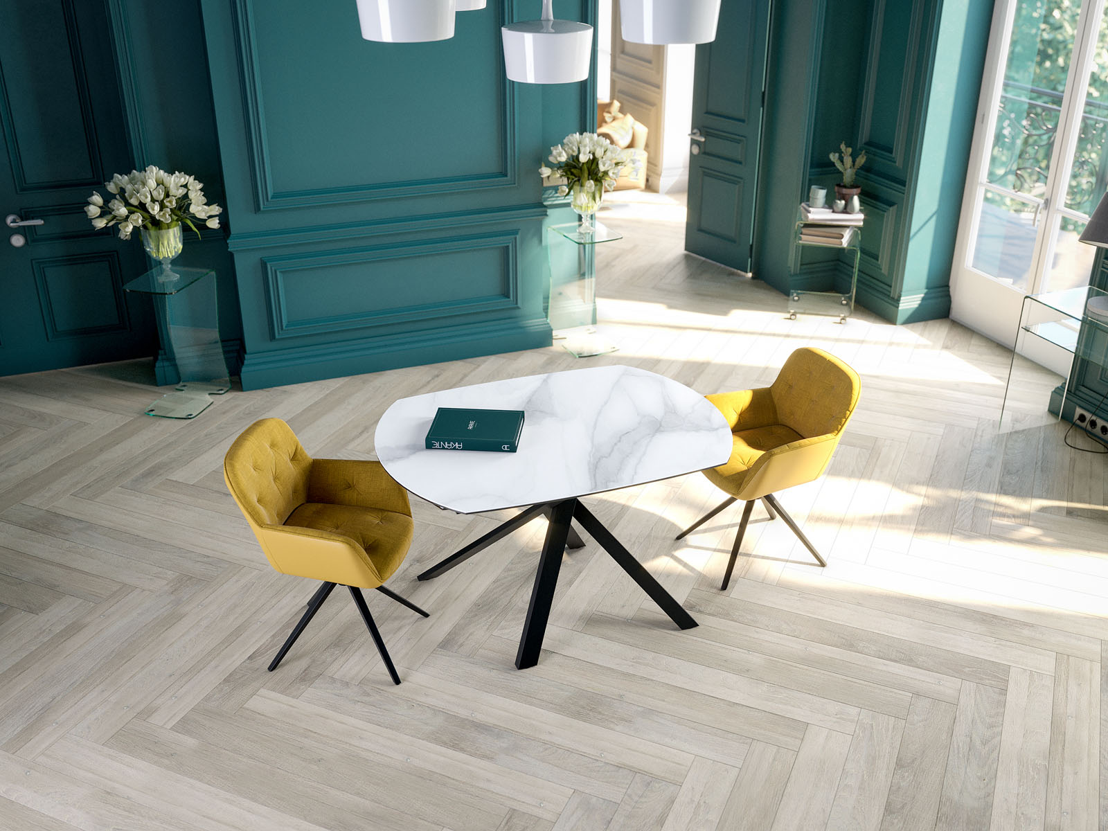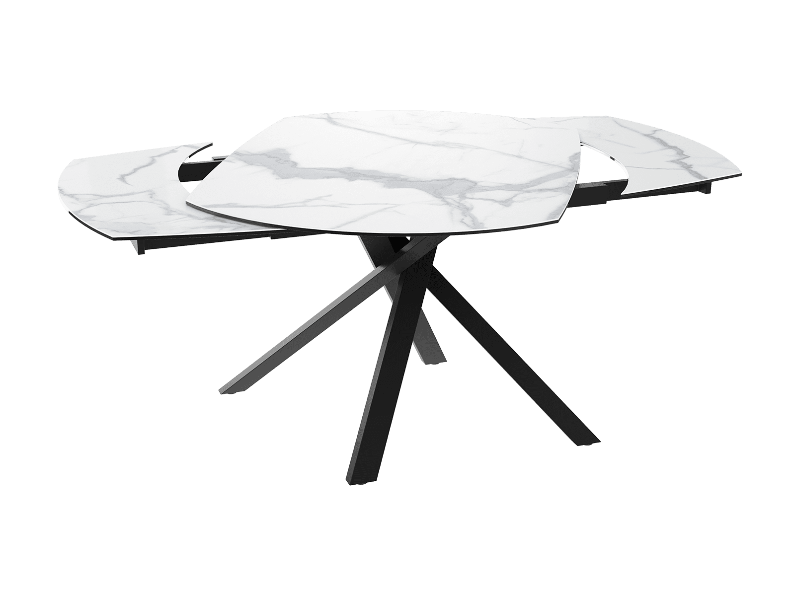 Kheops, ein130 cm langer Esstisch, perfekt für alle, die moderne, schicke und zeitgenössische Dekoration lieben. Praktisch dank seines synchronisierten Systems, das sich durch einfaches Drehen an der zentralen Tischplatte öffnet, wodurch Sie im Handumdrehen einen 190 cm langen Tisch erhalten. Die Keramikplatte in weißer Marmoroptik lässt das Licht in Ihren Raum herein. Sie ist 3 mm dick verklebt auf ein 8 mm starkem Glas. Kheops ist äußerst solide und einfach im Gebrauch. Seine Stabilität wird durch sein raffiniertes und originelles Gestell aus mattschwarz lackiertem Stahl gewährleistet. Auch in den Maßen 120/180 cm erhältlich, ist er ideal für Küche, Esszimmer oder einer minimalistischen Einrichtung.