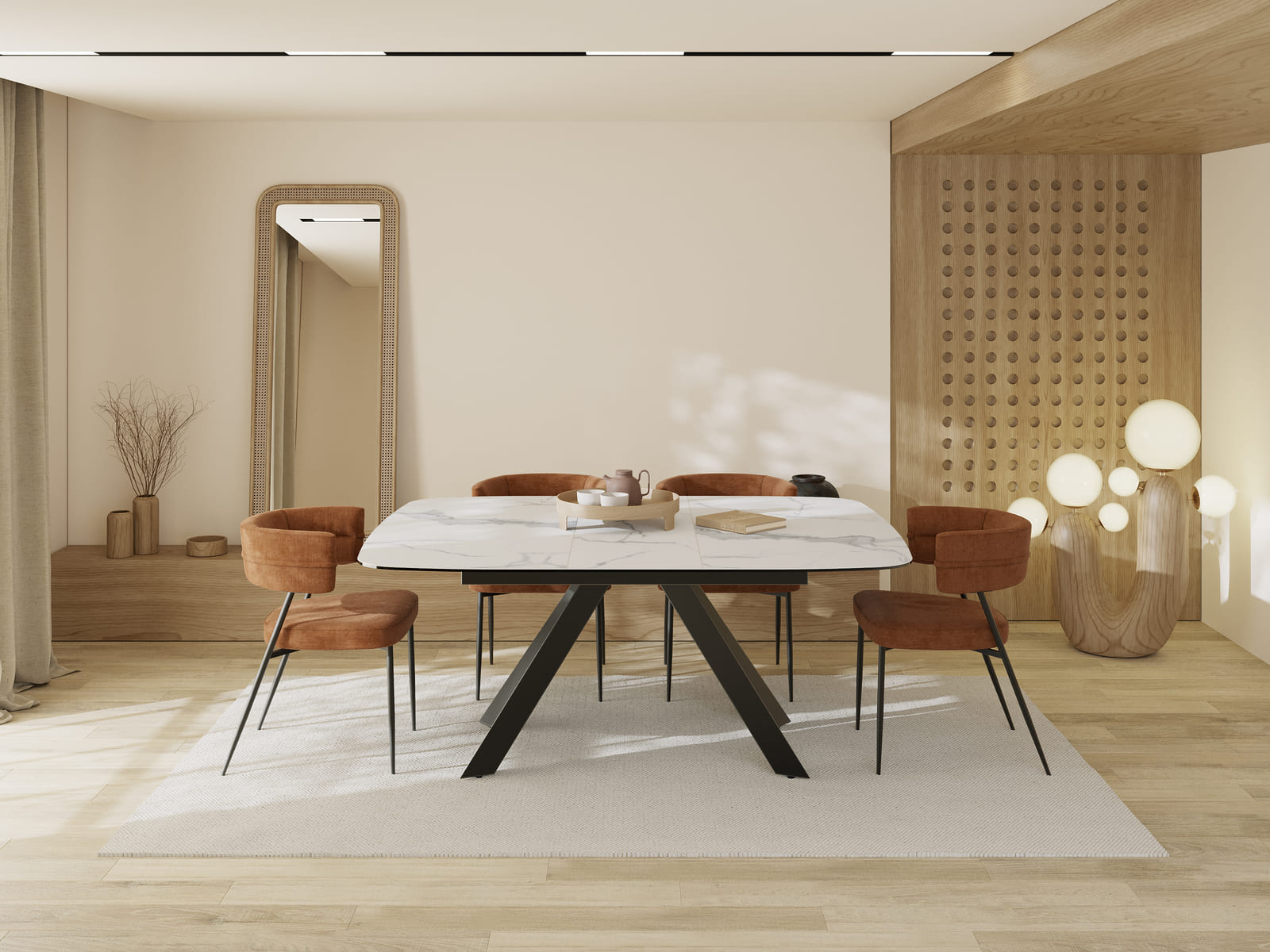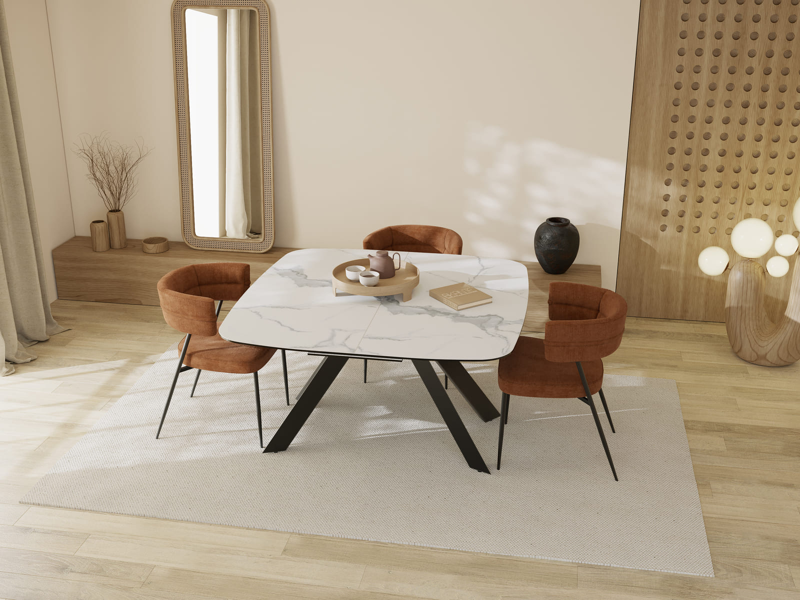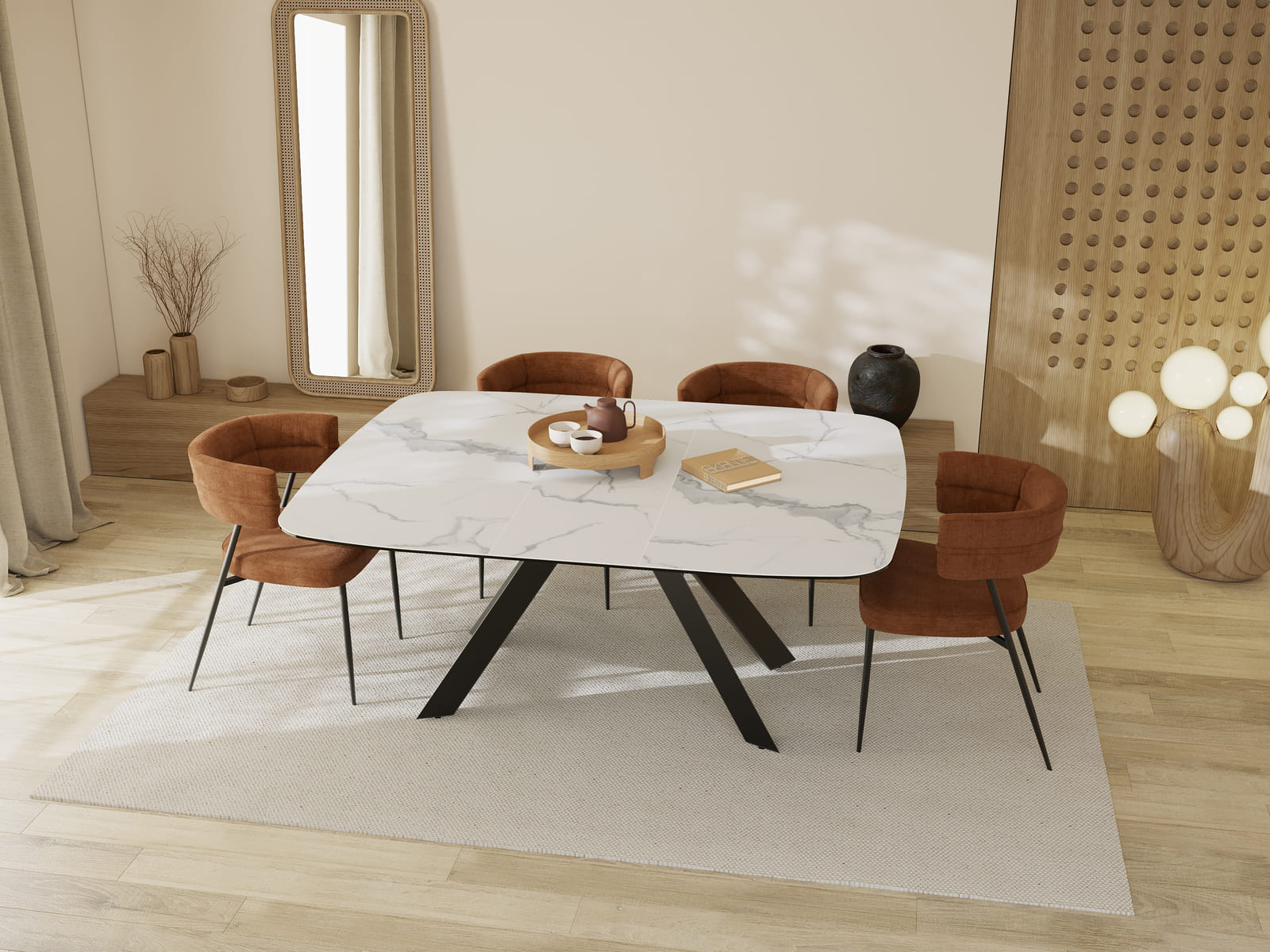 Maße & Details Nettogewicht : 111,5 Kg Farbe : Marmoroptik Maße : 135 x 135 x 76 cm Maße offen : 175 x 135 x 76 cm Höhe : 76 cm Breite : 135 cm Länge : 135 cm Anzahl der Sitzplätze : Für 6 bis 8 Personen Gestell : Mattschwarz lackierter Stahl Platte : 3 mm Keramik, geklebt auf 8 mm Glas INPI : 20244788