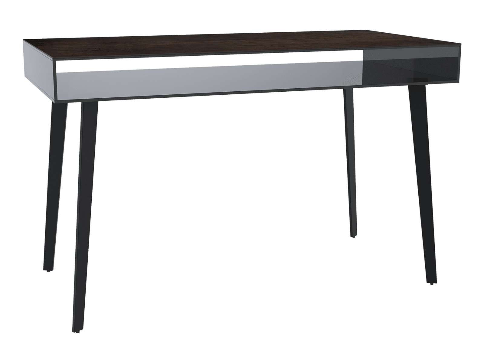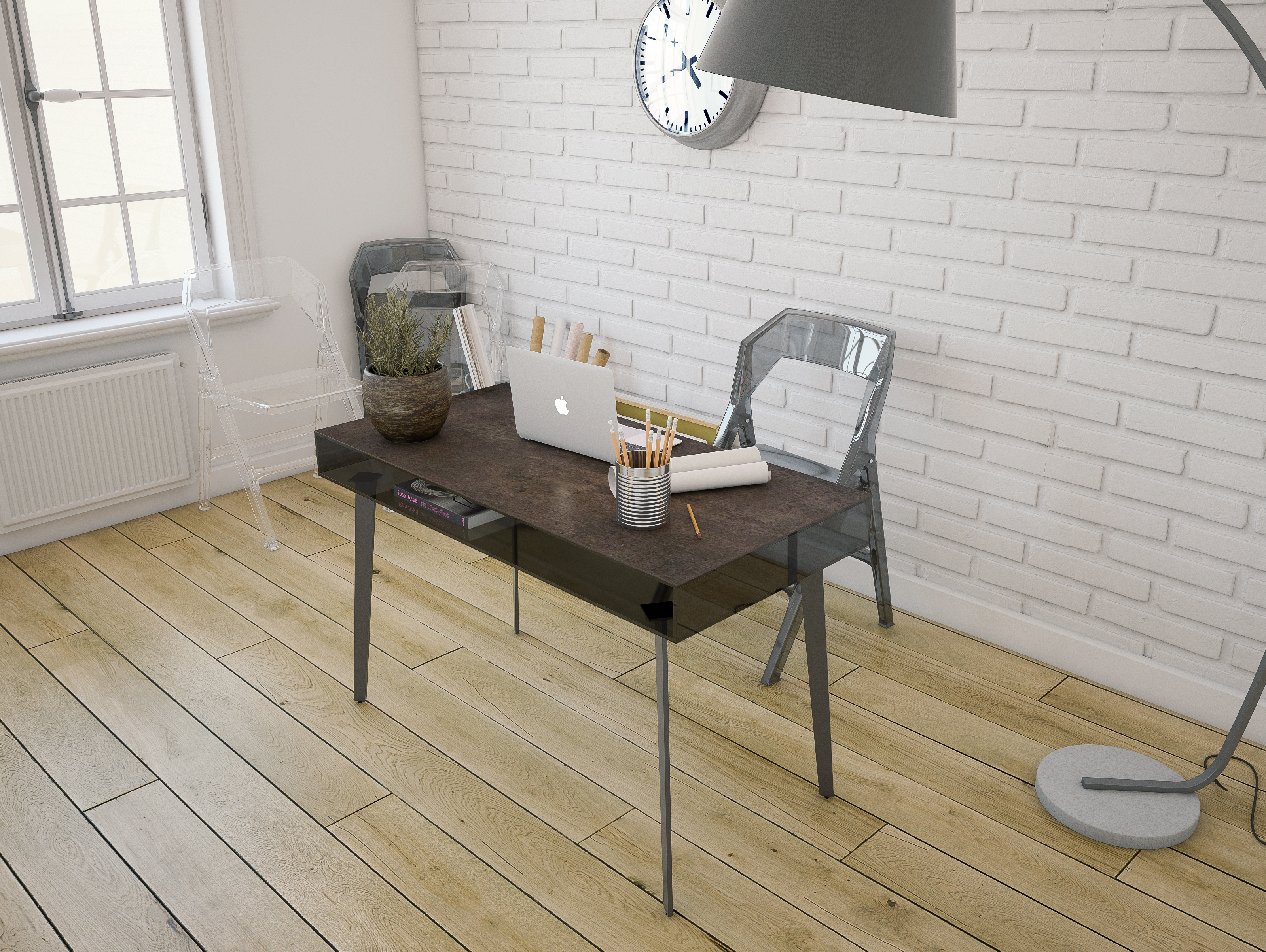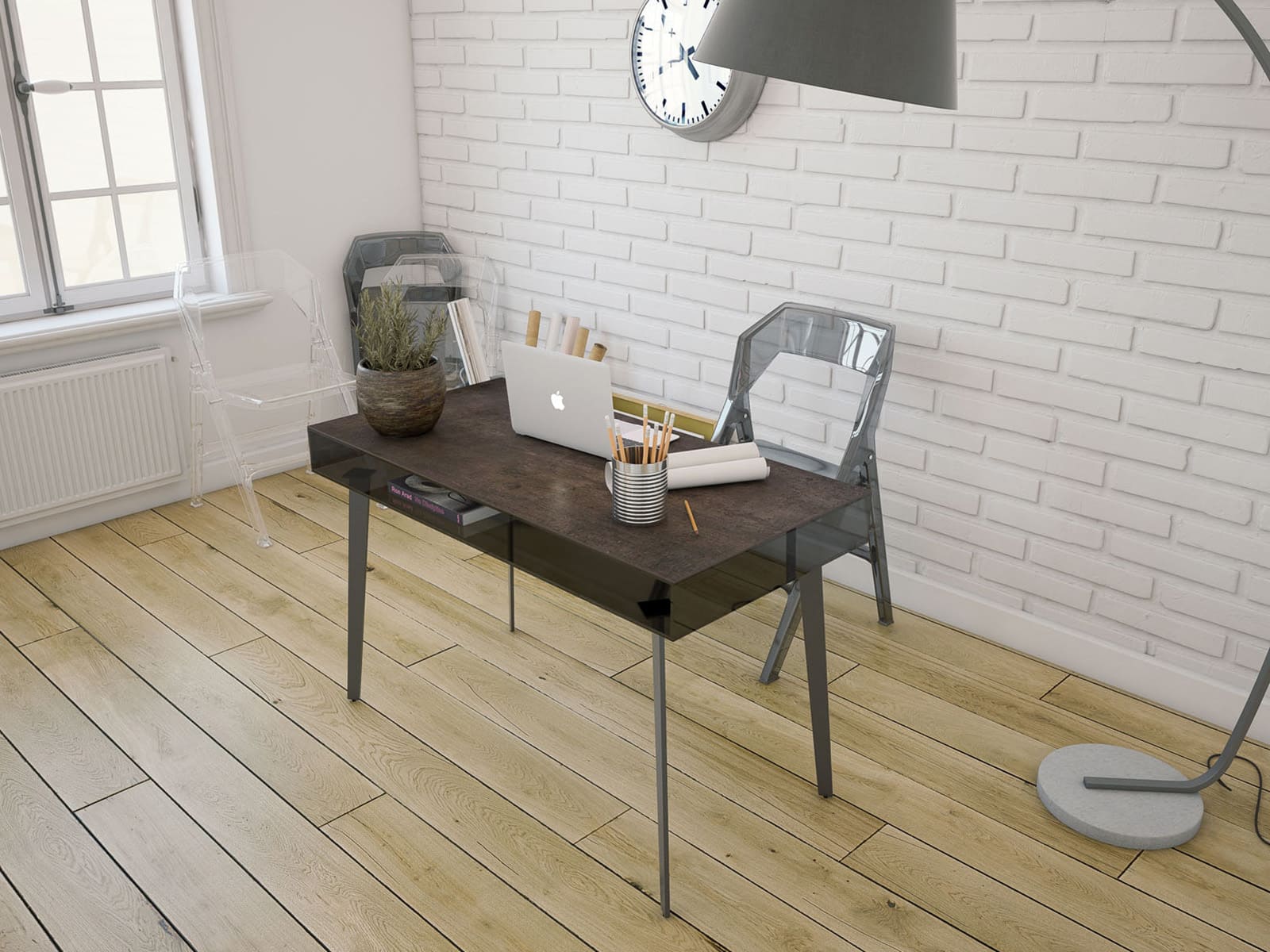 Akante is delighted to present the Boston desk. A smoky grey glass 10mm thick with elegant tapered legs. The legs are made of black lacquered steel onto which the glass plate is fixed. The upper plate is 3mm thick ceramic glued onto 6mm glass. The ceramic finish renders this desk much more resilient to daily usage than its pure glass counterparts. The Boston desk once again shows Akante's mastery of modern elegance and functionality.