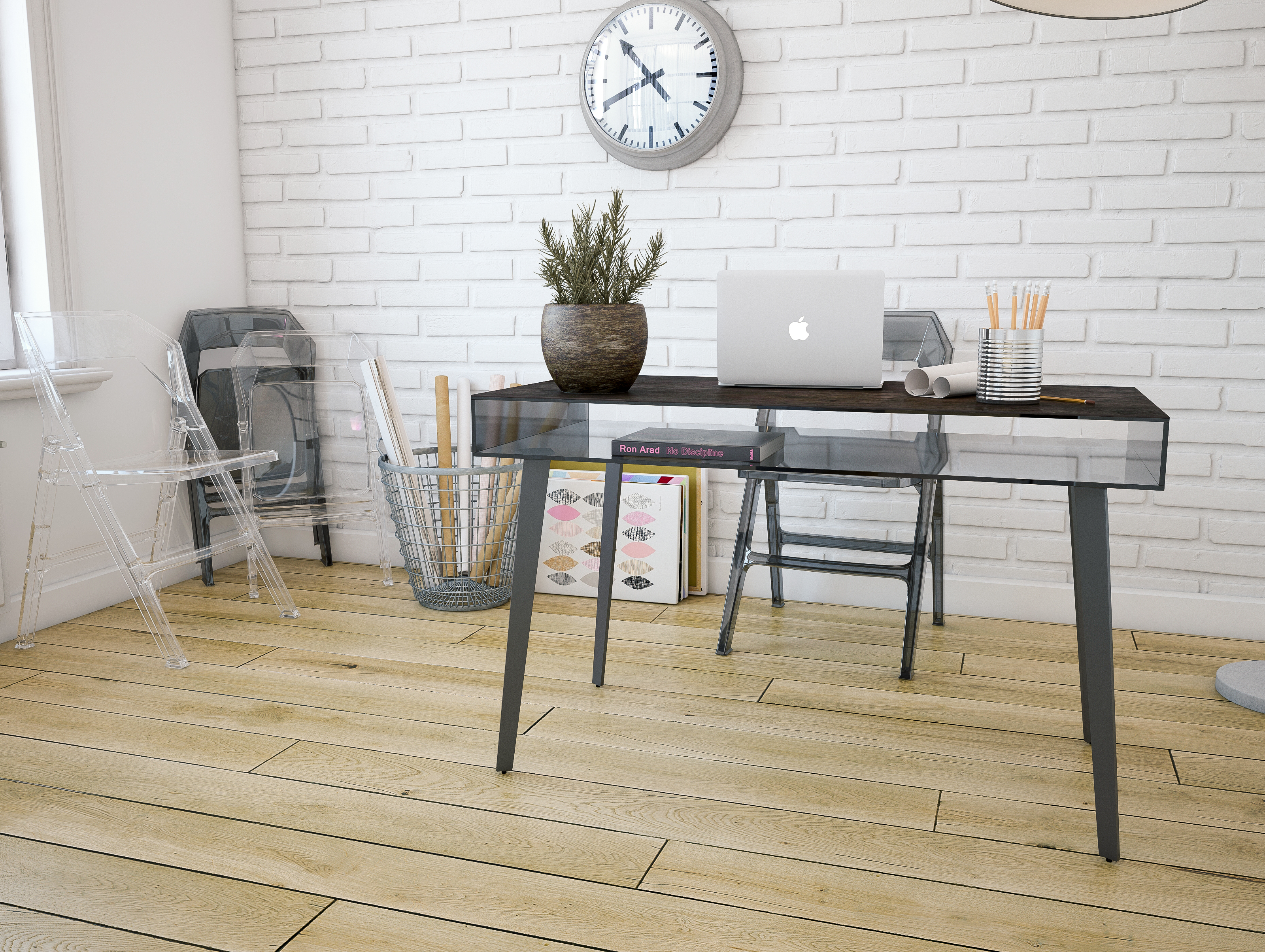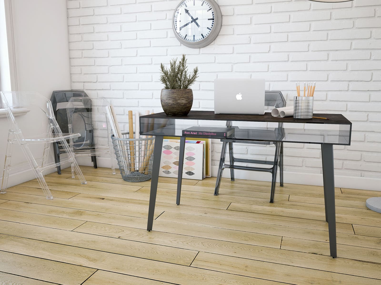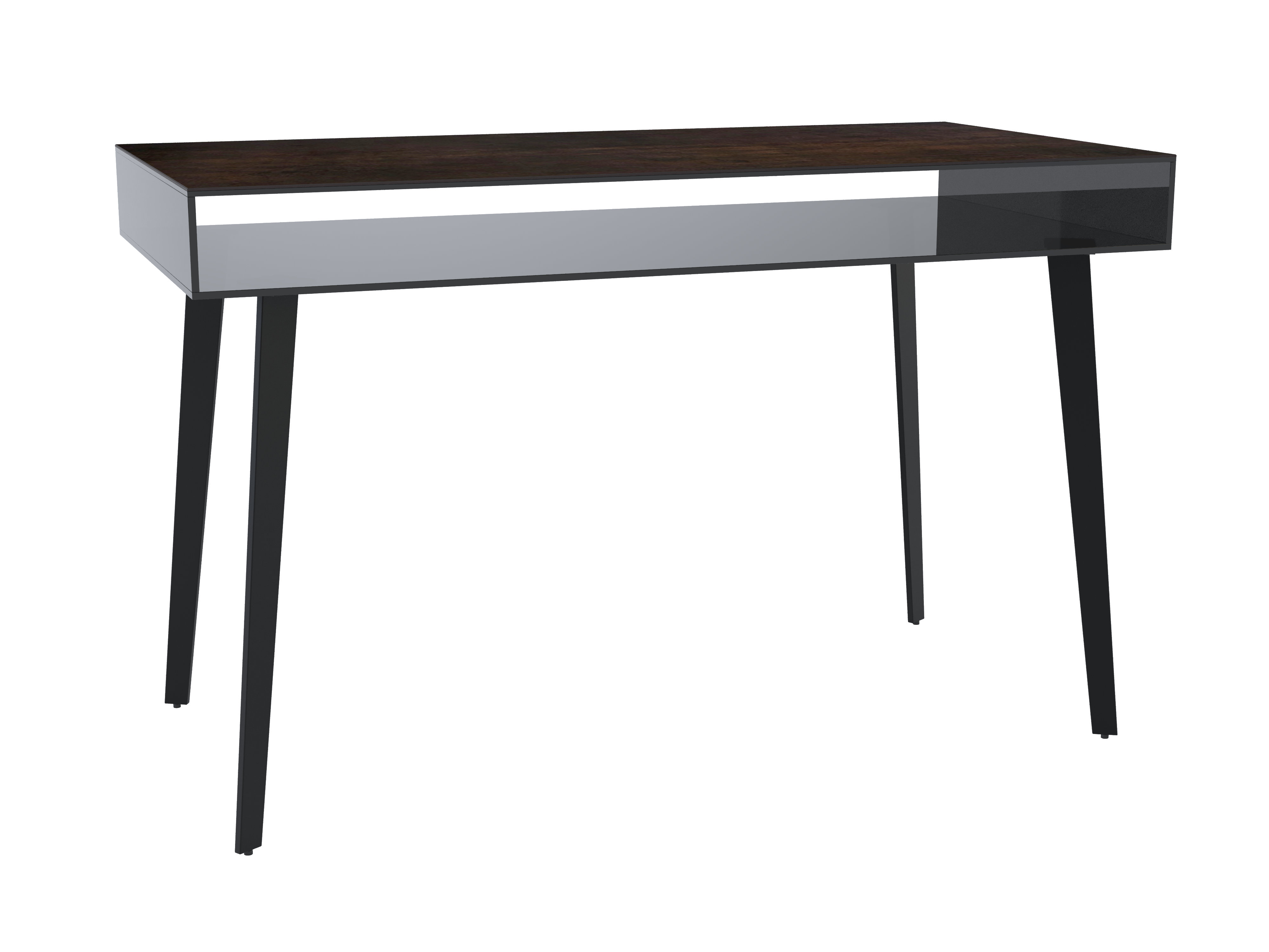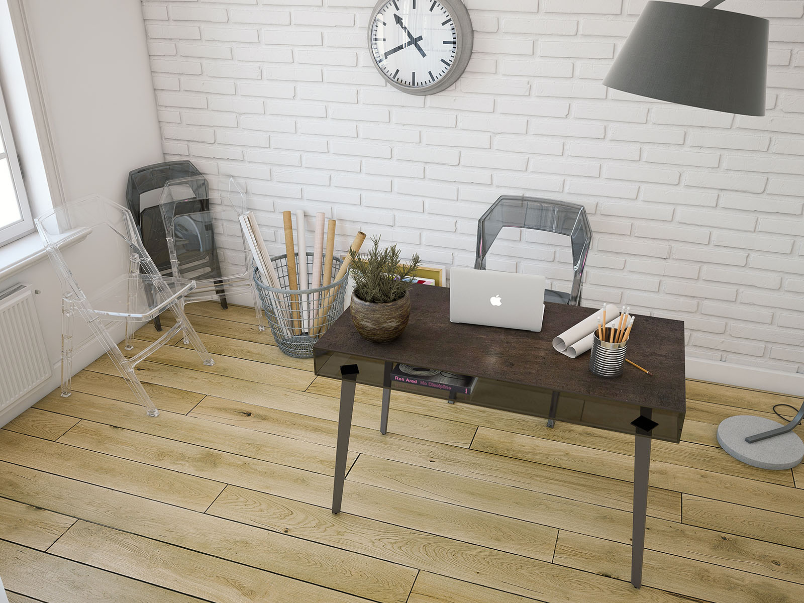 Akante is delighted to present the Boston desk. A smoky grey glass 10mm thick with elegant tapered legs. The legs are made of black lacquered steel onto which the glass plate is fixed. The upper plate is 3mm thick ceramic glued onto 6mm glass. The ceramic finish renders this desk much more resilient to daily usage than its pure glass counterparts. The Boston desk once again shows Akante's mastery of modern elegance and functionality.