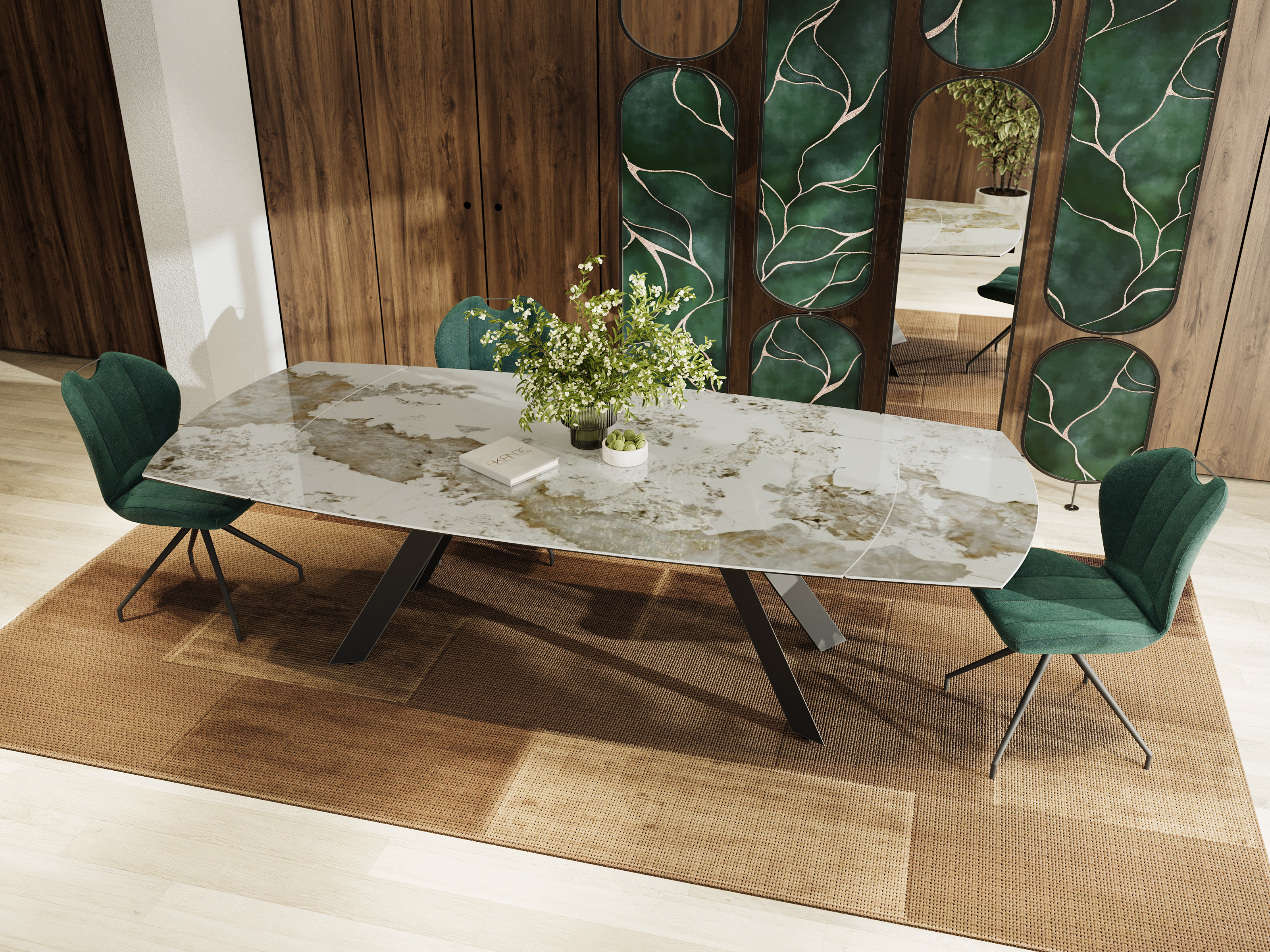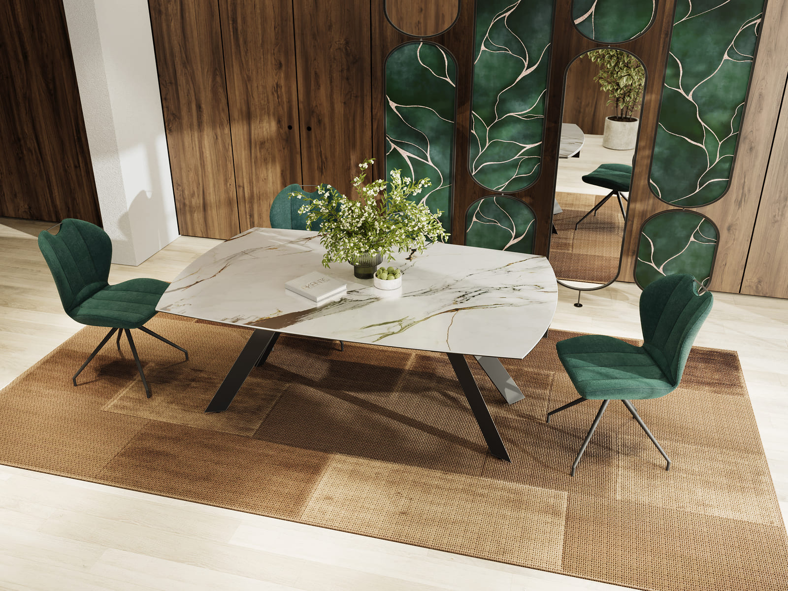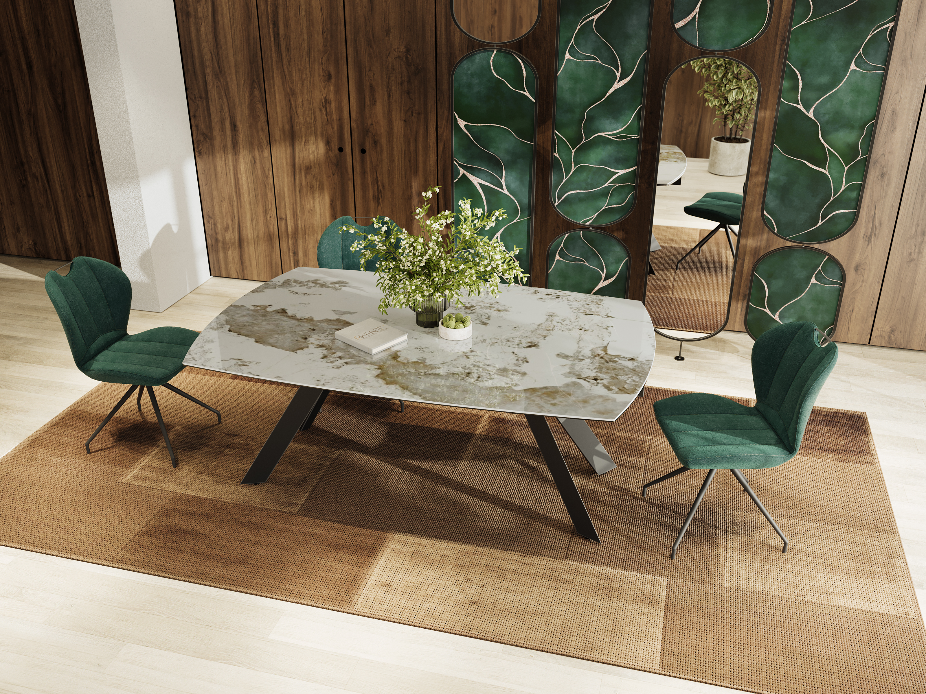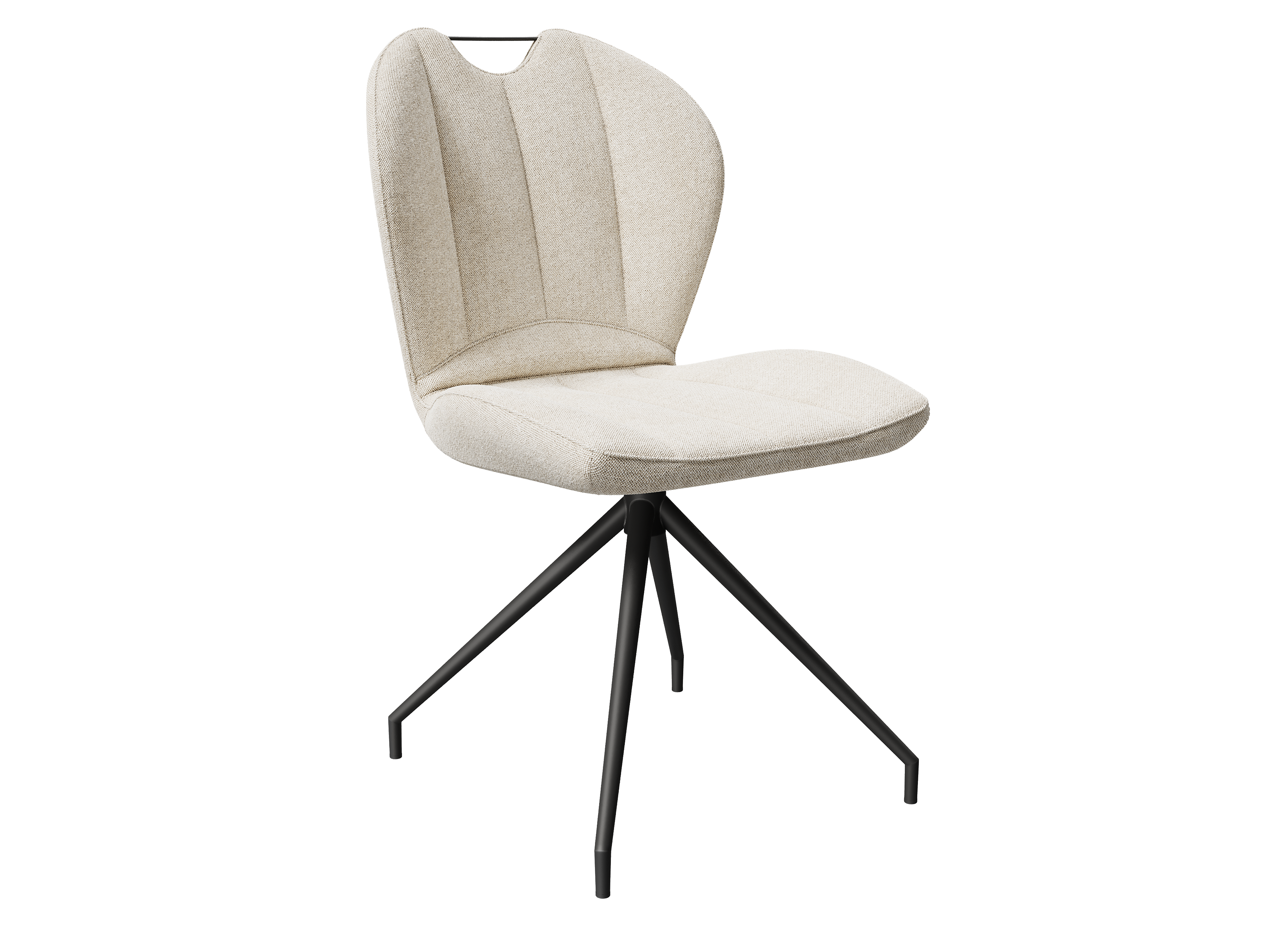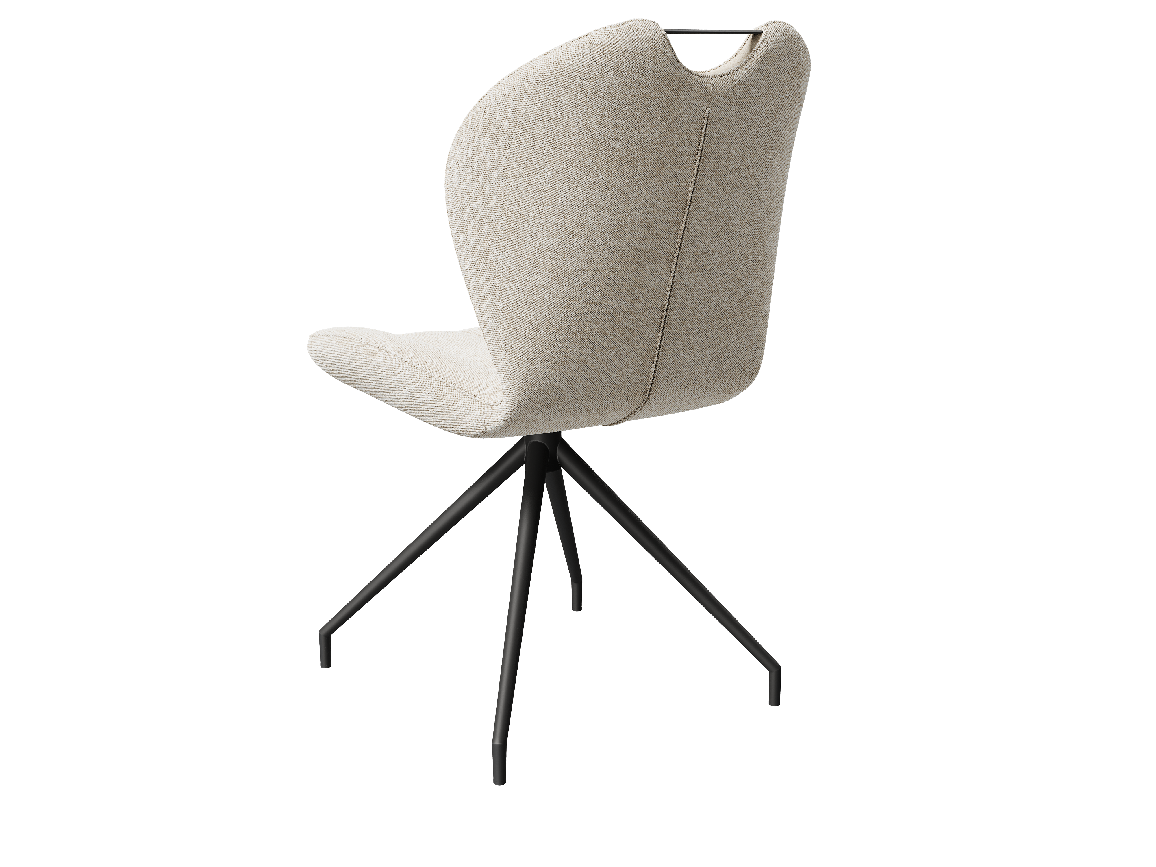 Dimensions and details Net weight : 7 Kg Seat : Pivots 180° Fabric composition : 100% Polyester Colour : Fir green Foam density : 25kg/m3 Seating height : 48 cm Total height : 86 cm Width : 50 cm Martindale : 60 000 Seat material : Fabric Legs : Matt black lacquered steel Maximum supported weight : 120 kg Depth : 63 cm Sold by 2 pieces only Light resistant : 5/5 Pilling resistance : 5/5 Color fastness to rubbing : 5/5 Fabric : OEKO-TEX® Standard 100 NOT AVAILABLE FOR THE UK AND IRISH MARKET. INPI : 20190743