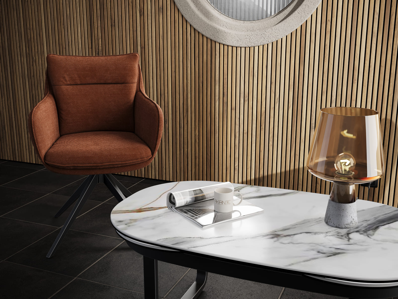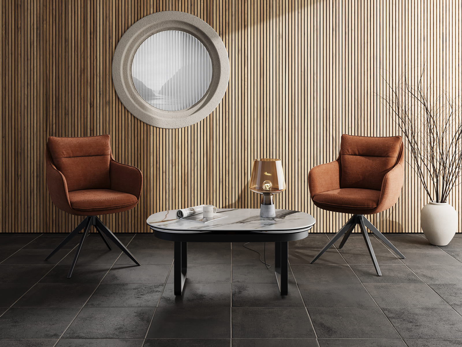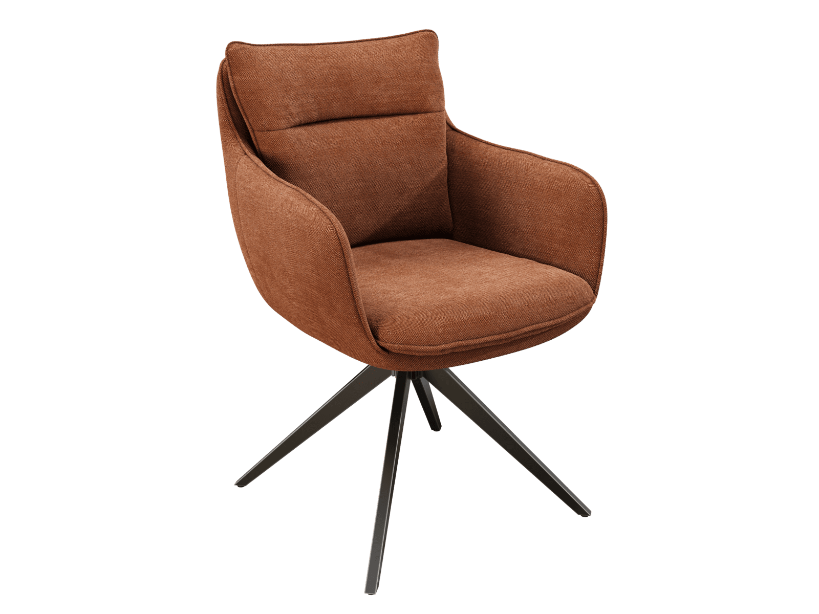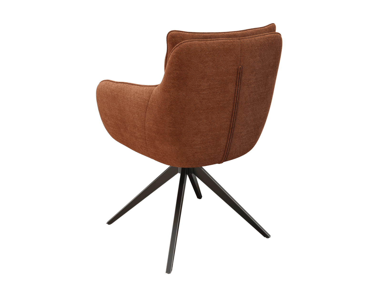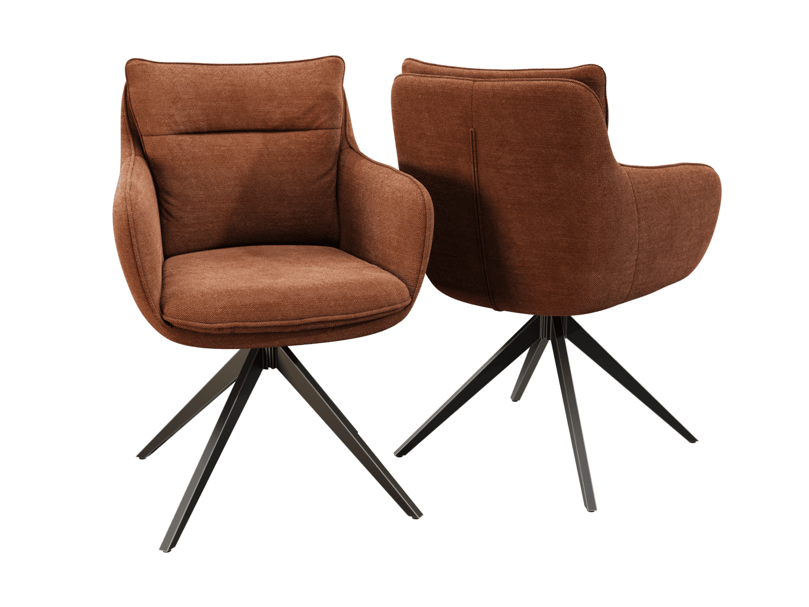 Dimensions and details Net weight : 12 Kg Fabric composition : 100% Polyester Colour : Terracotta Foam density : 38kg/m3 Armrest Height : 62 cm Seating height : 48 cm Total height : 87 cm Width : 60 cm Martindale : 60 000 Seat material : Fabric Legs : Matt black lacquered steel Maximum supported weight : 120 kg Depth : 62 cm Sold by 2 pieces only Light resistant : 5/5 Pilling resistance : 5/5 Color fastness to rubbing : 5/5 Fire resistance : Complies with current European standard EN 1021-1 (cigarette resistance) Fire resistance : Complies with current European standard EN 1021-2 (flame resistance) Fabric : OEKO-TEX® Standard 100 INPI : 20251597