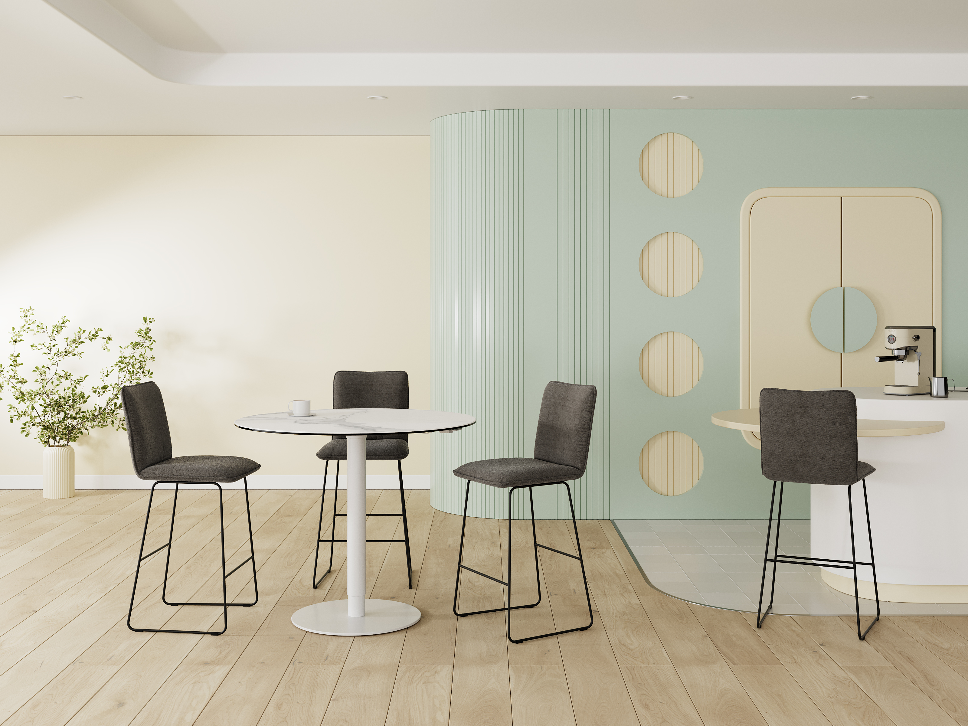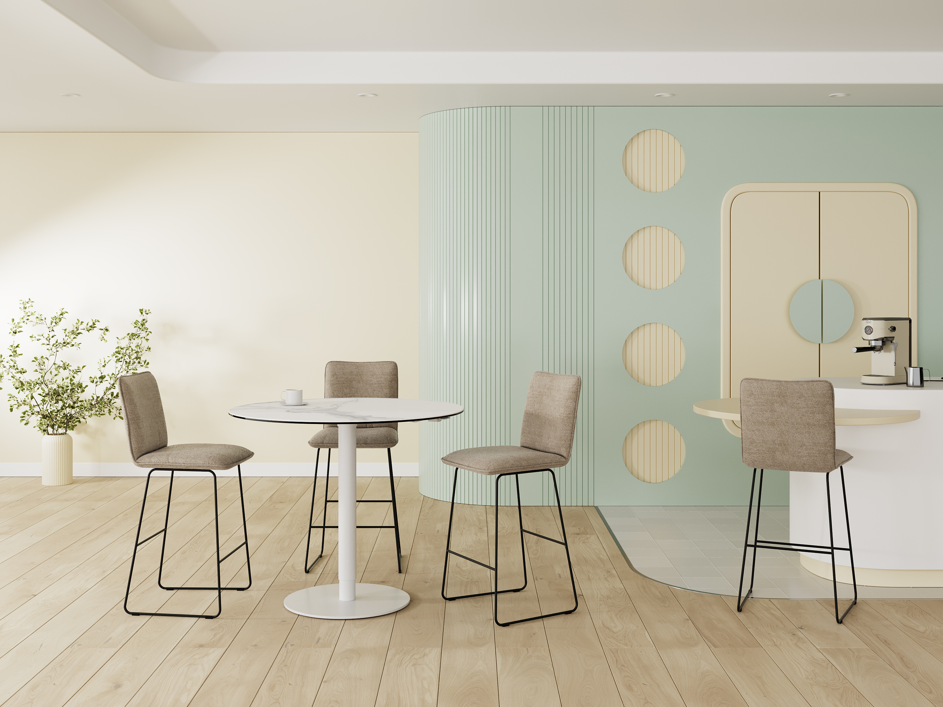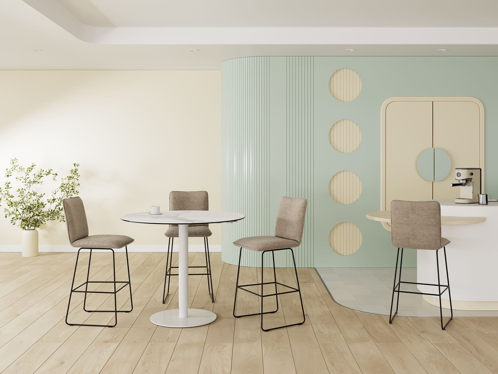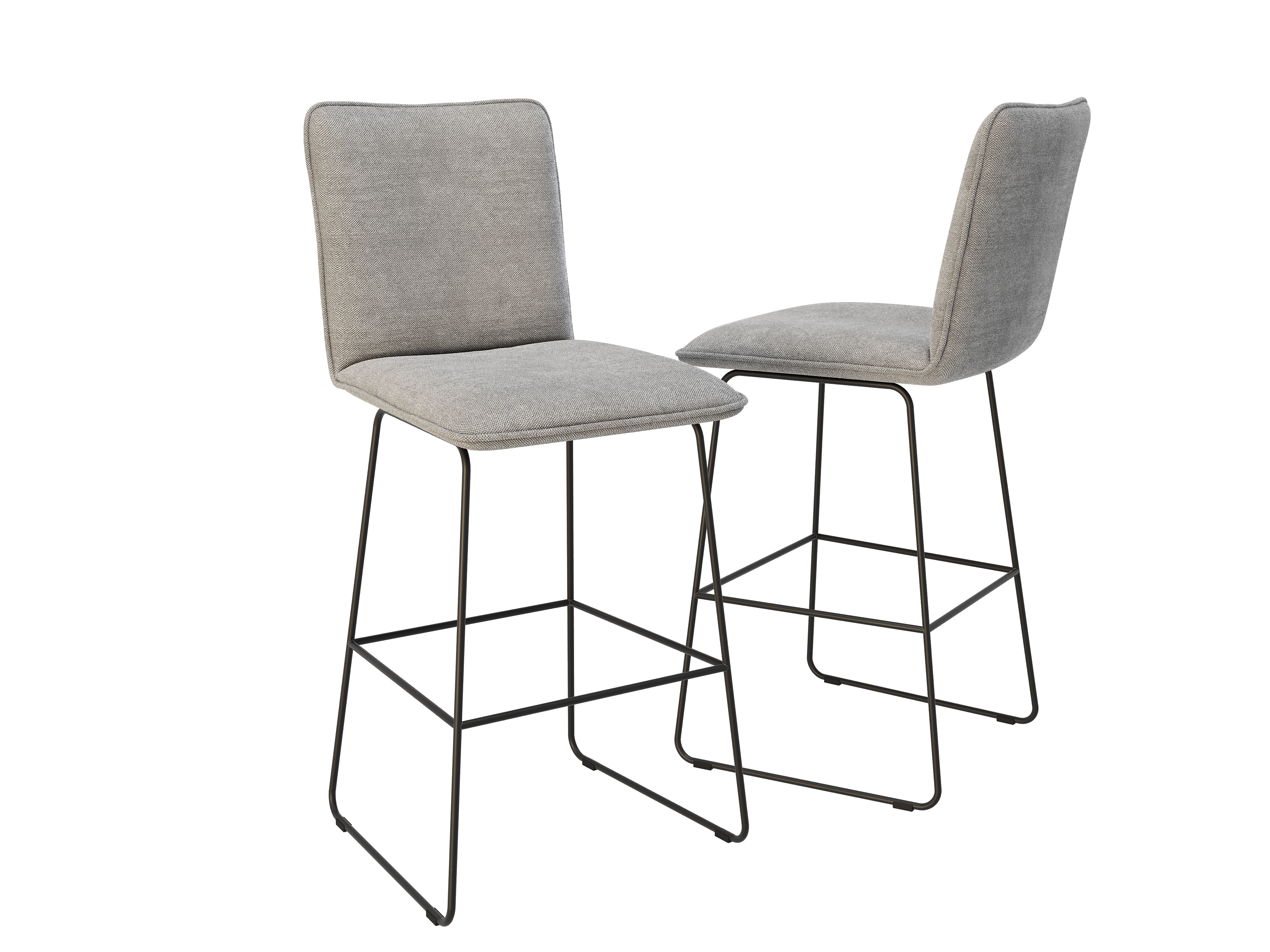Dimensions and details Net weight : 8,5 Kg Seat : Fixed Fabric composition : 100% Polyester Colour : Beige Foam density : 25kg/m3 Height : 98 cm Seating height : 65 cm Width : 38 cm Martindale : 60 000 Legs : Matt black lacquered steel Maximum supported weight : 120 kg Depth : 43 cm Sold by 2 pieces only Light resistant : 5/5 Pilling resistance : 5/5 Color fastness to rubbing : 5/5 Fabric : OEKO-TEX® Standard 100 NOT AVAILABLE FOR THE UK AND IRISH MARKET. INPI : 20244788