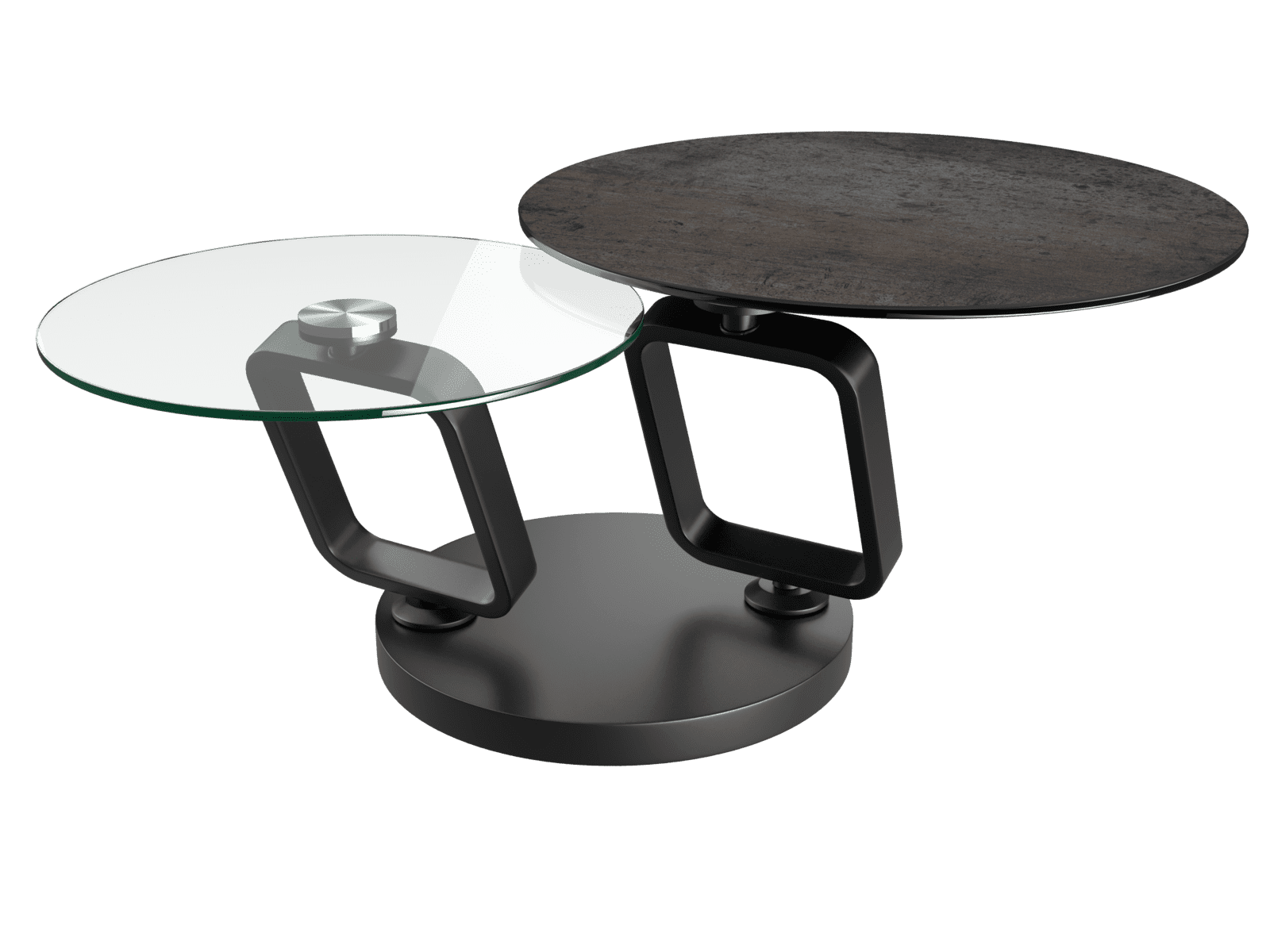 Akante is proud to present the Ozone coffee table. The original and stylish base it was built with is a sight for sore eyes. The top plate is made of a 3 mm thick ceramic plate glued upon a 6 mm glass pane. The bottom plate is made of 10 mm thick tempered glass. The double plate system makes it both easy and trendy due to the elegant design and the synchronised mechanism. The plates can rotate to reach a length of 130 cm. The rectangular frame and the base are made of matt black lacquered steel. It is the ideal coffee table if you are looking to make your living room more stylish.