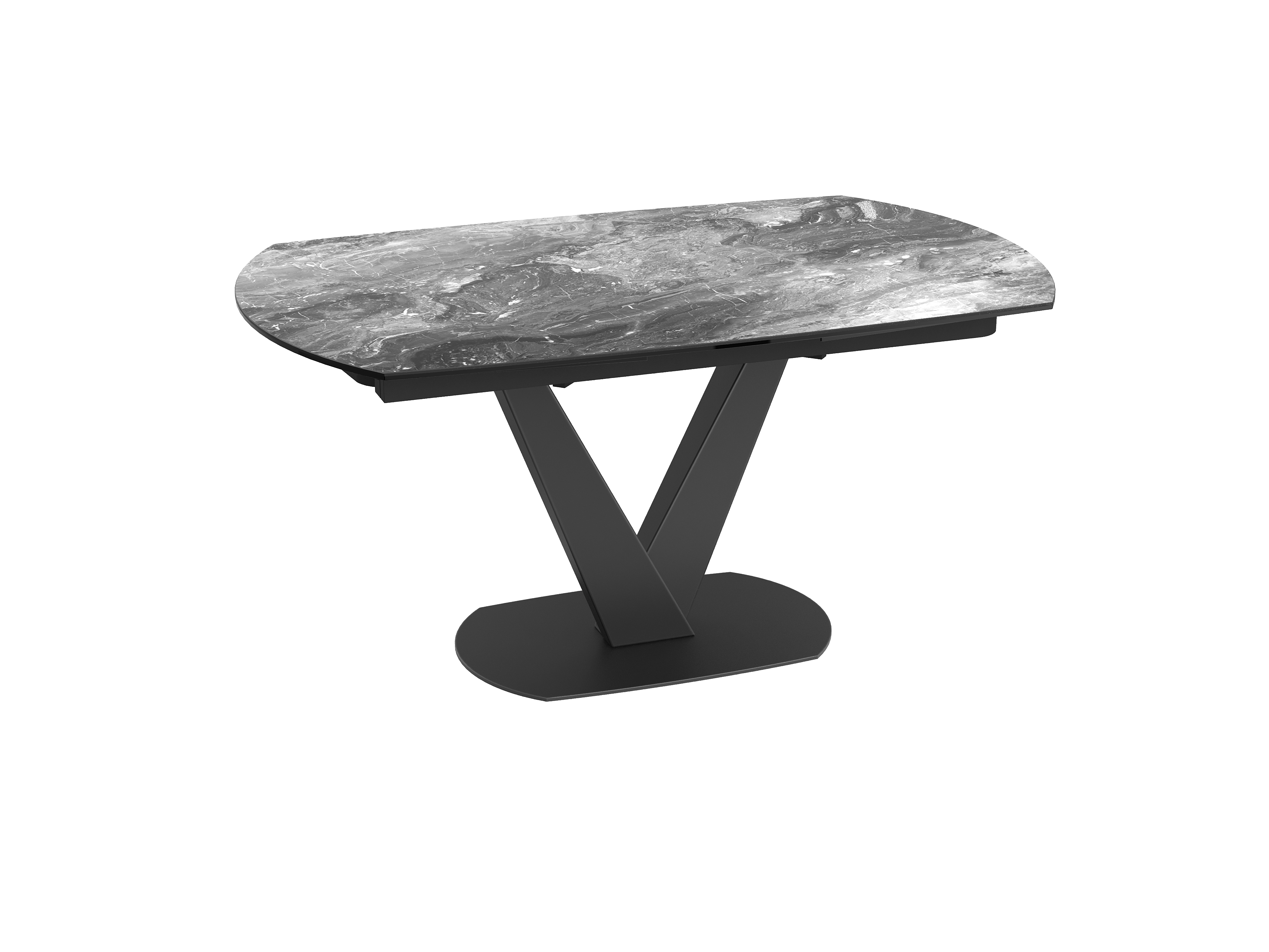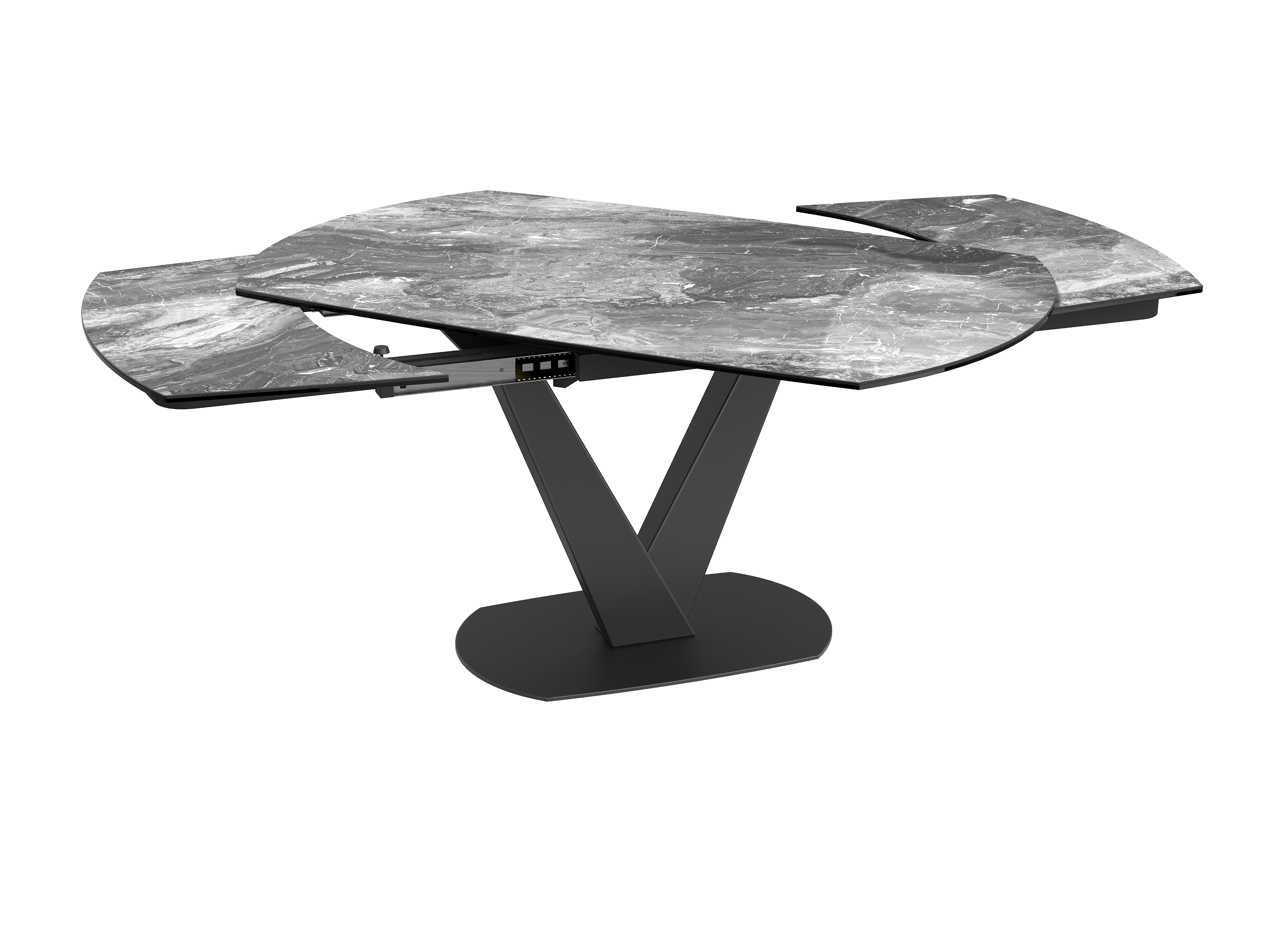 Dimensions and details Net weight : 164,8 Kg Colour : Travertine Dimensions : 160 x 100 x 76 cm Dimensions opened : 240 x 100 x 76 cm Height : 76 cm Width : 100 cm Length : 160 cm Synchronised mechanism Number of seats : 8 to 10 people Legs : Matt black lacquered steel Plate : 3 mm thick ceramic glued upon a 8 mm glass pane INPI : 20215513