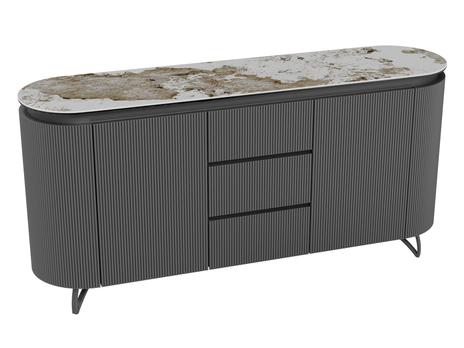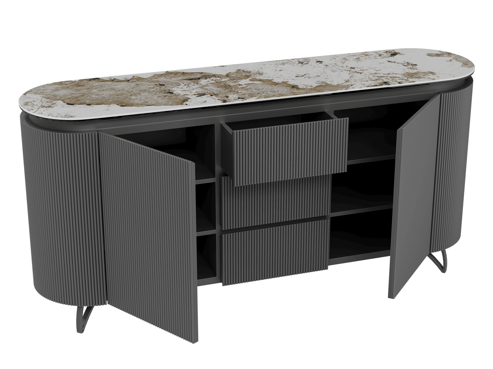 NOT AVAILABLE FOR THE UK AND IRISH MARKET. The COLUMBUS sideboard combines the warmth of wood with the elegance of ceramic for a refined and functional style. Its fluted MDF veneered doors add a contemporary graphic touch. With spacious storage including shelves and drawers, it is both practical and stylish. The ceramic top, available in ten finishes, blends seamlessly into any interior. Offered in two sizes (130 or 170 cm), the COLUMBUS sideboard perfectly balances modernity and authenticity.
