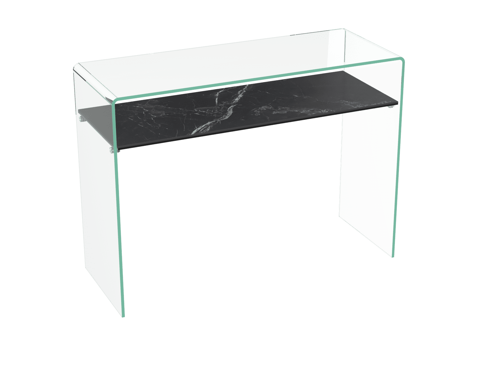 Dimensions and details Net weight : 33,5 Kg Colour : Crystal Colour : Marble marquina Dimensions : 103 x 39 x 75 cm Thickness of glass : 10 mm Height : 75 cm Width : 39 cm Length : 103 cm Bottom plate : 6 mm thick ceramic glued upon a 6 mm glass pane Hot bent crystal glass, 12 mm
