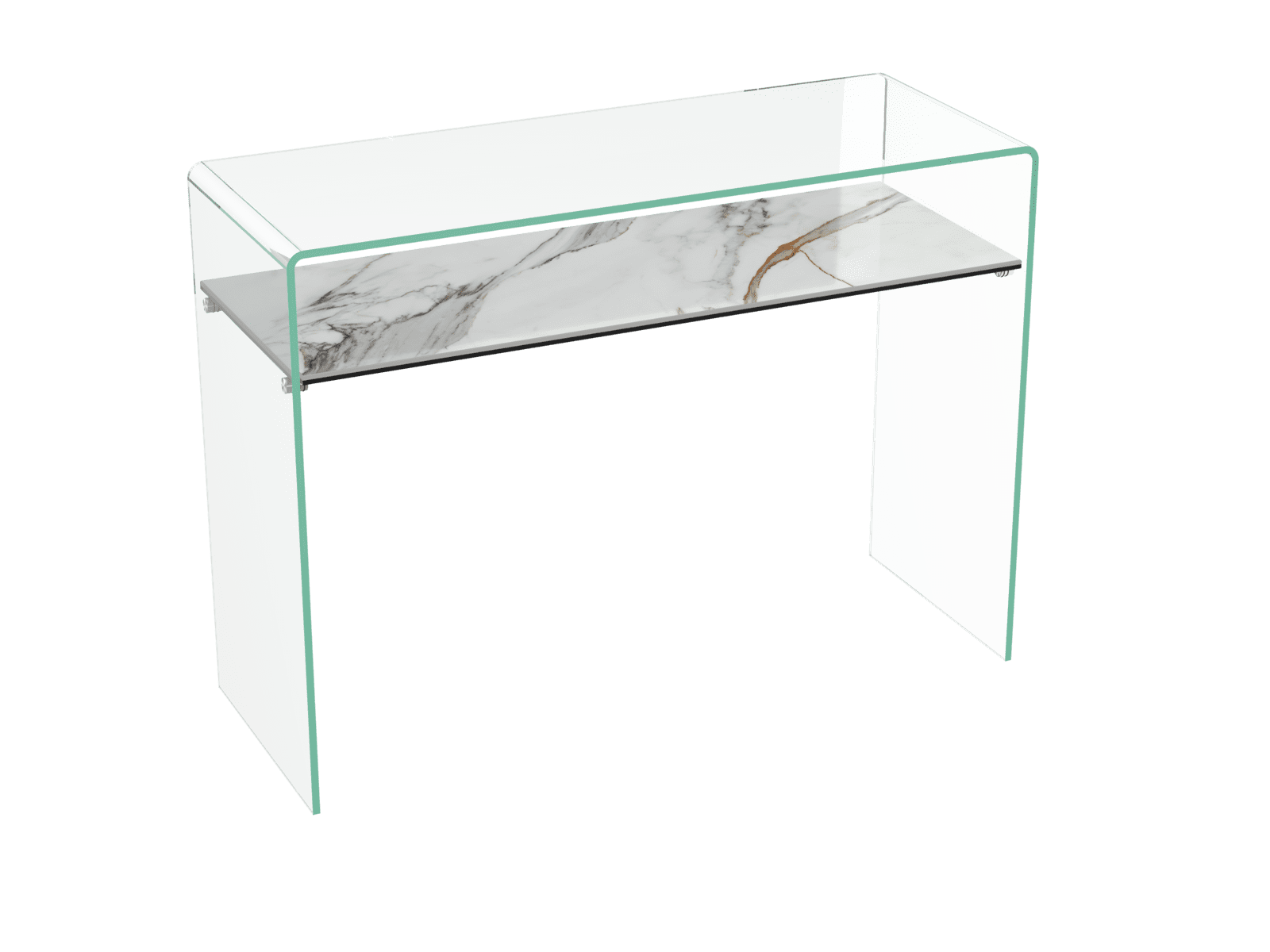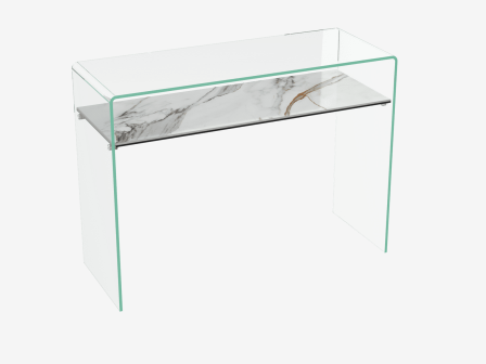 Dimensions and details Net weight : 33,5 Kg Colour : Crystal Colour : Marble fiorentino Dimensions : 103 x 39 x 75 cm Thickness of glass : 10 mm Height : 75 cm Width : 39 cm Length : 103 cm Bottom plate : 6 mm thick ceramic glued upon a 6 mm glass pane Hot bent crystal glass, 12 mm