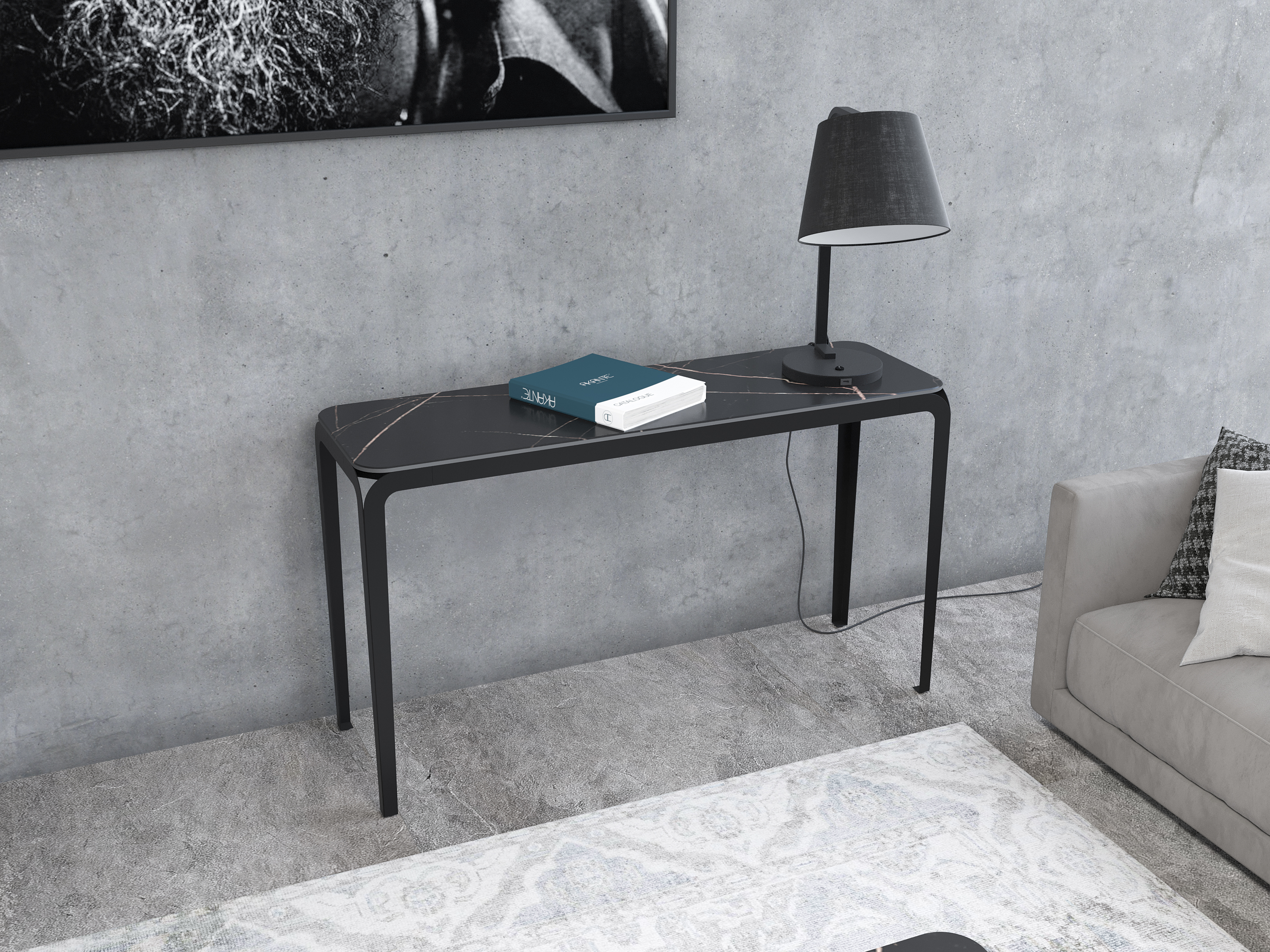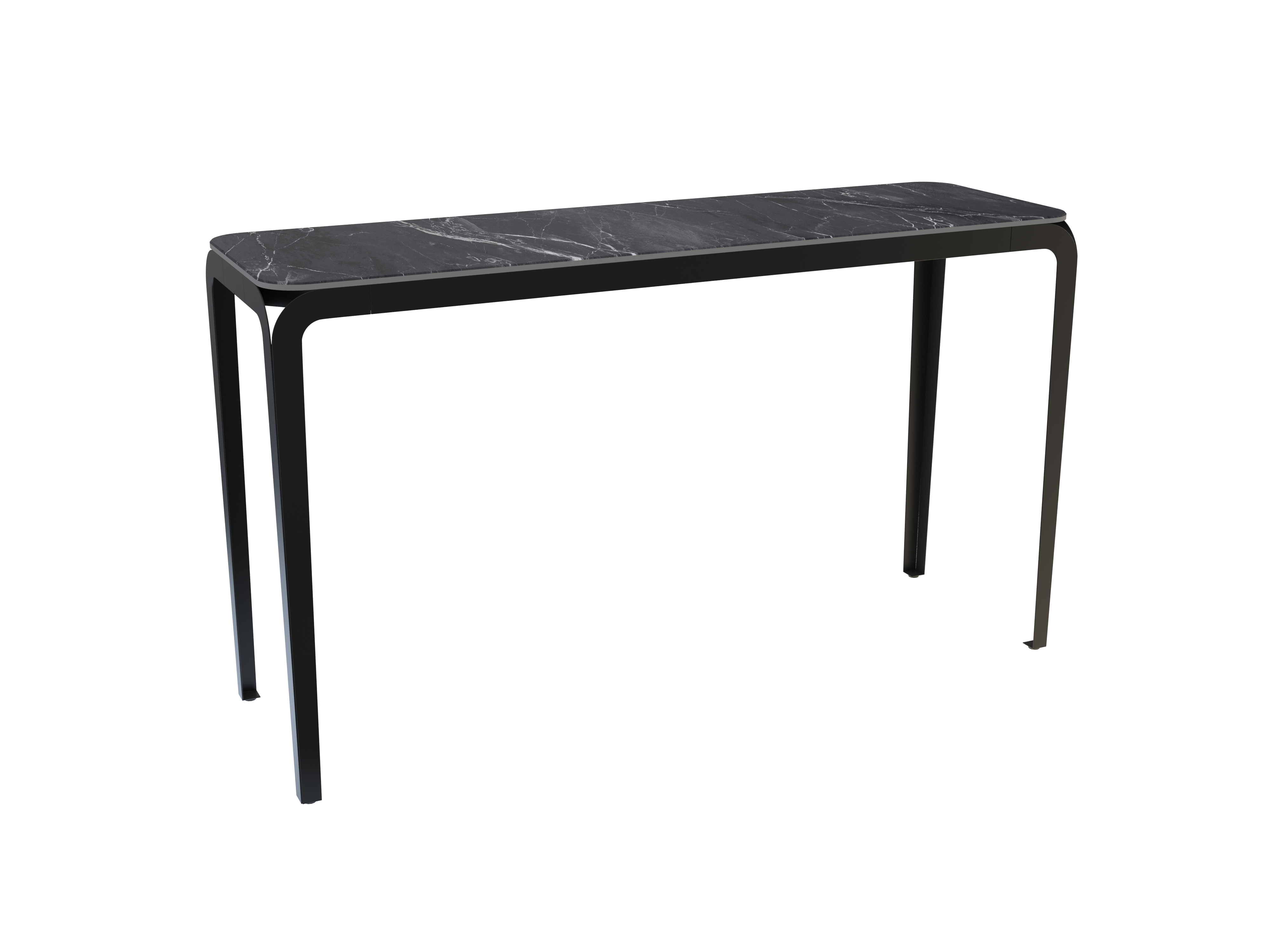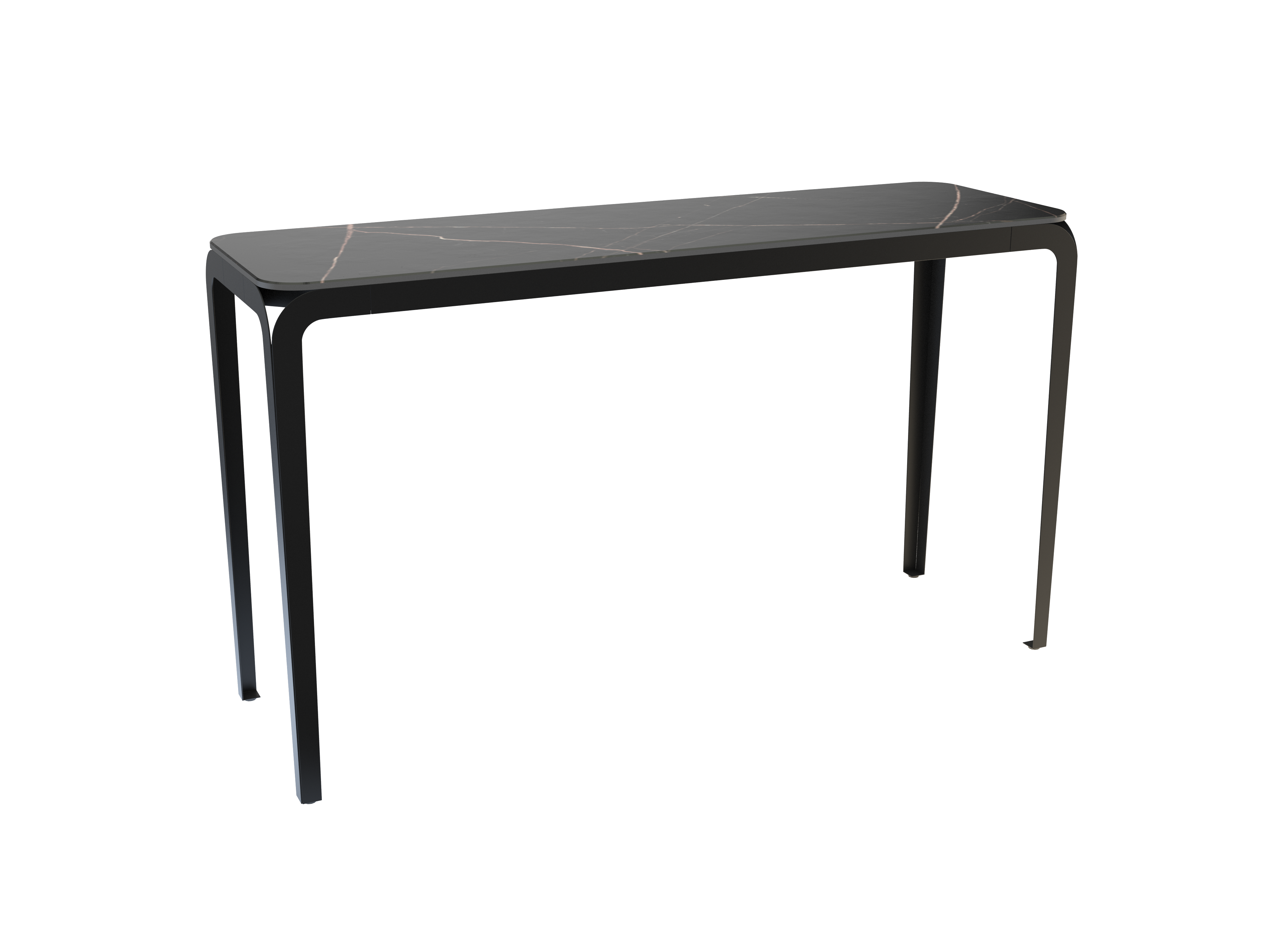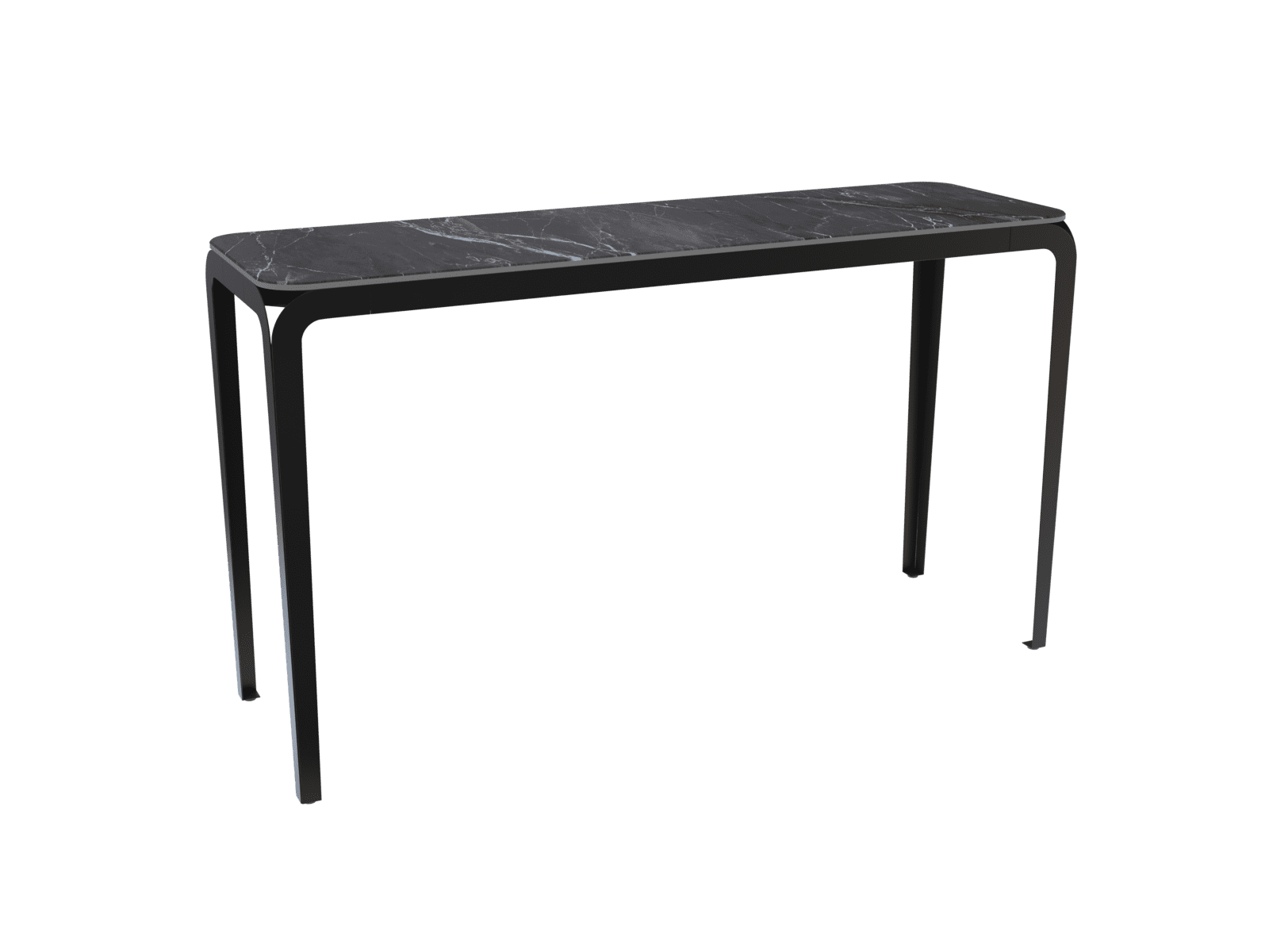 Dimensions and details Net weight : 19 Kg Colour : Marble marquina Dimensions : 120 x 35 x 75 cm Height : 75 cm Width : 35 cm Length : 120 cm Legs : Matt black lacquered steel Plate : 6 mm thick ceramic glued upon a 6 mm glass pane INPI : 20205317