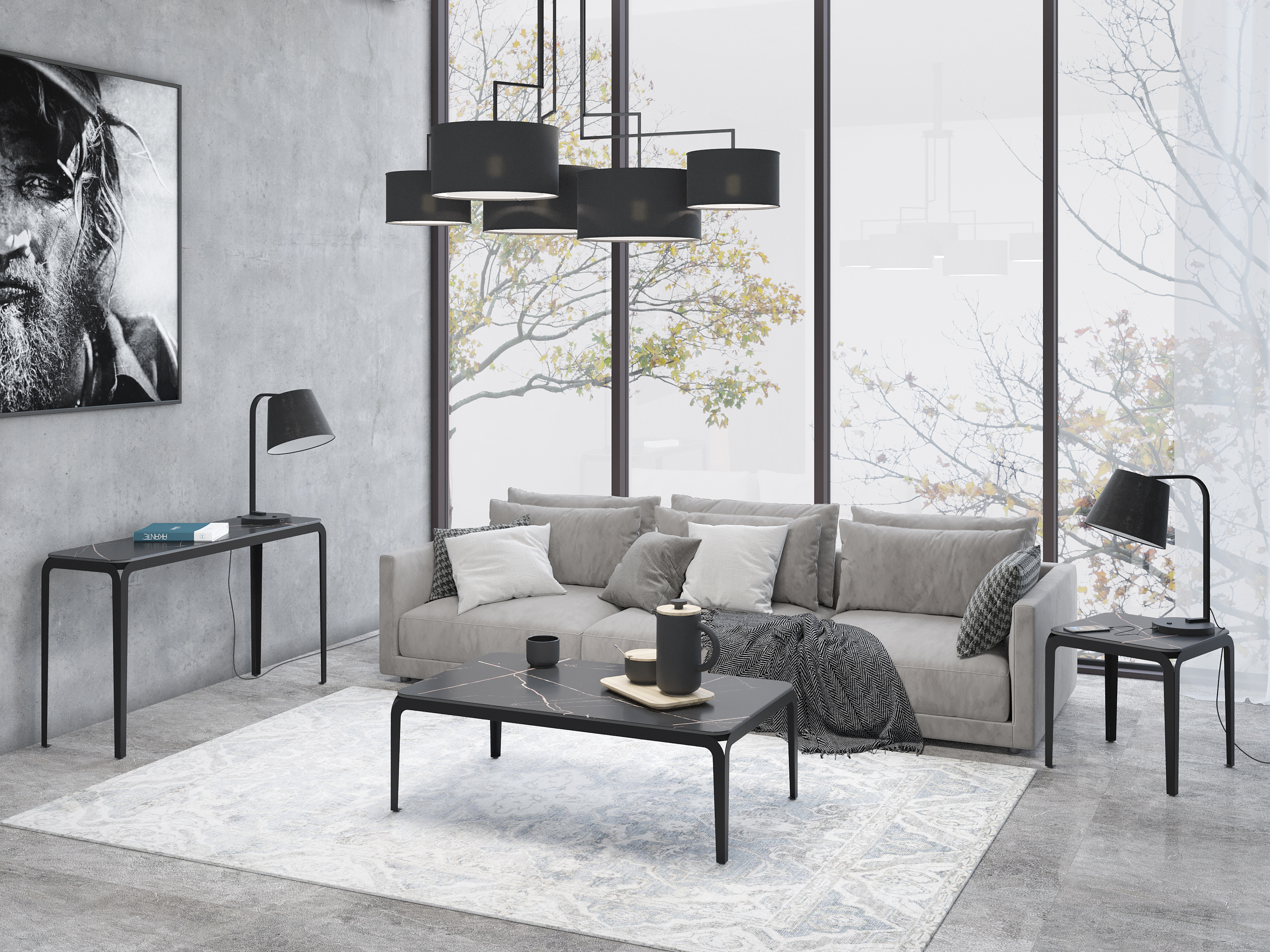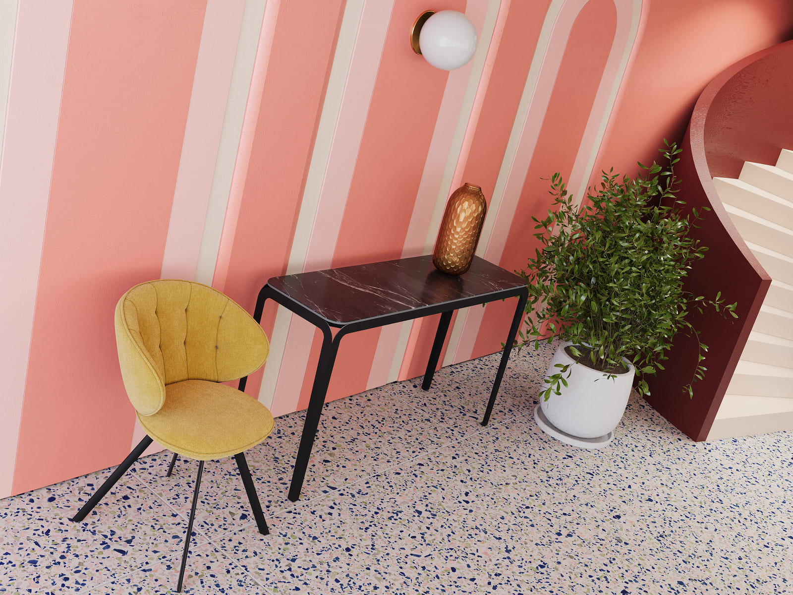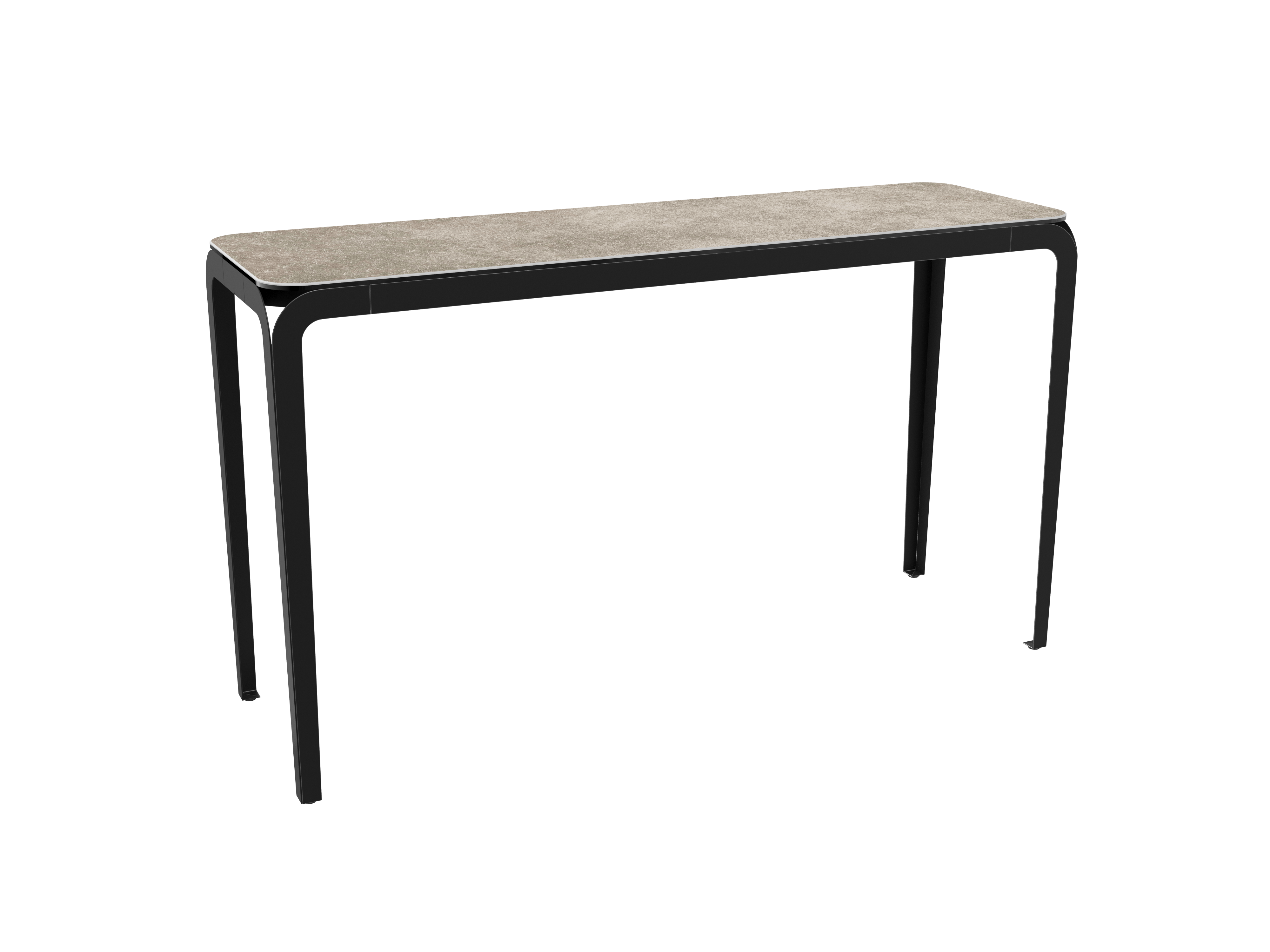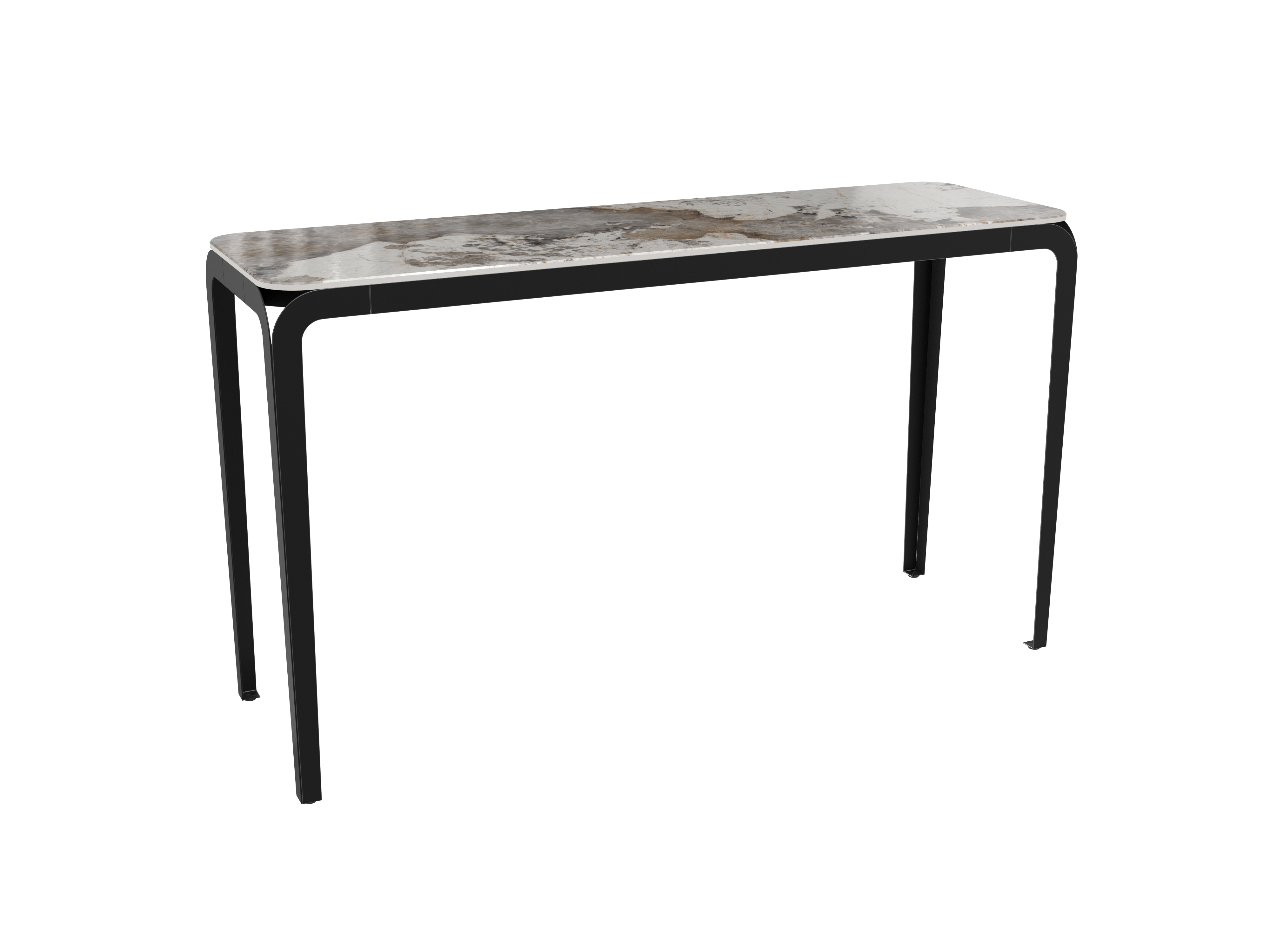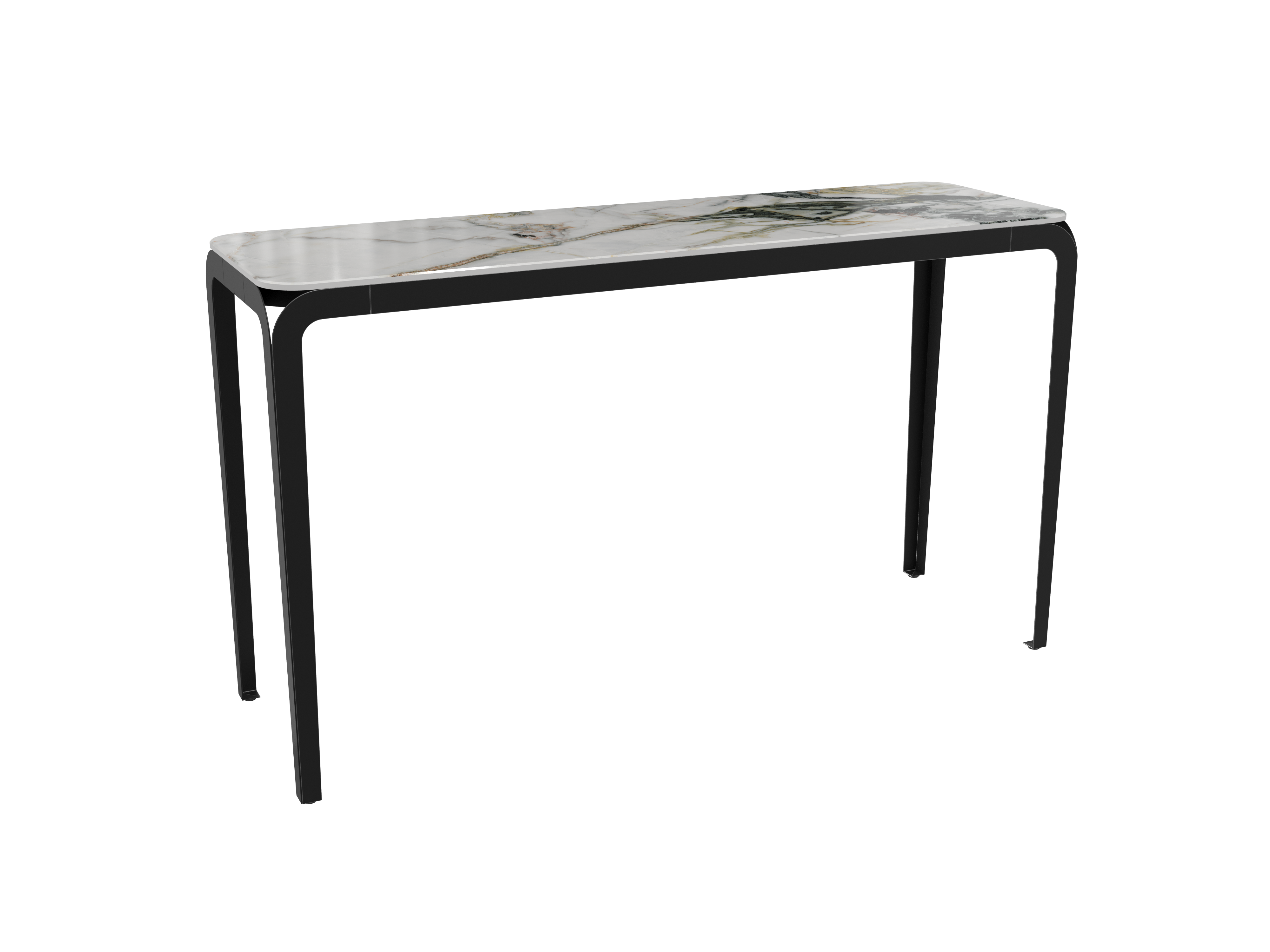 Dimensions and details Net weight : 19 Kg Colour : Marble marquina Dimensions : 120 x 35 x 75 cm Height : 75 cm Width : 35 cm Length : 120 cm Legs : Matt black lacquered steel Plate : 6 mm thick ceramic glued upon a 6 mm glass pane INPI : 20205317