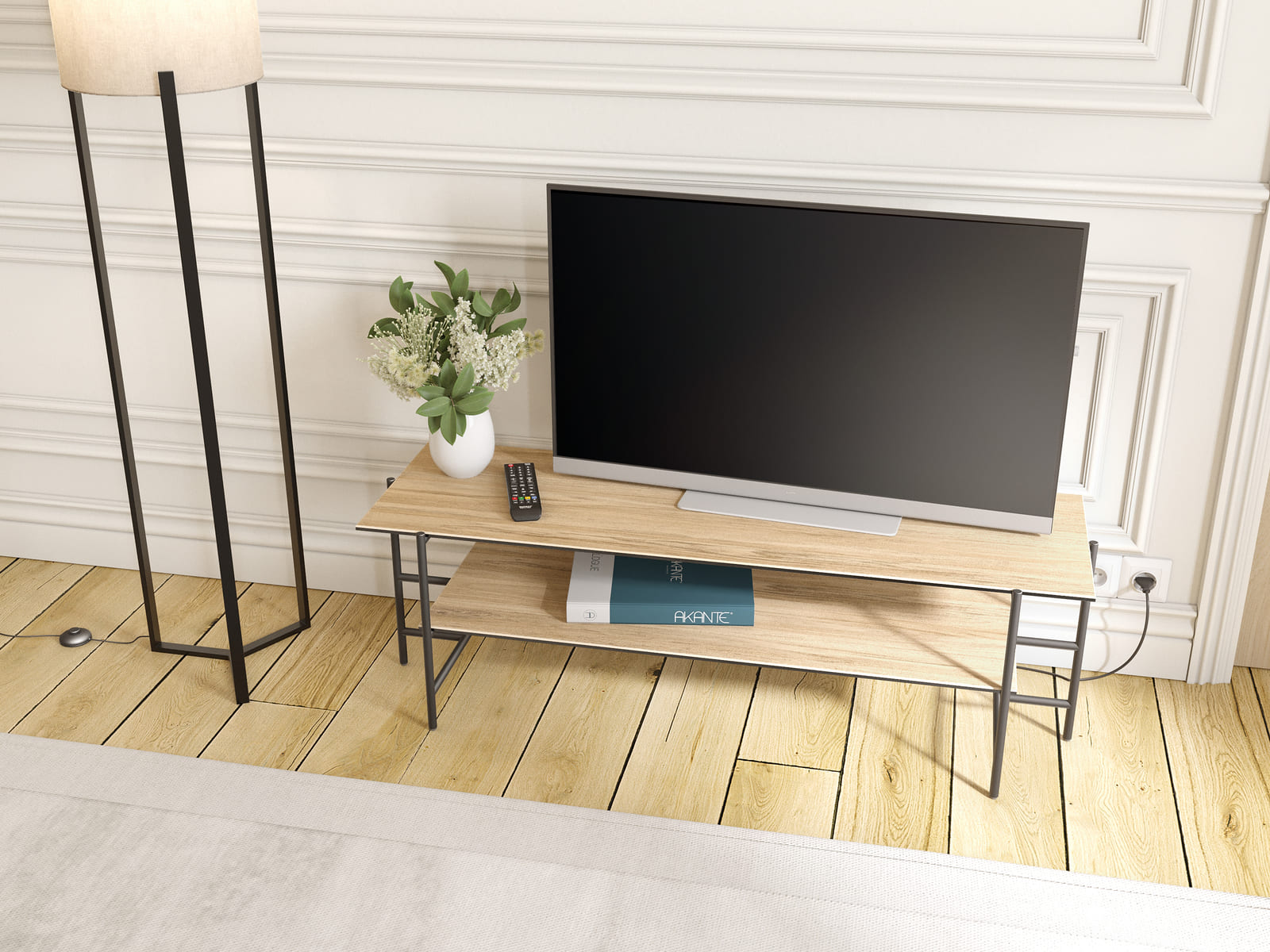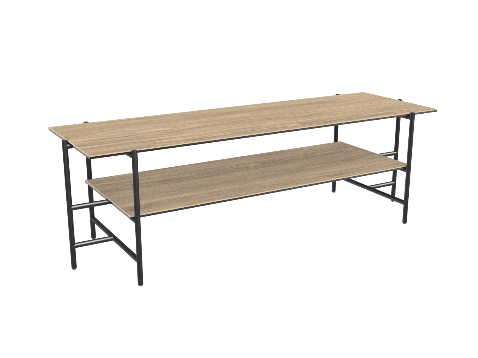 Dimensions and details Net weight : 22,5 Kg Colour : Clear oak Dimensions : 123 x 41 x 38 cm Height : 38 cm Width : 41 cm Length : 123 cm Legs : Matt black lacquered steel Plates : 3 mm thick ceramic glued upon a 6 mm glass pane Frame : Black lacquered steel INPI : 20231433