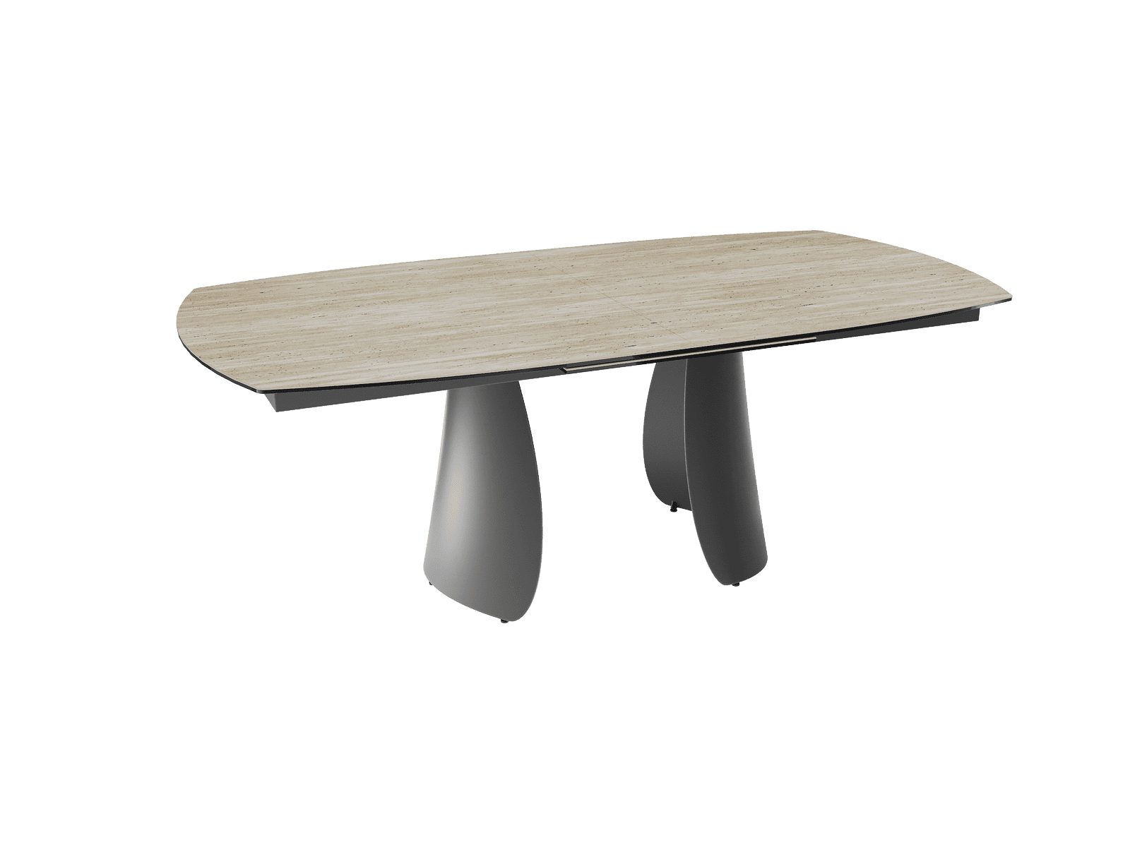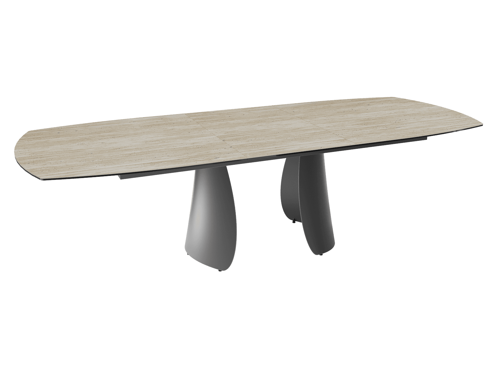 Dimensiones y detalles Peso neto : 136 Kg Color : Travertino Dimensiones : 200 x 100 x 76 cm Dimensiones abiertas : 260 x 100 x 76 cm Altura : 76 cm Ancho : 100 cm Largo : 200 cm Base : Acero lacado negro mate Superficie : Cerámica de 3 mm pegada sobre vidrio de 8 mm