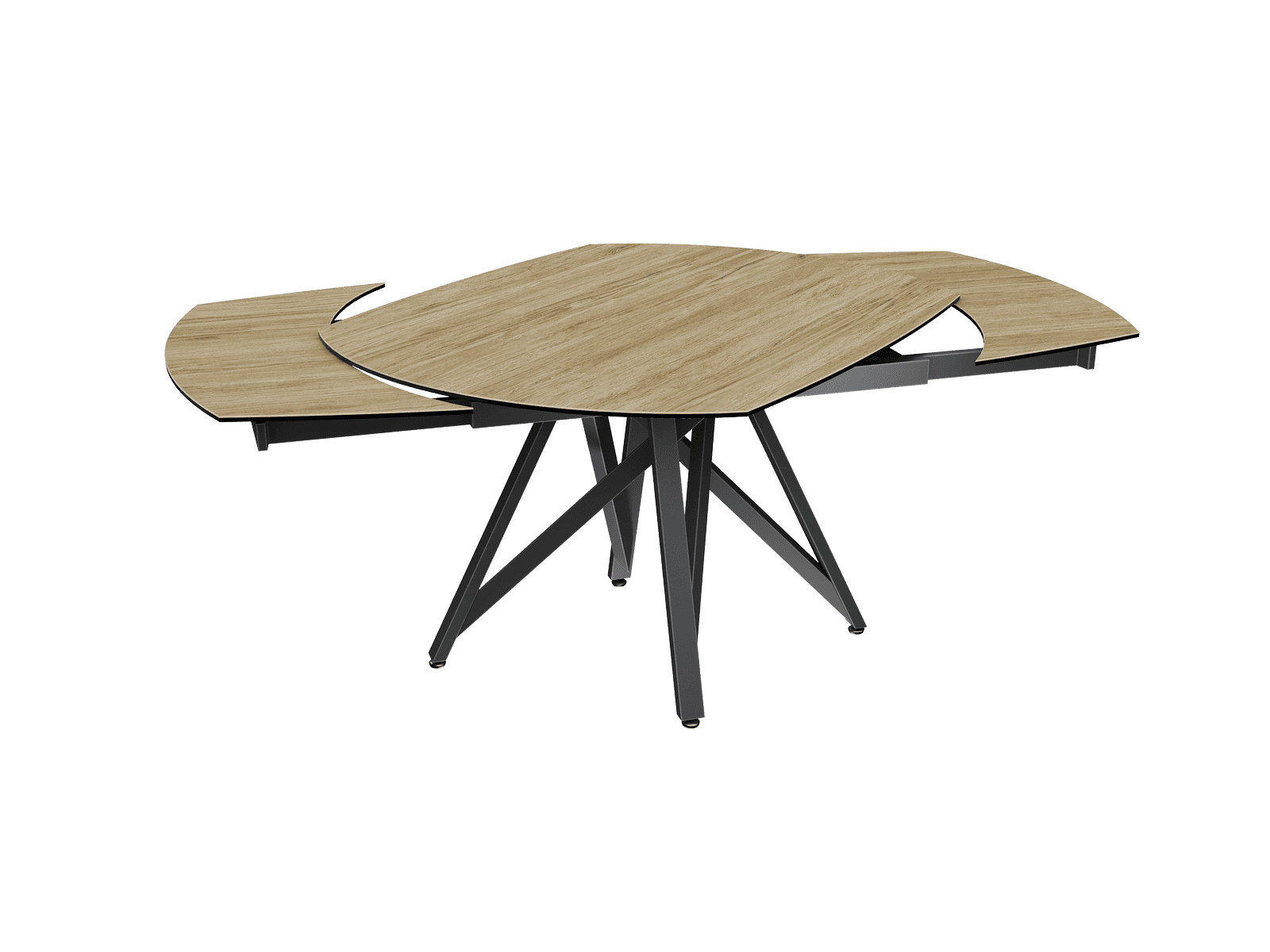 Dimensiones y detalles Peso neto : 103,7 Kg Color : Roble claro Dimensiones : 130 x 100 x 76 cm Dimensiones abiertas : 190 x 100 x 76 cm Altura : 76 cm Ancho : 100 cm Largo : 130 cm Mecanismo sincronizado Número de comensales : 6-8 personas Base : Acero lacado negro mate Superficie : Cerámica de 3 mm pegada sobre vidrio de 8 mm