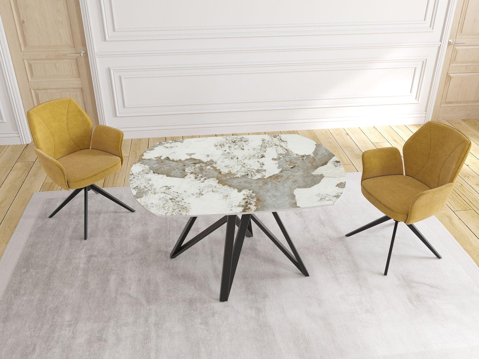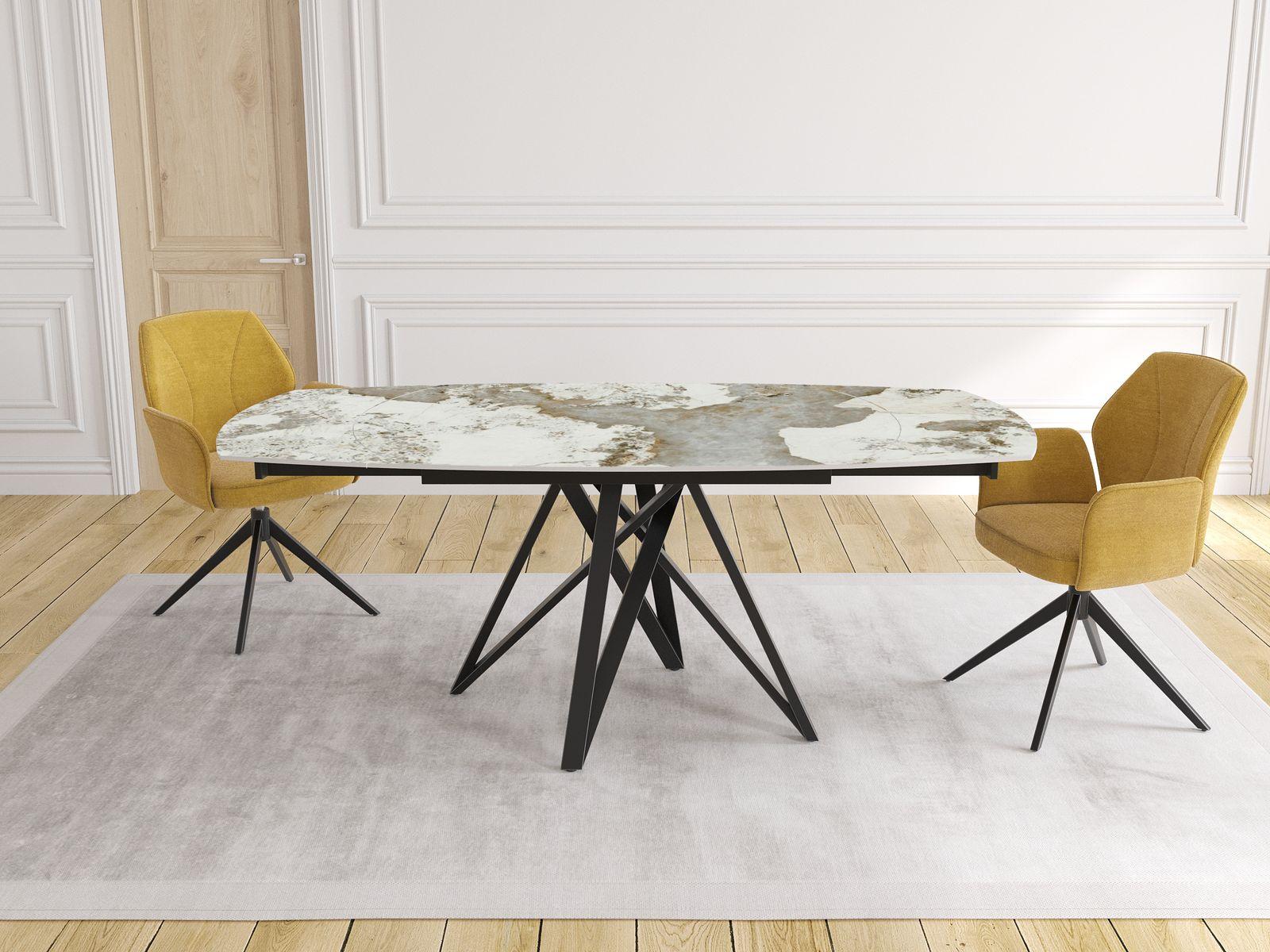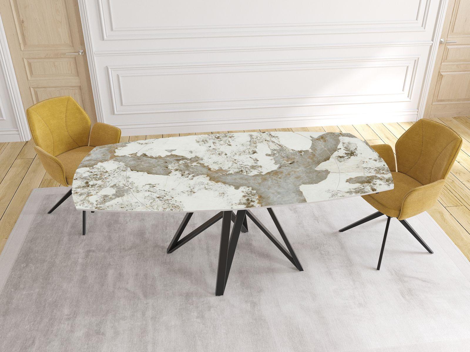 Dimensiones y detalles Peso neto : 103 Kg Color : Mármol Calcatta Dimensiones : 130 x 100 x 76 cm Dimensiones abiertas : 190 x 100 x 76 cm Altura : 76 cm Ancho : 100 cm Largo : 130 cm Mecanismo sincronizado Número de comensales : 6-8 personas Base : Acero lacado negro mate Superficie : Cerámica de 6 mm pegada sobre vidrio de 6 mm