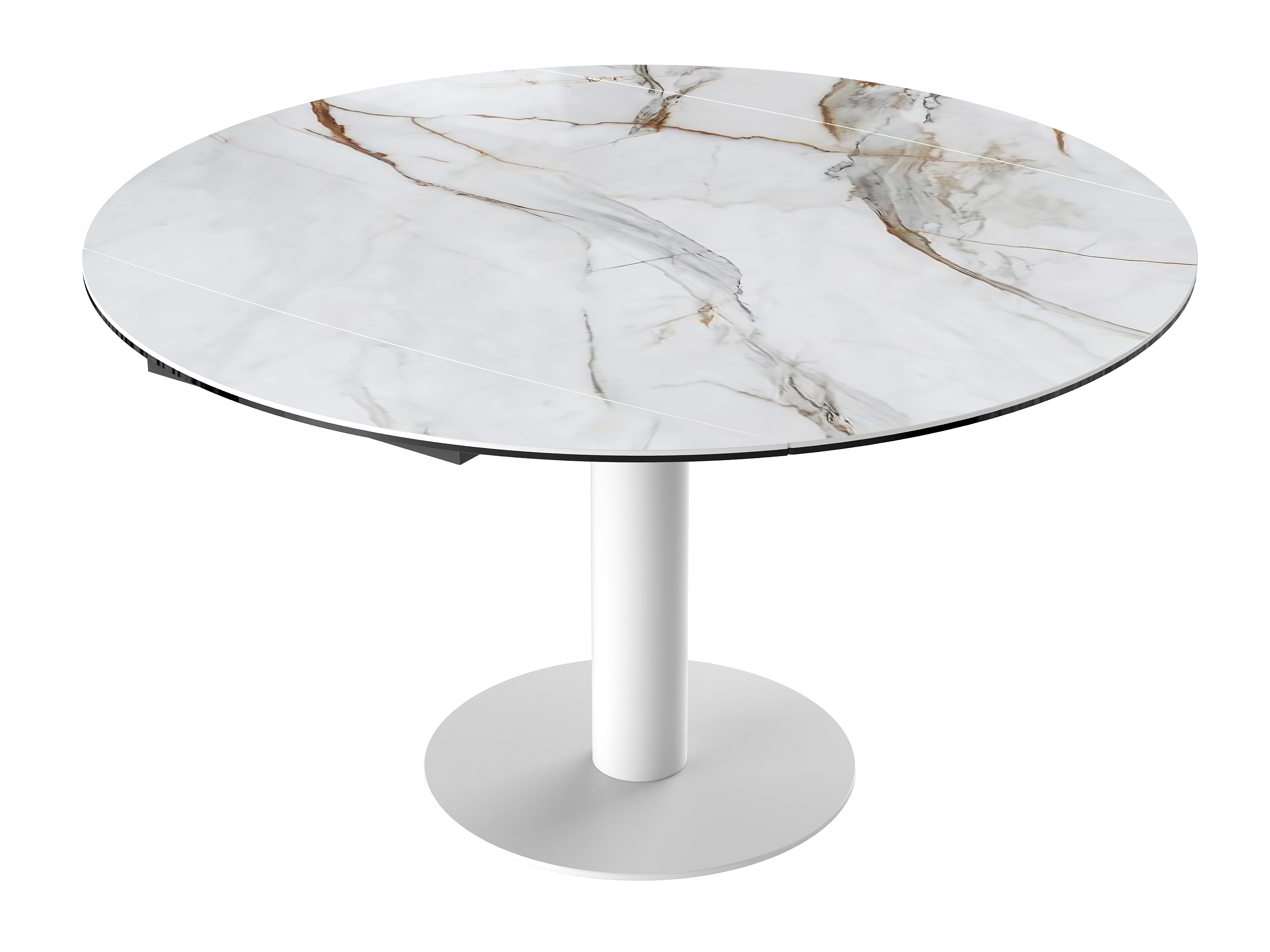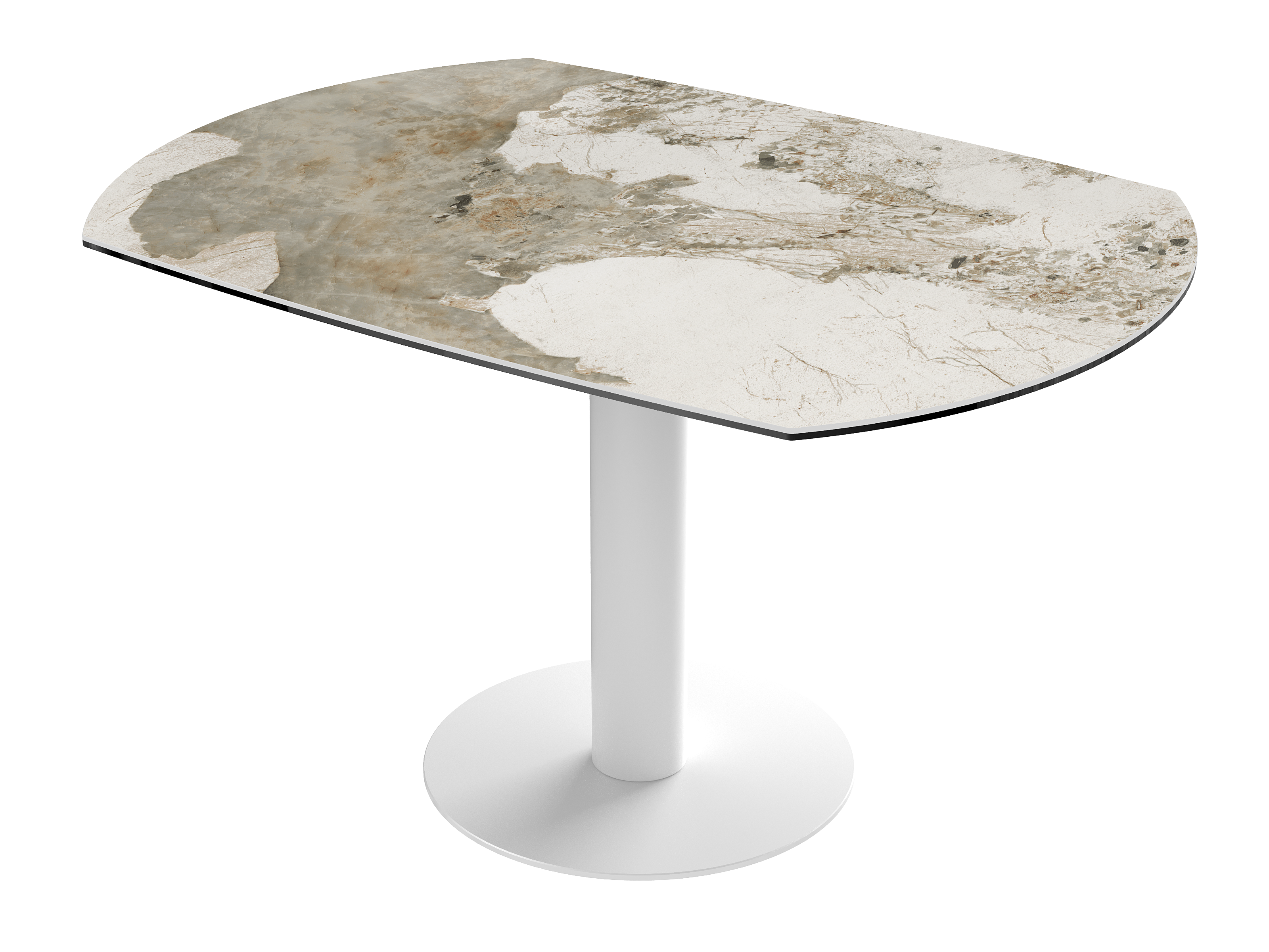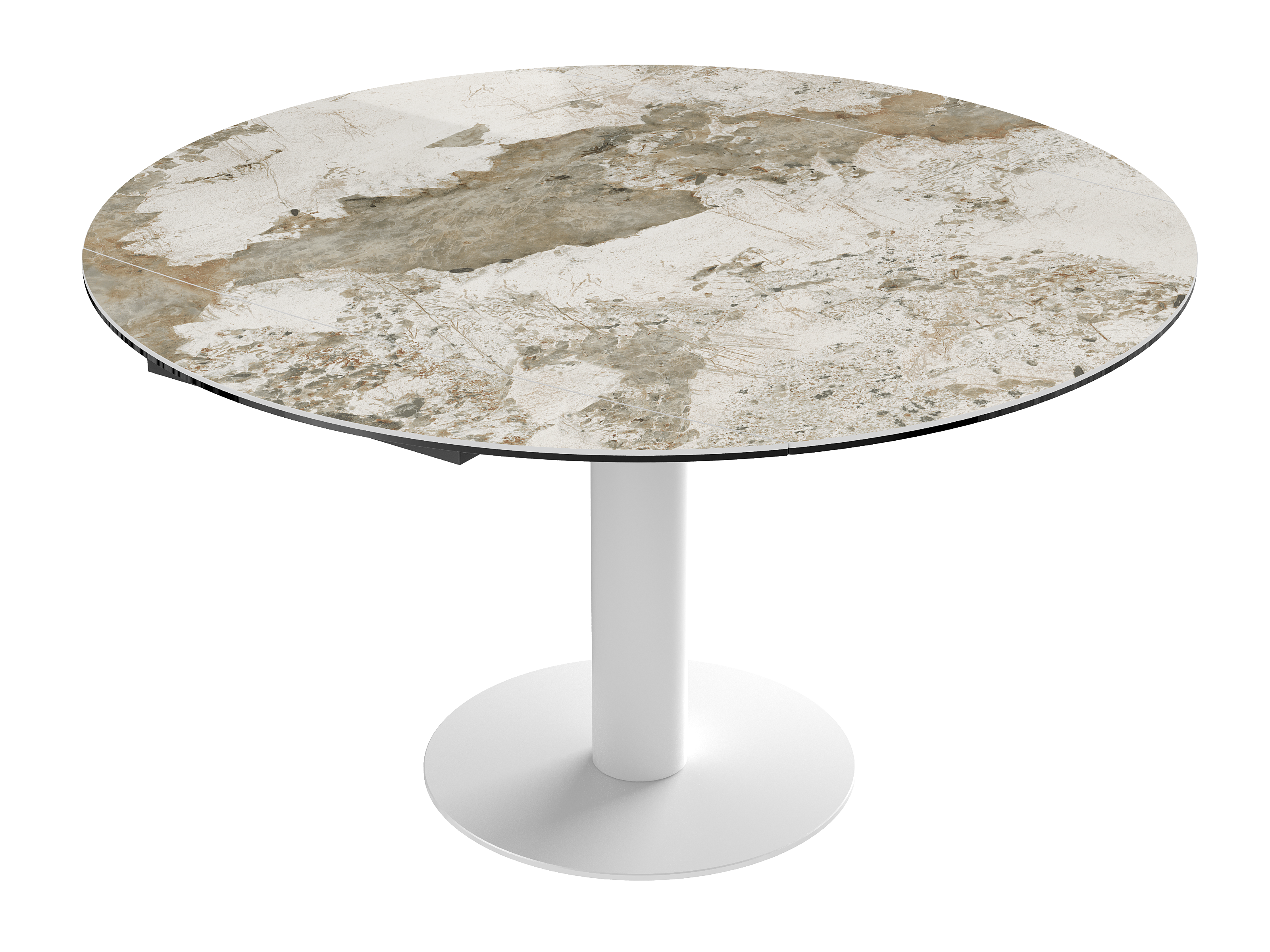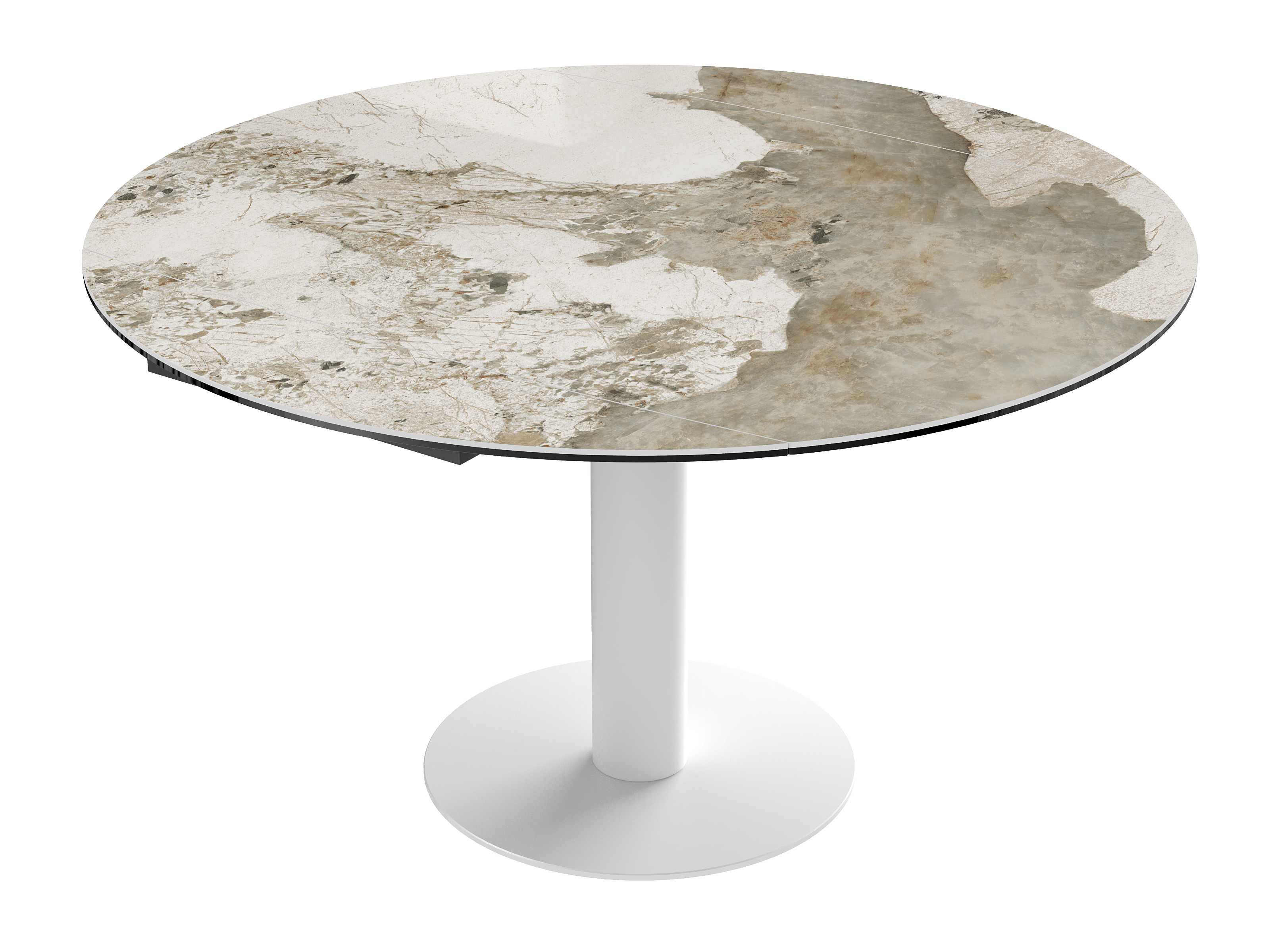 Dimensiones y detalles Peso neto : 87,9 Kg Color : Marmól mate Dimensiones cerrado : 135 x 95 x 77 cm Dimensiones abiertas : Ø 135 x 75 cm Altura : 77/75 cm Ancho : 95 cm Largo : 135 cm Mecanismo sincronizado Número de comensales : 4-6 personas Base : Acero lacado blanco mate Superficie : Cerámica de 3 mm pegada sobre vidrio de 8 mm Código INPI : 20161761