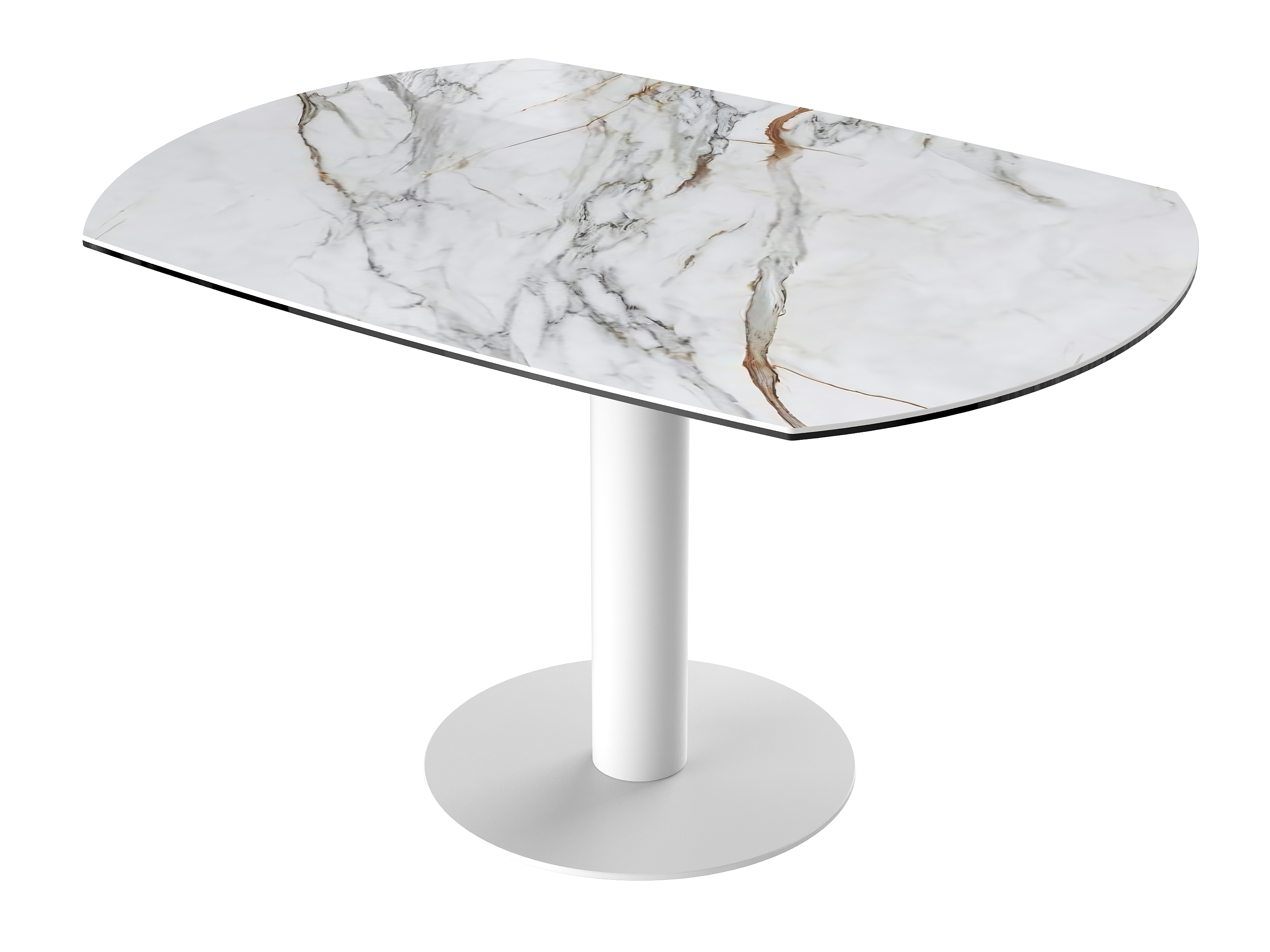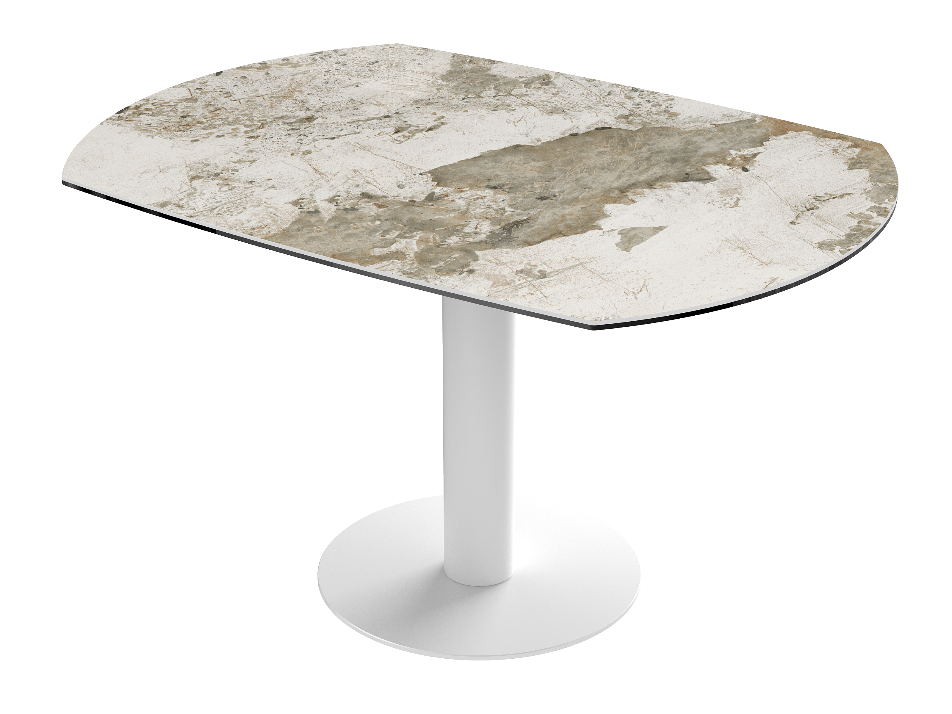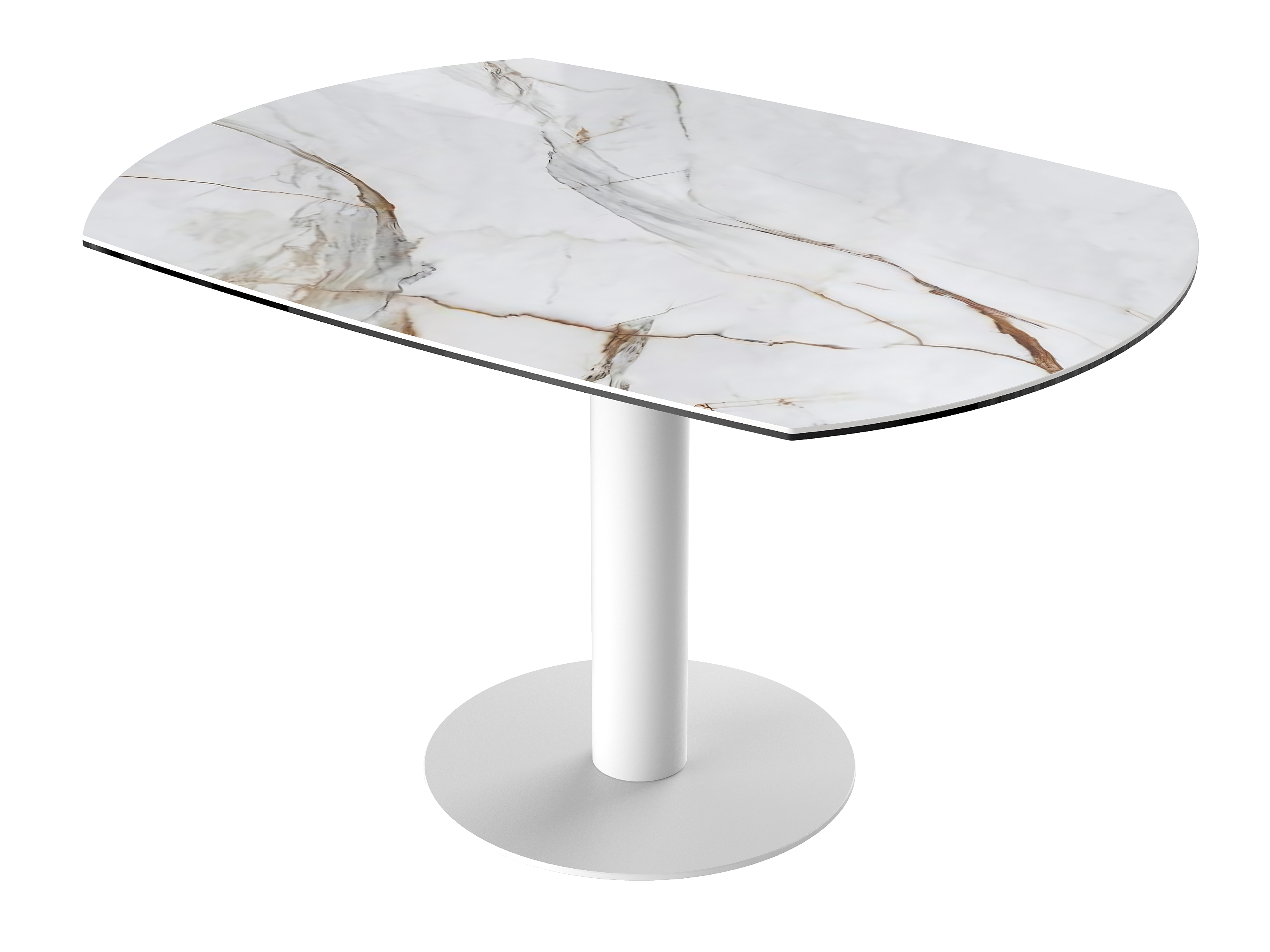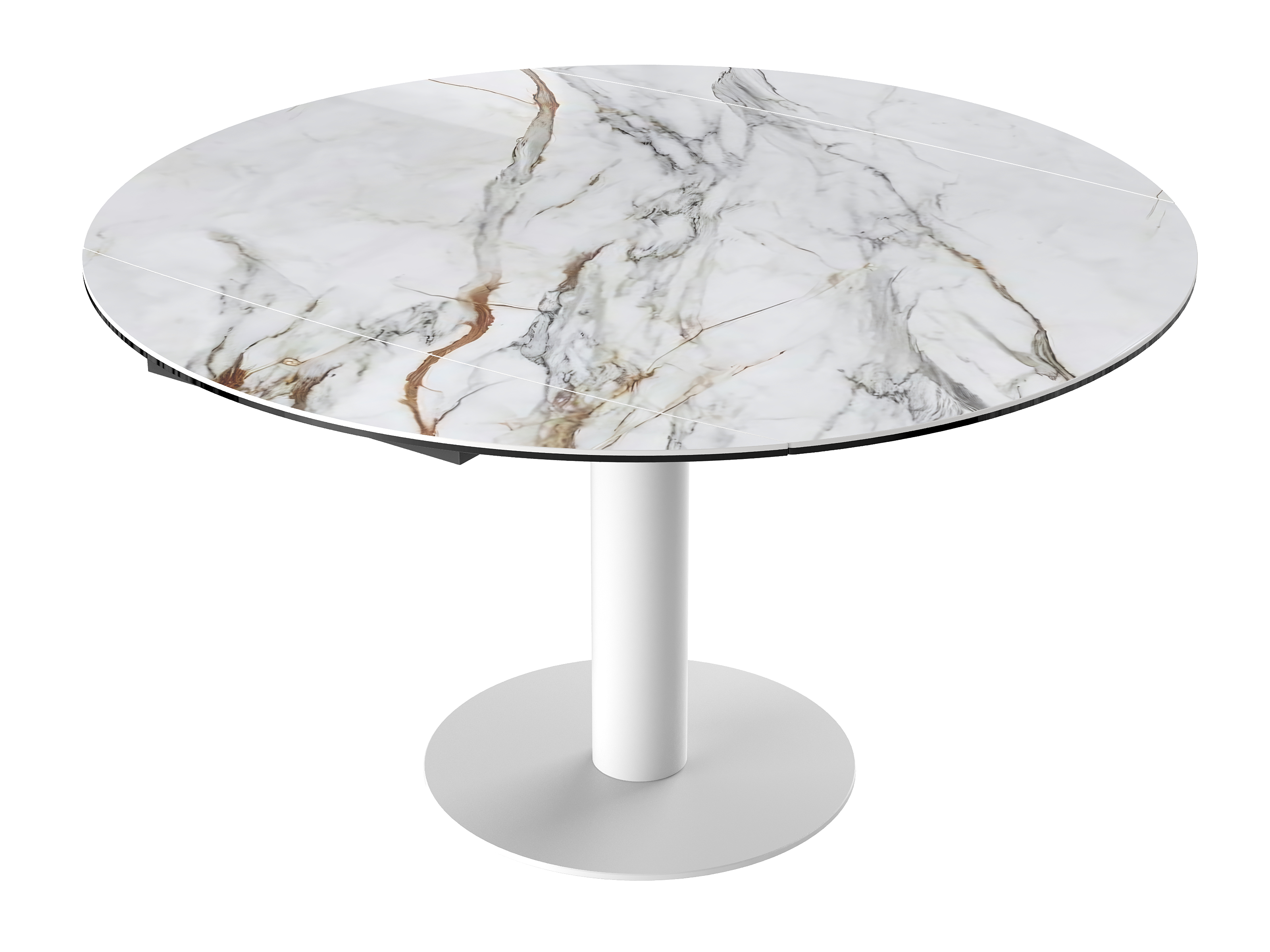 Dimensiones y detalles Peso neto : 87,9 Kg Color : Marmól mate Dimensiones cerrado : 135 x 95 x 77 cm Dimensiones abiertas : Ø 135 x 75 cm Altura : 77/75 cm Ancho : 95 cm Largo : 135 cm Mecanismo sincronizado Número de comensales : 4-6 personas Base : Acero lacado blanco mate Superficie : Cerámica de 3 mm pegada sobre vidrio de 8 mm Código INPI : 20161761