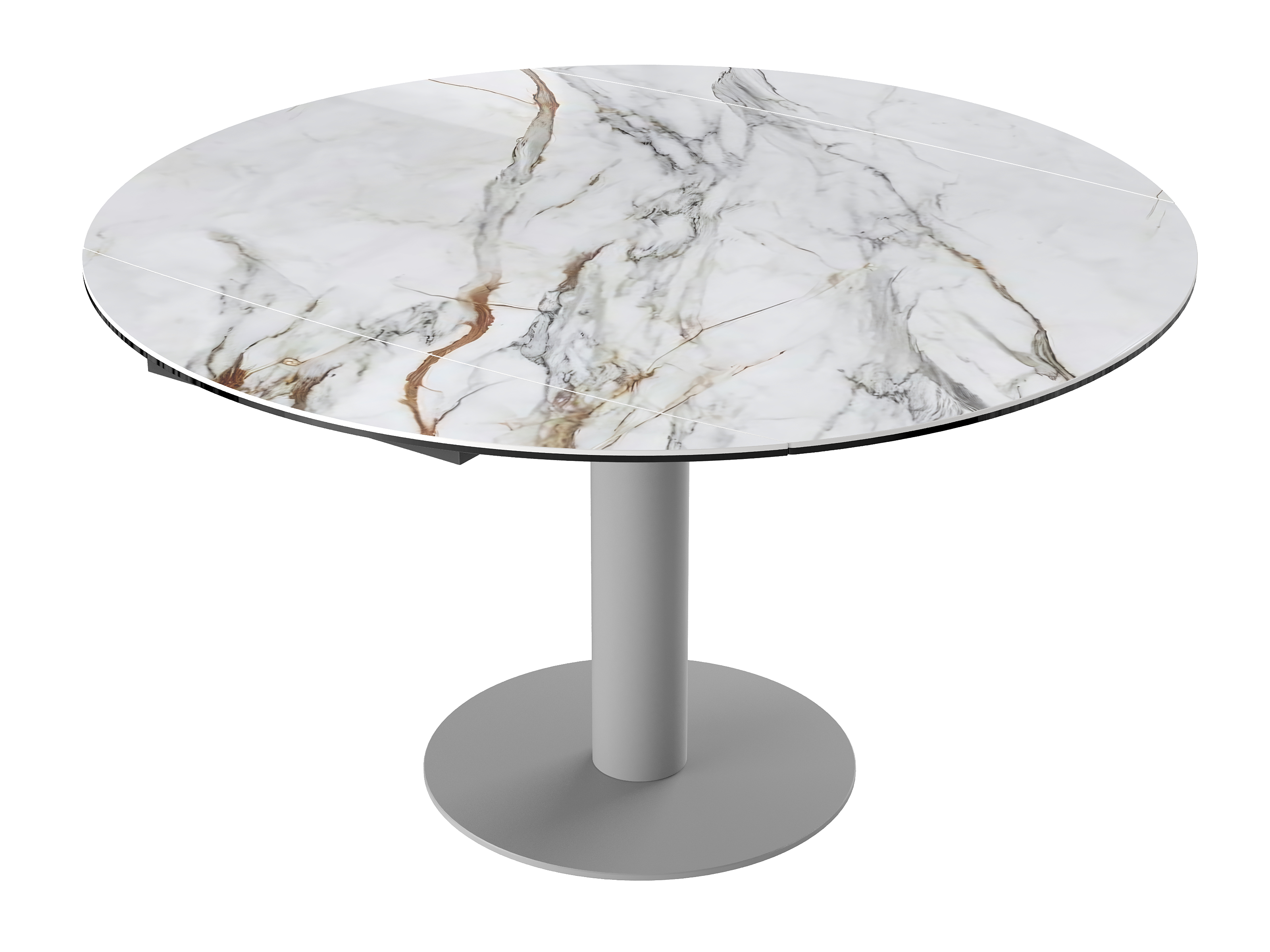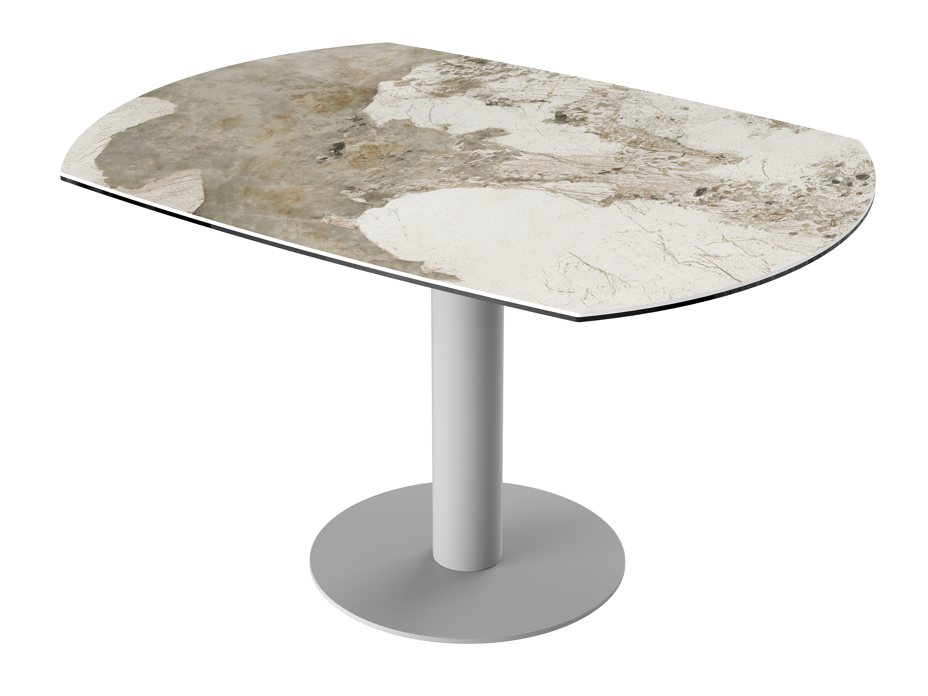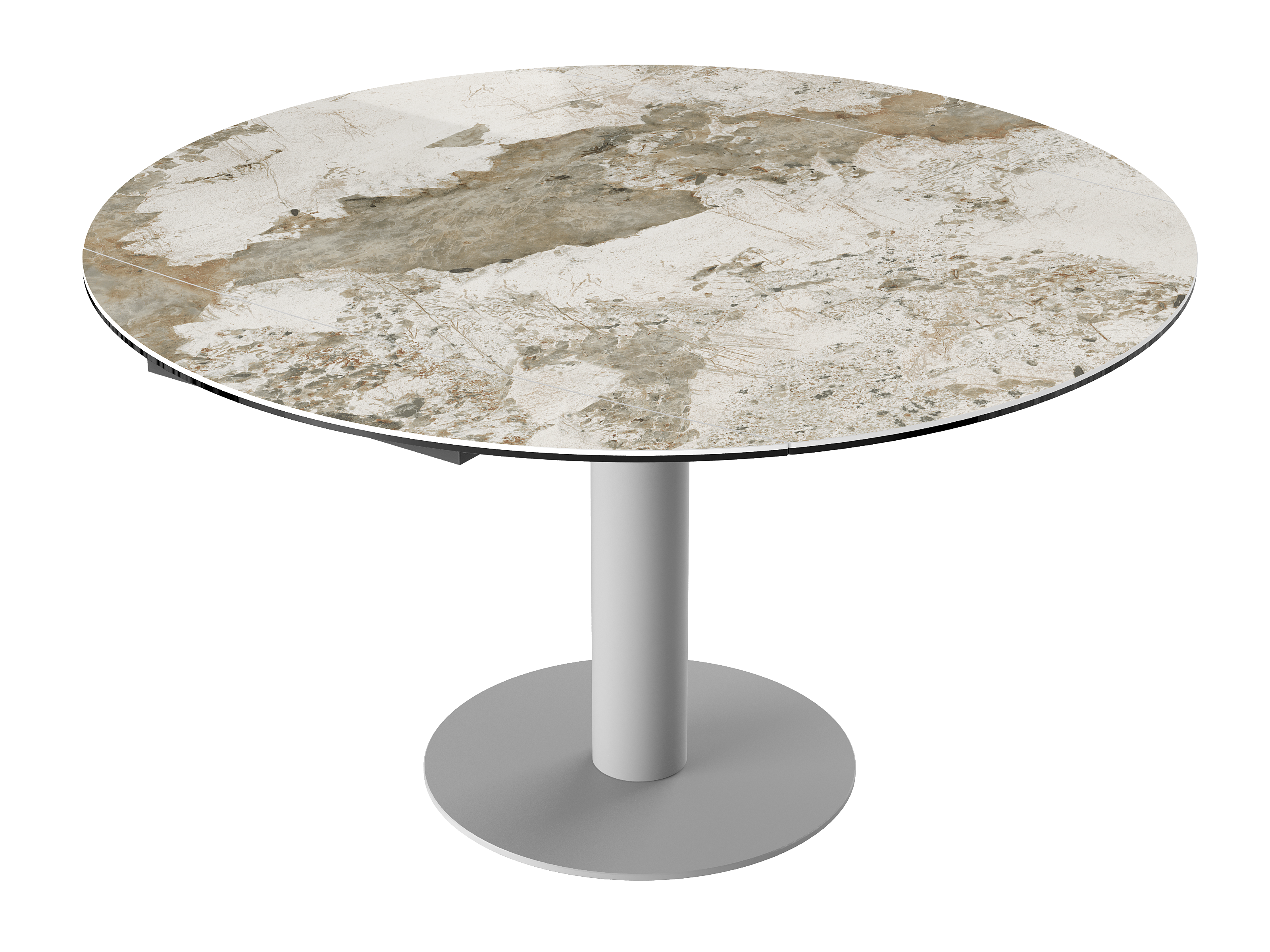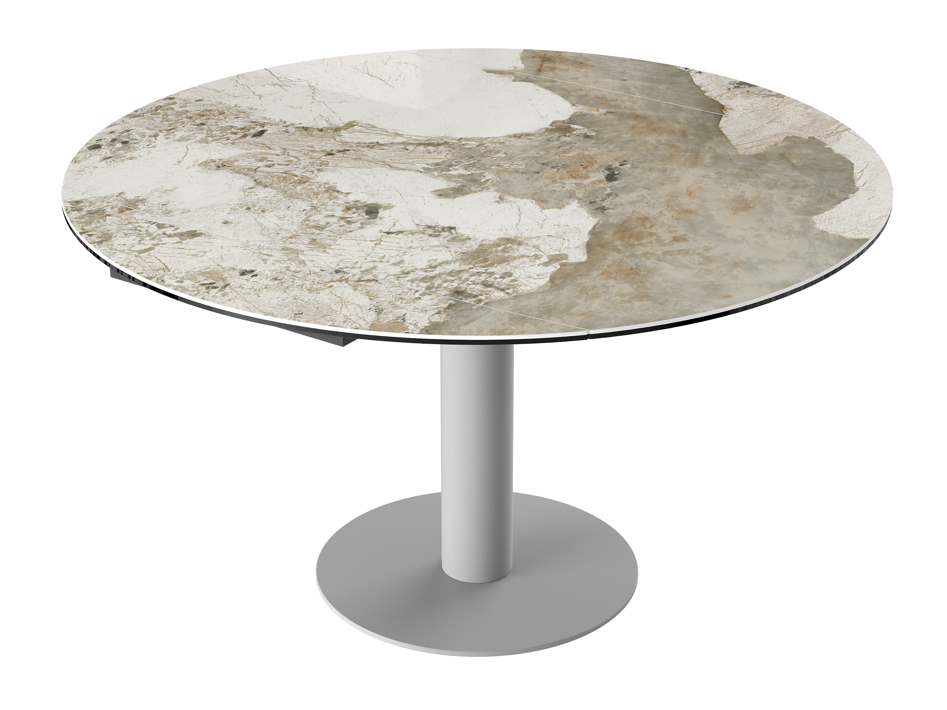 Dimensiones y detalles Peso neto : 87,9 Kg Color : Mármol Doro Dimensiones cerrado : 135 x 95 x 77 cm Dimensiones abiertas : Ø 135 x 75 cm Altura : 77/75 cm Ancho : 95 cm Largo : 135 cm Mecanismo sincronizado Número de comensales : 4-6 personas Base : Acero lacado gris sílex mate Superficie : Cerámica de 6 mm pegada sobre vidrio de 6 mm Código INPI : 20161761
