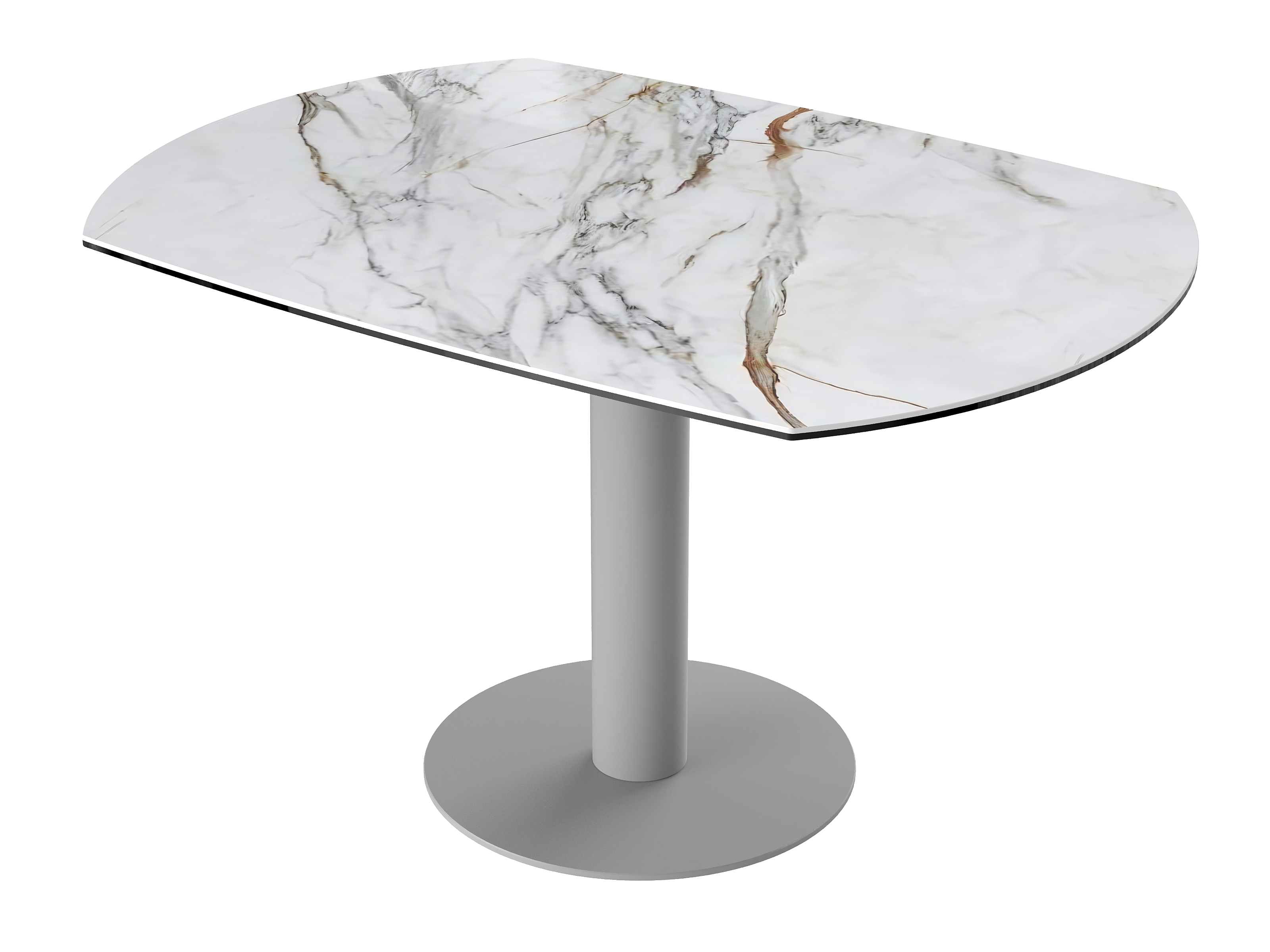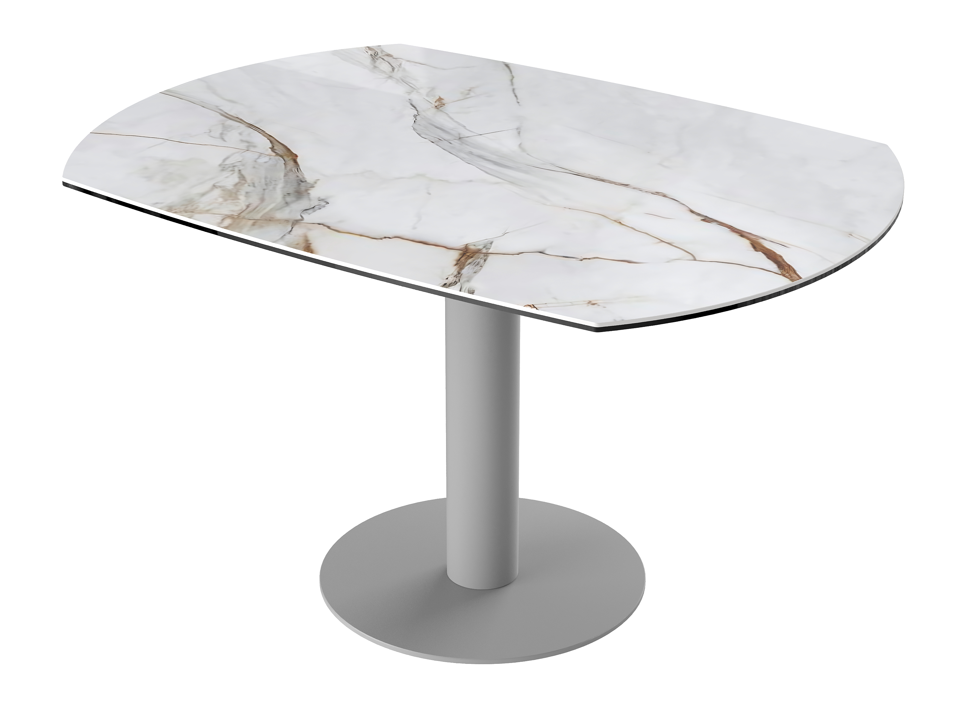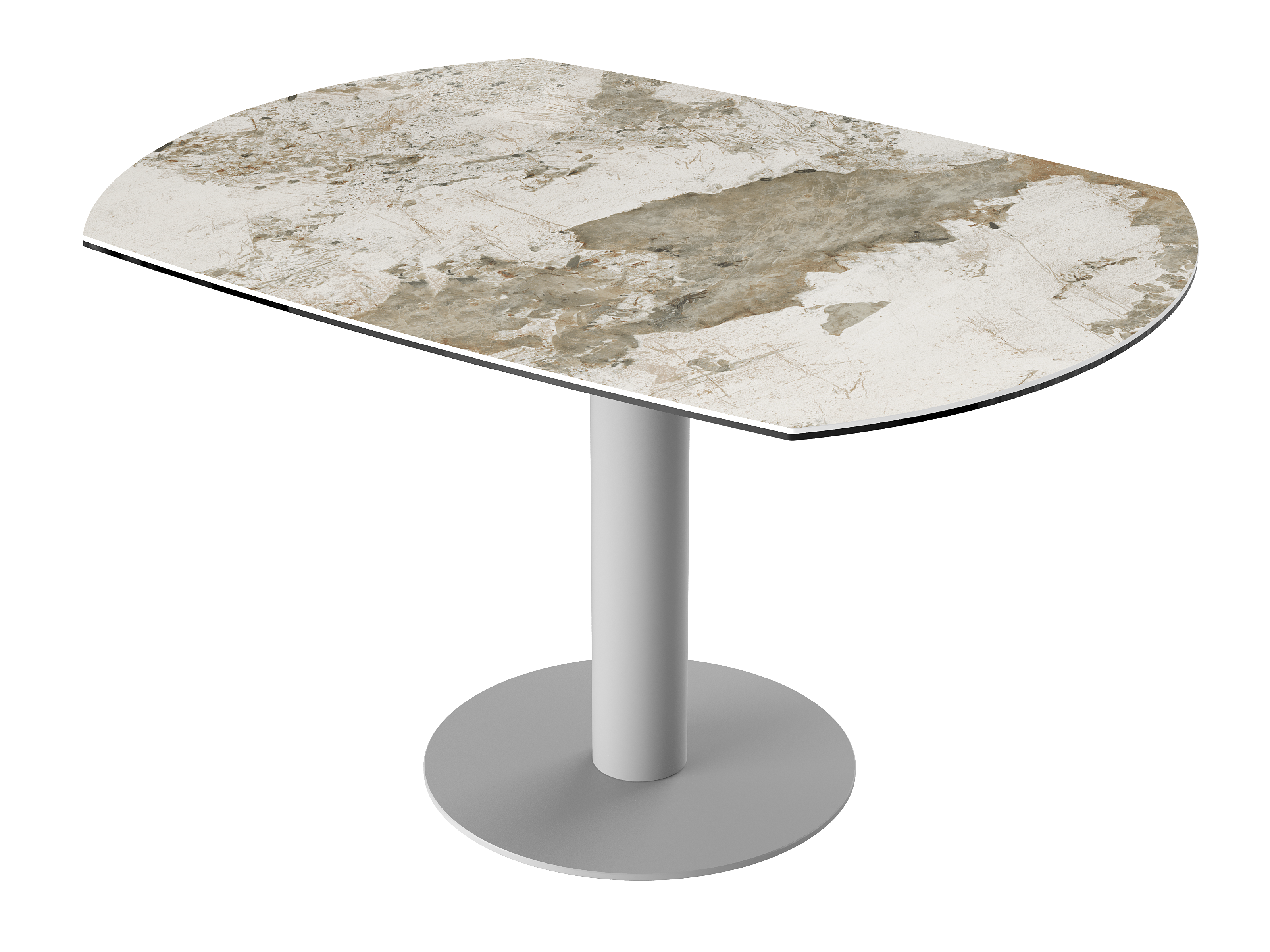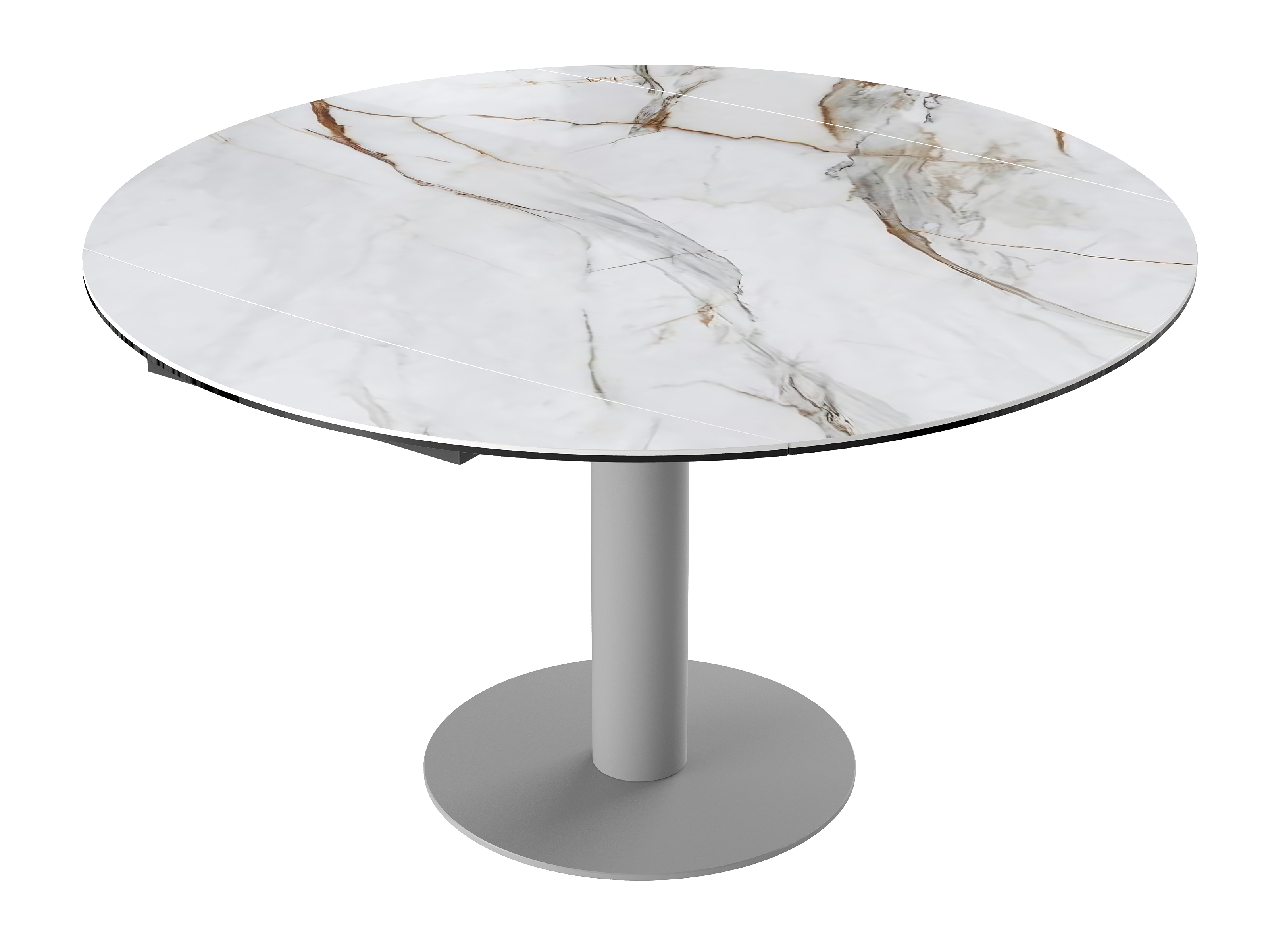 Dimensiones y detalles Peso neto : 87,9 Kg Color : Mármol Doro Dimensiones cerrado : 135 x 95 x 77 cm Dimensiones abiertas : Ø 135 x 75 cm Altura : 77/75 cm Ancho : 95 cm Largo : 135 cm Mecanismo sincronizado Número de comensales : 4-6 personas Base : Acero lacado gris sílex mate Superficie : Cerámica de 6 mm pegada sobre vidrio de 6 mm Código INPI : 20161761