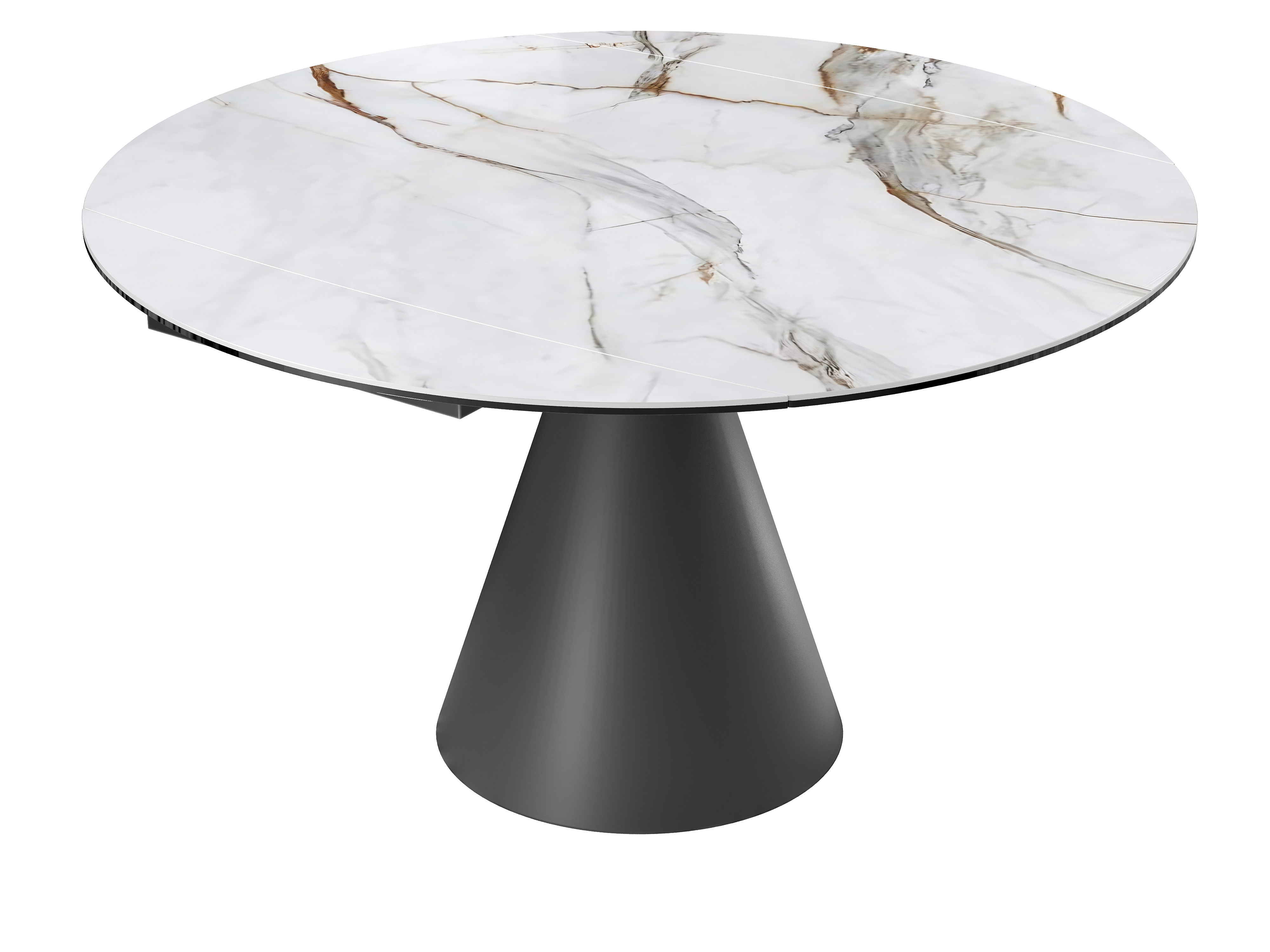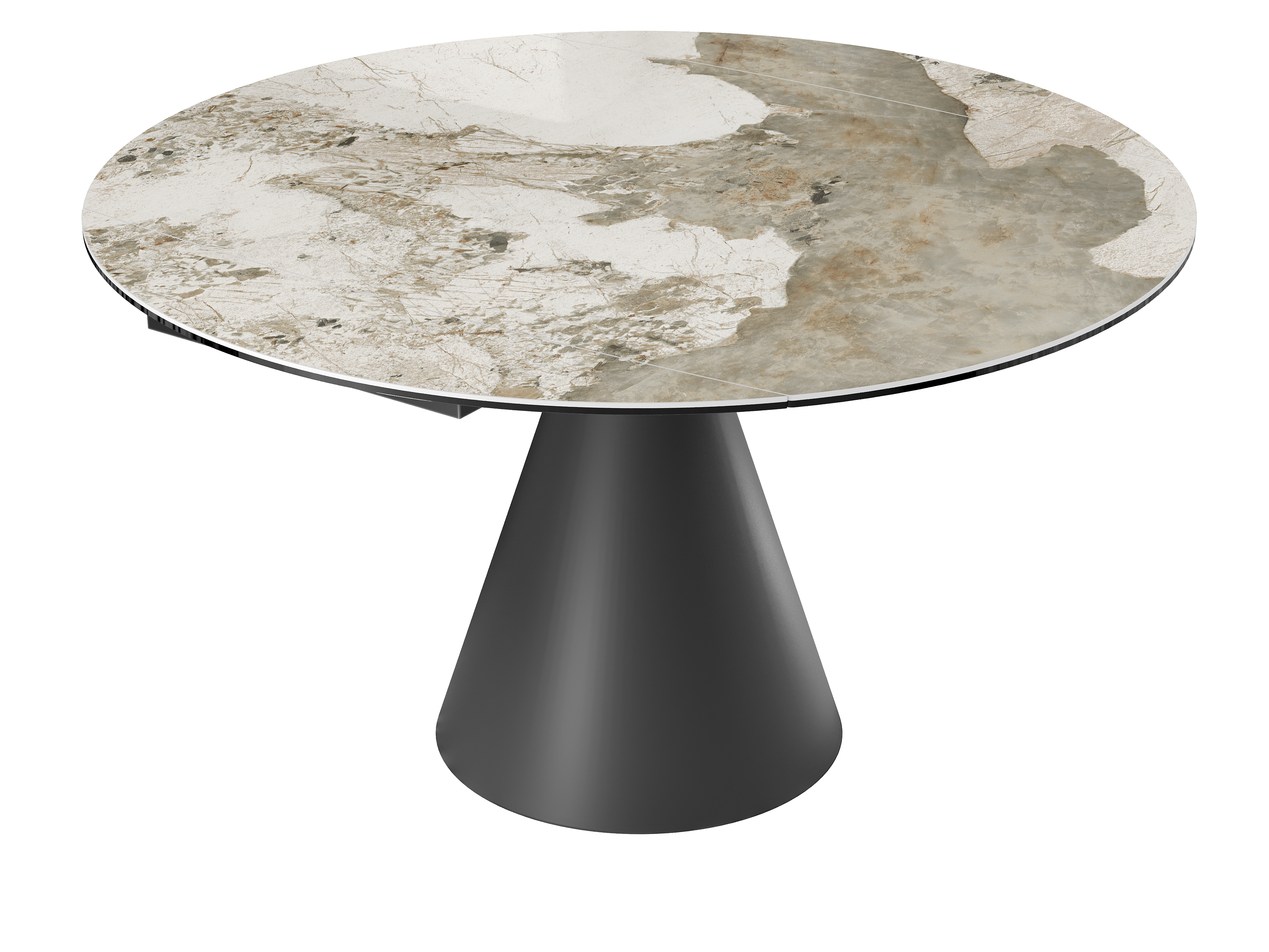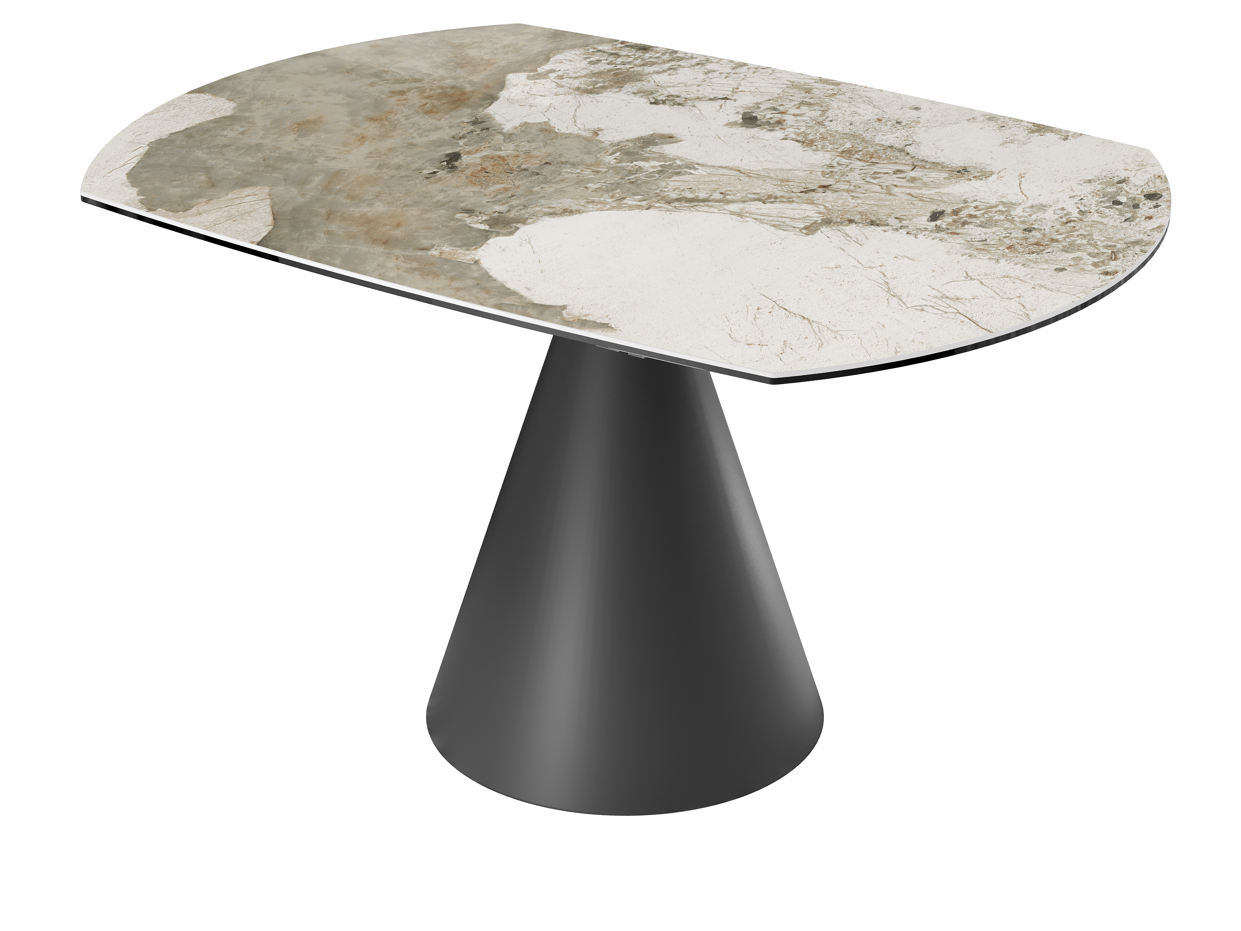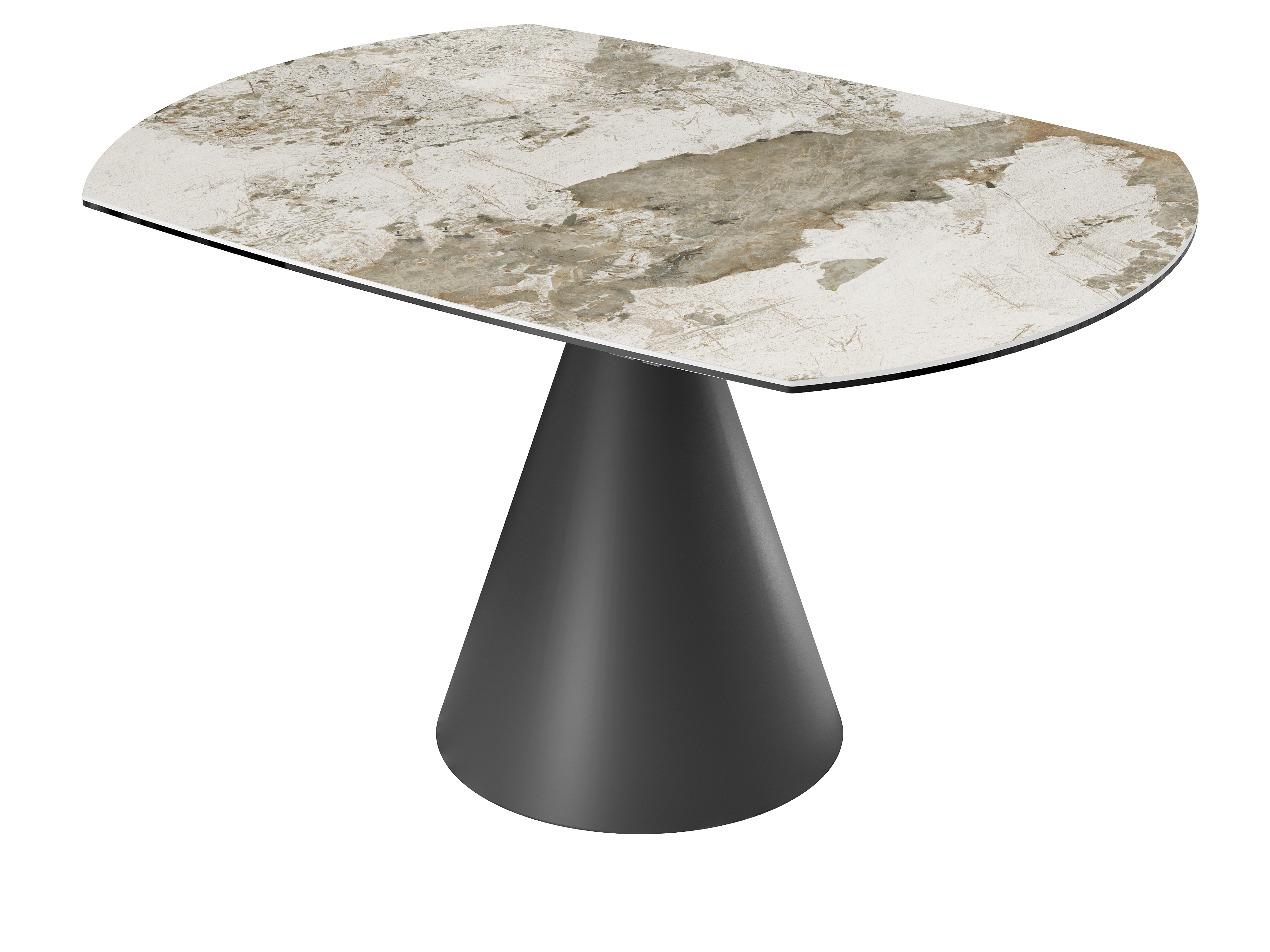 Dimensiones y detalles Peso neto : 81,3 Kg Color : Marmól mate Dimensiones : 135 x 95 x 75 cm Dimensiones abiertas : Ø 135 x 77 cm Altura : 77/75 cm Ancho : 95 cm Largo : 135 cm Mecanismo sincronizado Base : Acero lacado negro mate Superficie : Cerámica de 3 mm pegada sobre vidrio de 8 mm Código INPI : 20231433
