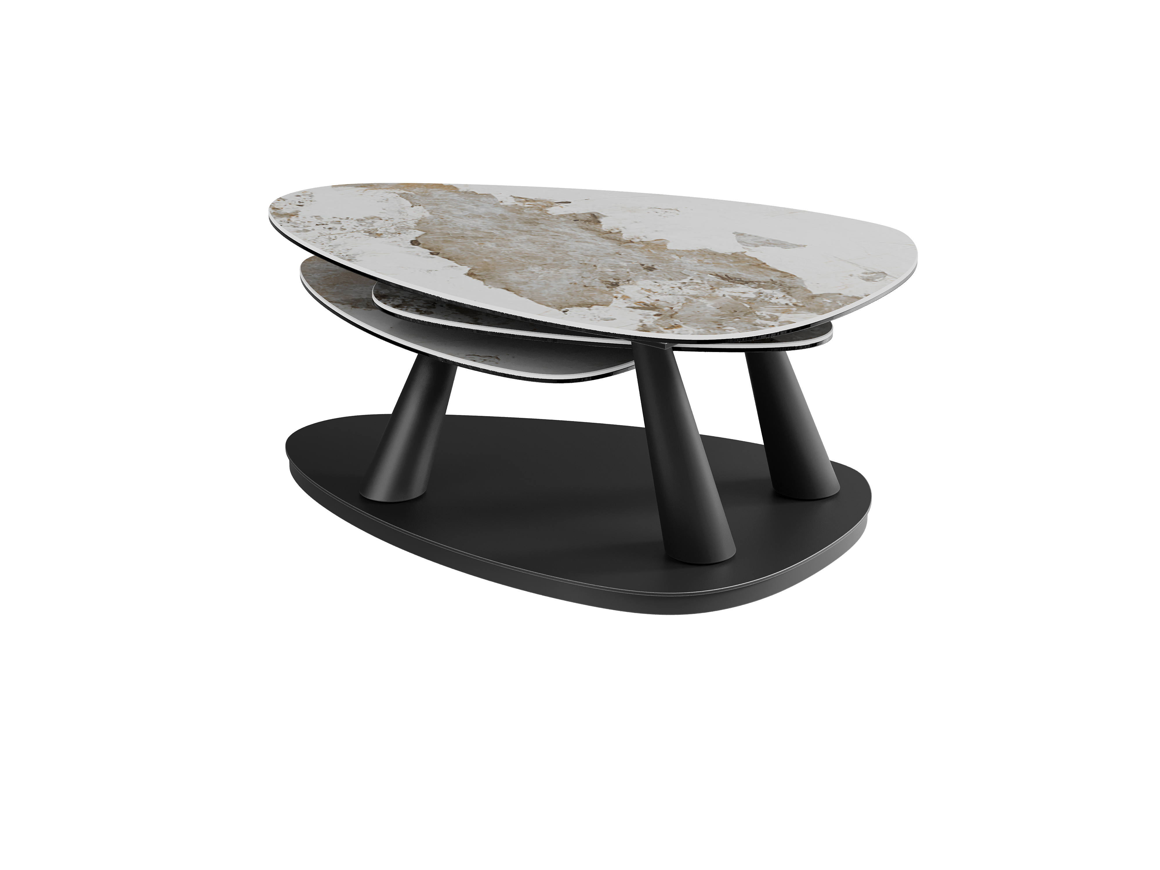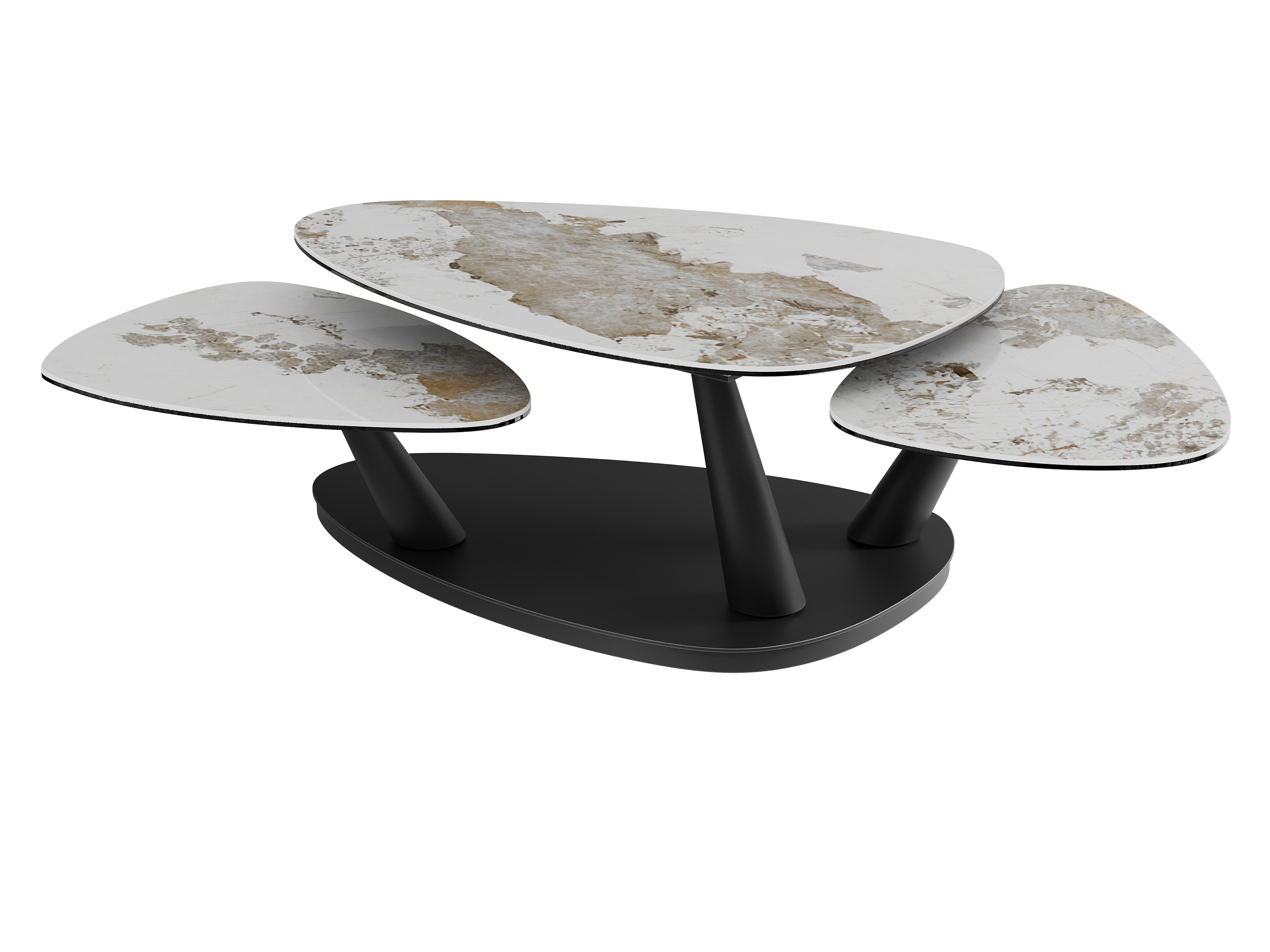 Découvrez la nouvelle table basse Camelias. Dotée de trois plateaux pivotants, elle offre une surface généreuse qui peut atteindre 1,55 m de longueur. Ses plateaux sont en céramique Argile de 3 mm, collée sur un verre de 6 mm. Sa structure en acier laqué noir mat est dotée de roulettes pour faciliter son déplacement. Fonctionnelle, elle est idéale pour vos prochains moments conviviaux. Camelias mesure 100 cm de long sur 65 cm de large fermée et 155 cm de long sur 71 cm de large ouverte, sa hauteur est de 42 cm.