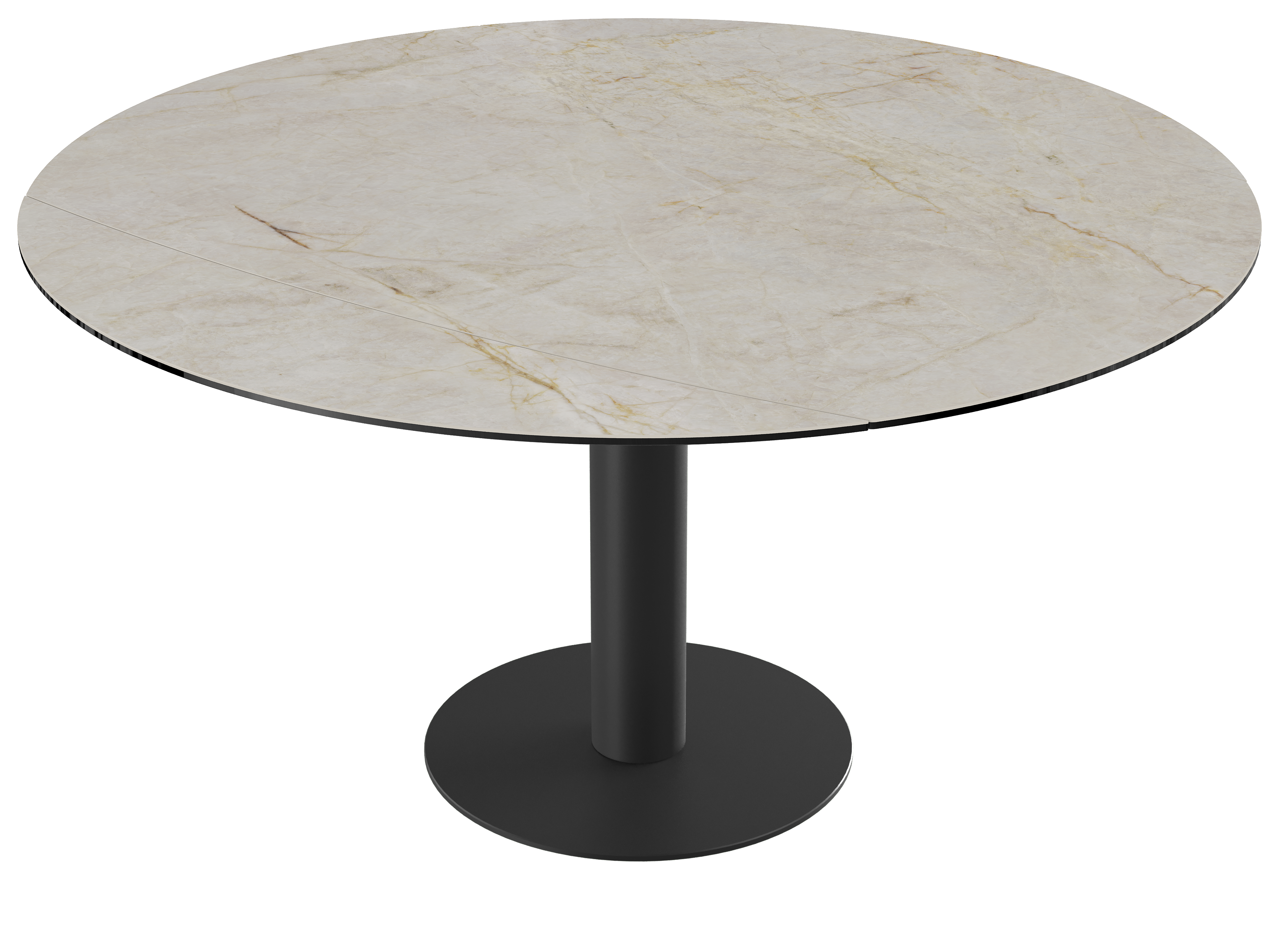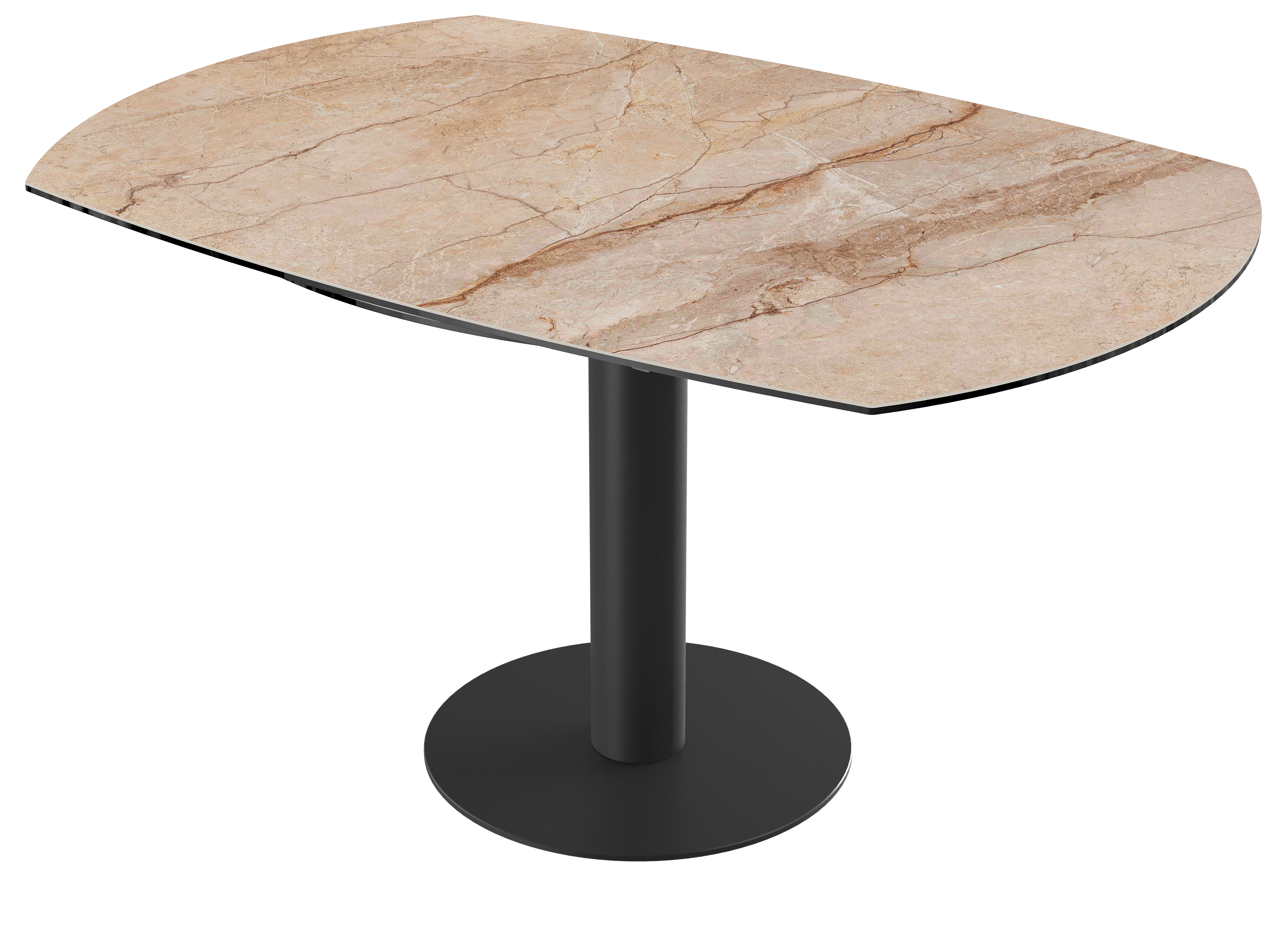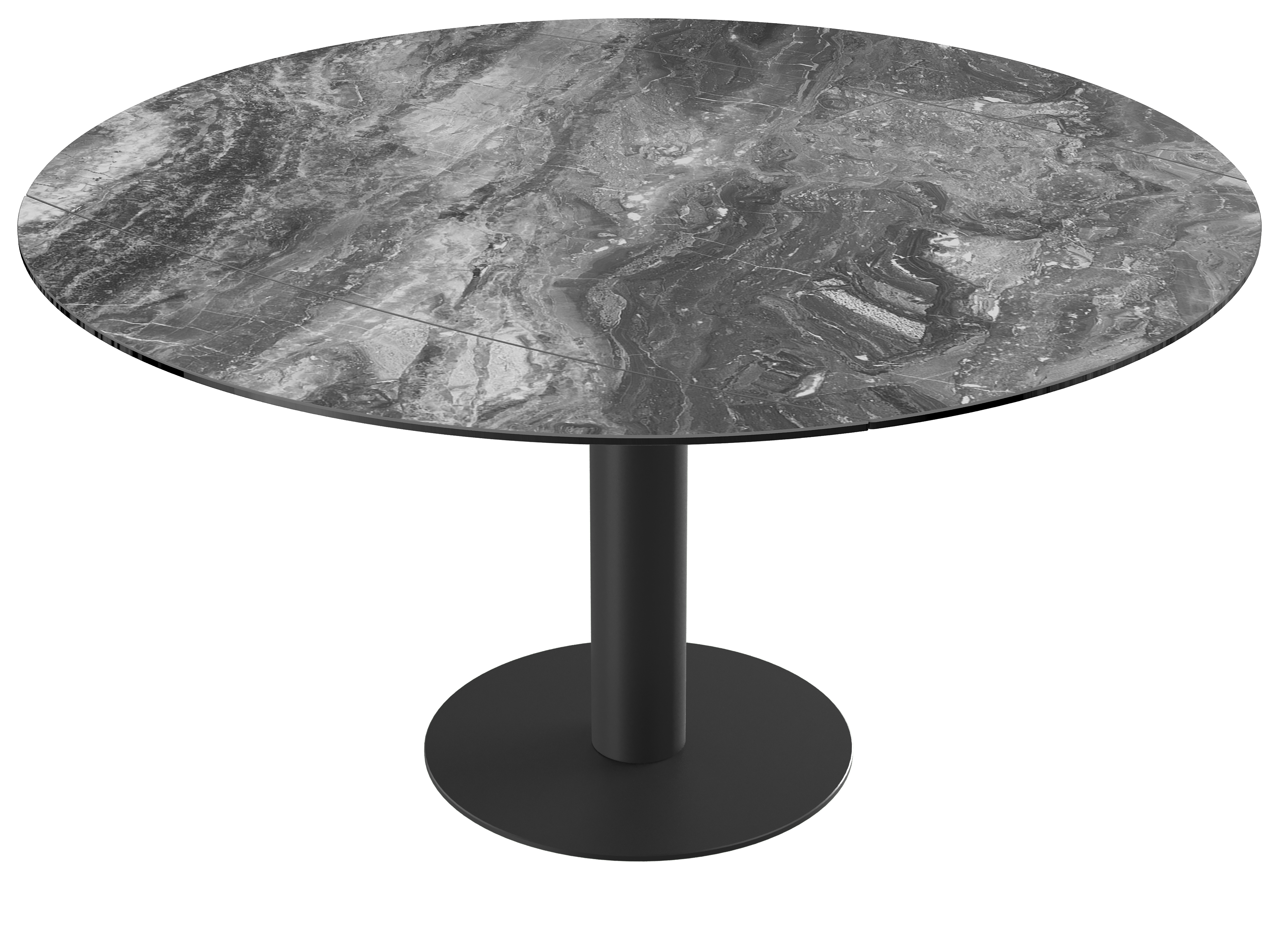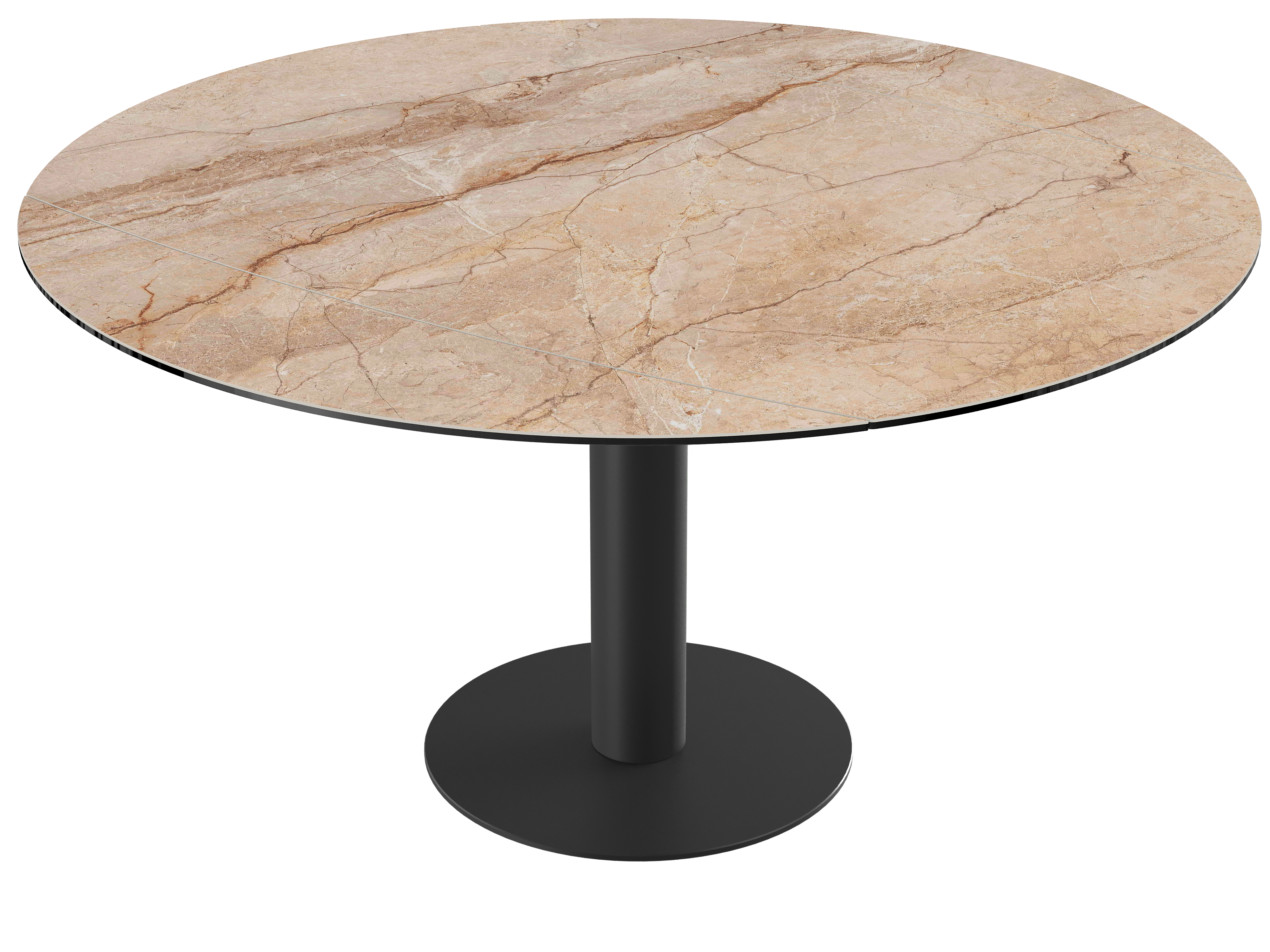 Impressionnez vos convives grâce à la table de repas extensible : New Luna. Cette table de repas au mécanisme synchronisé et breveté Akante est dotée de deux rallonges latérales de 25 cm. Lorsque vous tournez le plateau, obtenez une table ronde de 150 cm de diamètre. Ce modèle est conçu en céramique Marbre Calcatta de 6 mm, collée sur un verre de 6 mm. Son élégant piétement est conçu en acier laqué noir mat. Accueillez entre 6 et 8 personnes pour un repas en toute convivialité.