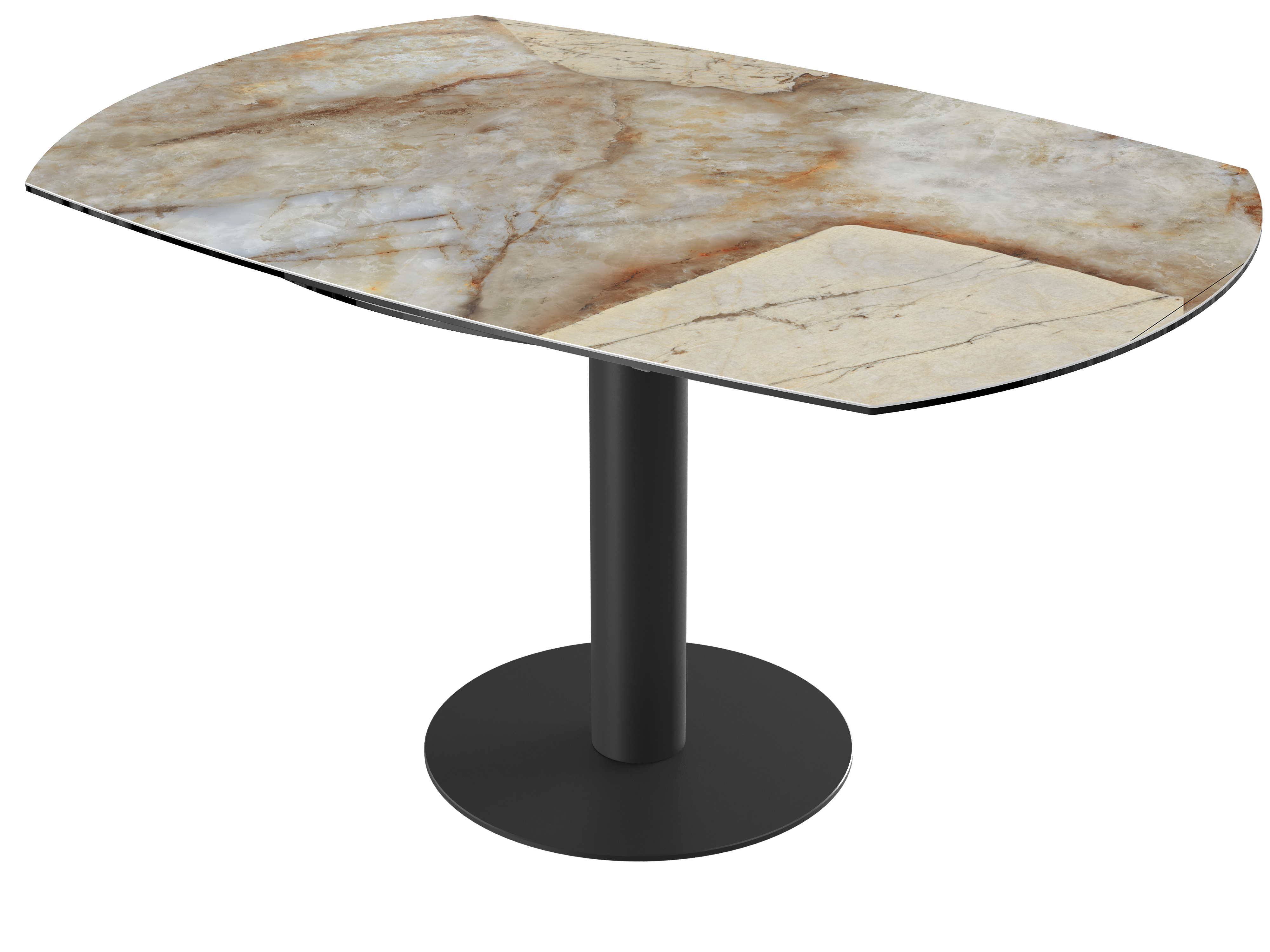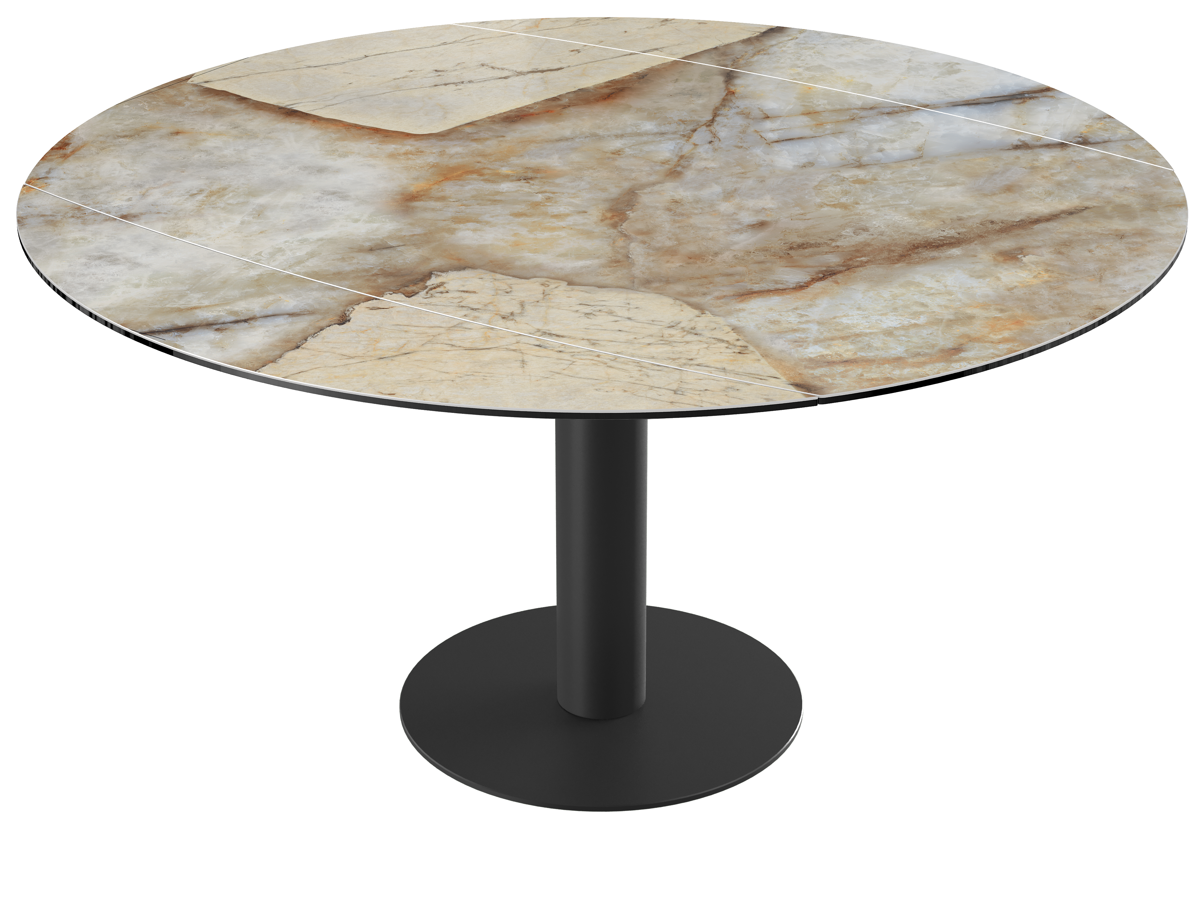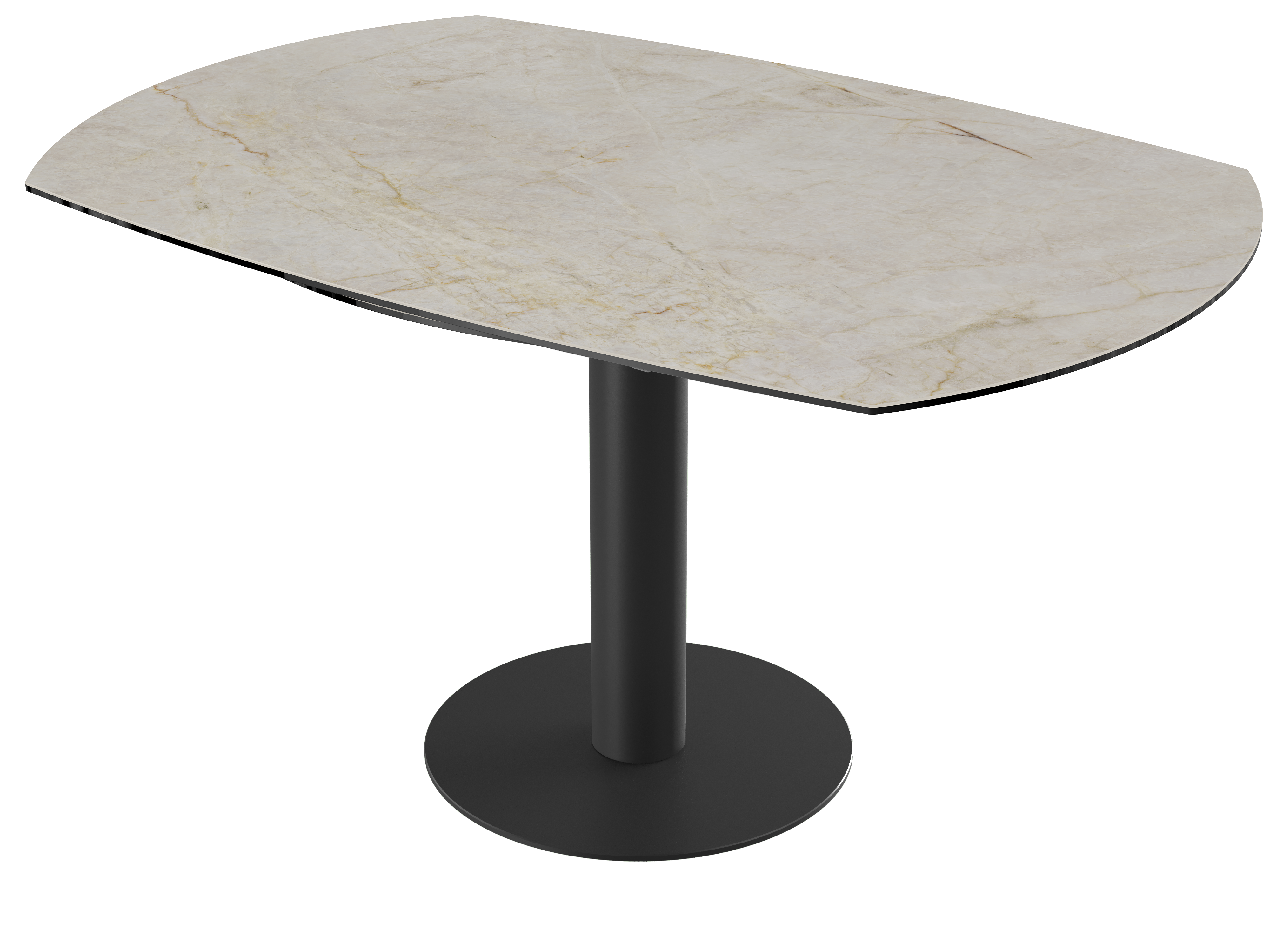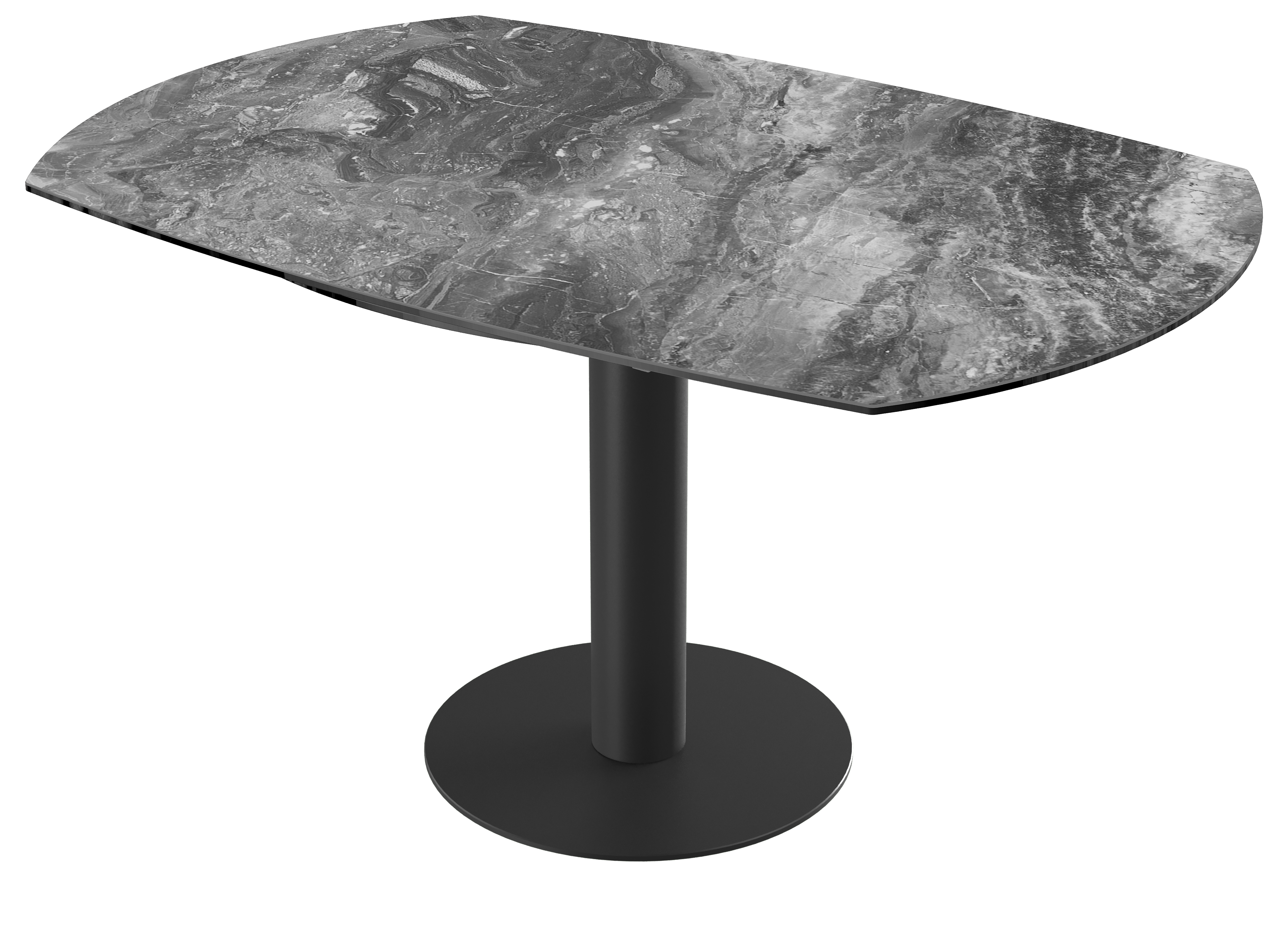 Impressionnez vos convives grâce à la table de repas extensible : New Luna. Cette table de repas au mécanisme synchronisé et breveté Akante est dotée de deux rallonges latérales de 25 cm. Lorsque vous tournez le plateau, obtenez une table ronde de 150 cm de diamètre. Ce modèle est conçu en céramique Marbre Calcatta de 6 mm, collée sur un verre de 6 mm. Son élégant piétement est conçu en acier laqué noir mat. Accueillez entre 6 et 8 personnes pour un repas en toute convivialité.