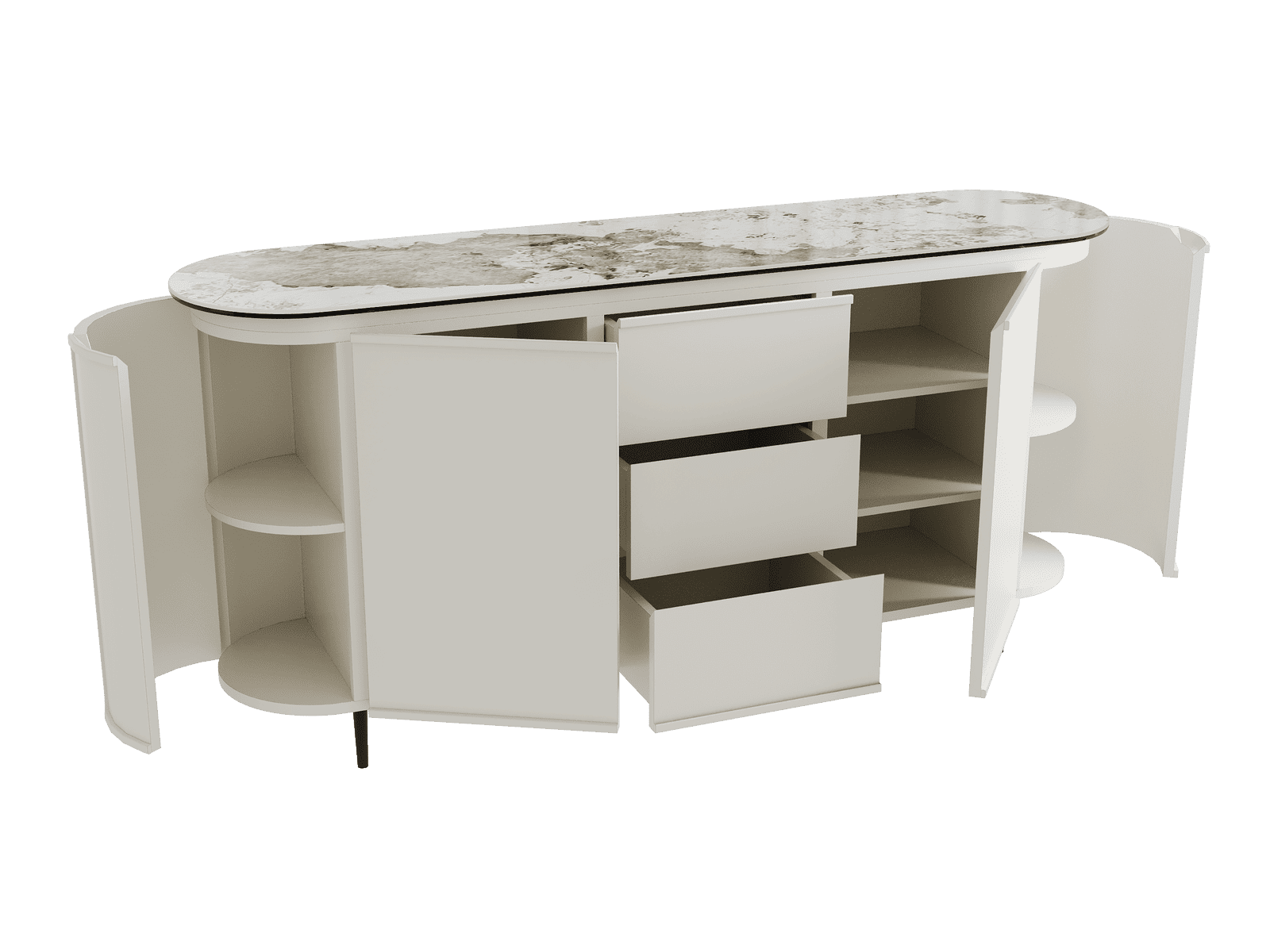 The OHIO sideboard combines the warmth of wood with the elegance of ceramic for a refined and functional style. It offers generous storage capacity thanks to its integrated shelves and drawers. Its top, available in ten ceramic finishes, blends harmoniously with any interior. Offered in two sizes (130 or 170 cm), the OHIO sideboard embodies a perfect balance between modernity and authenticity.