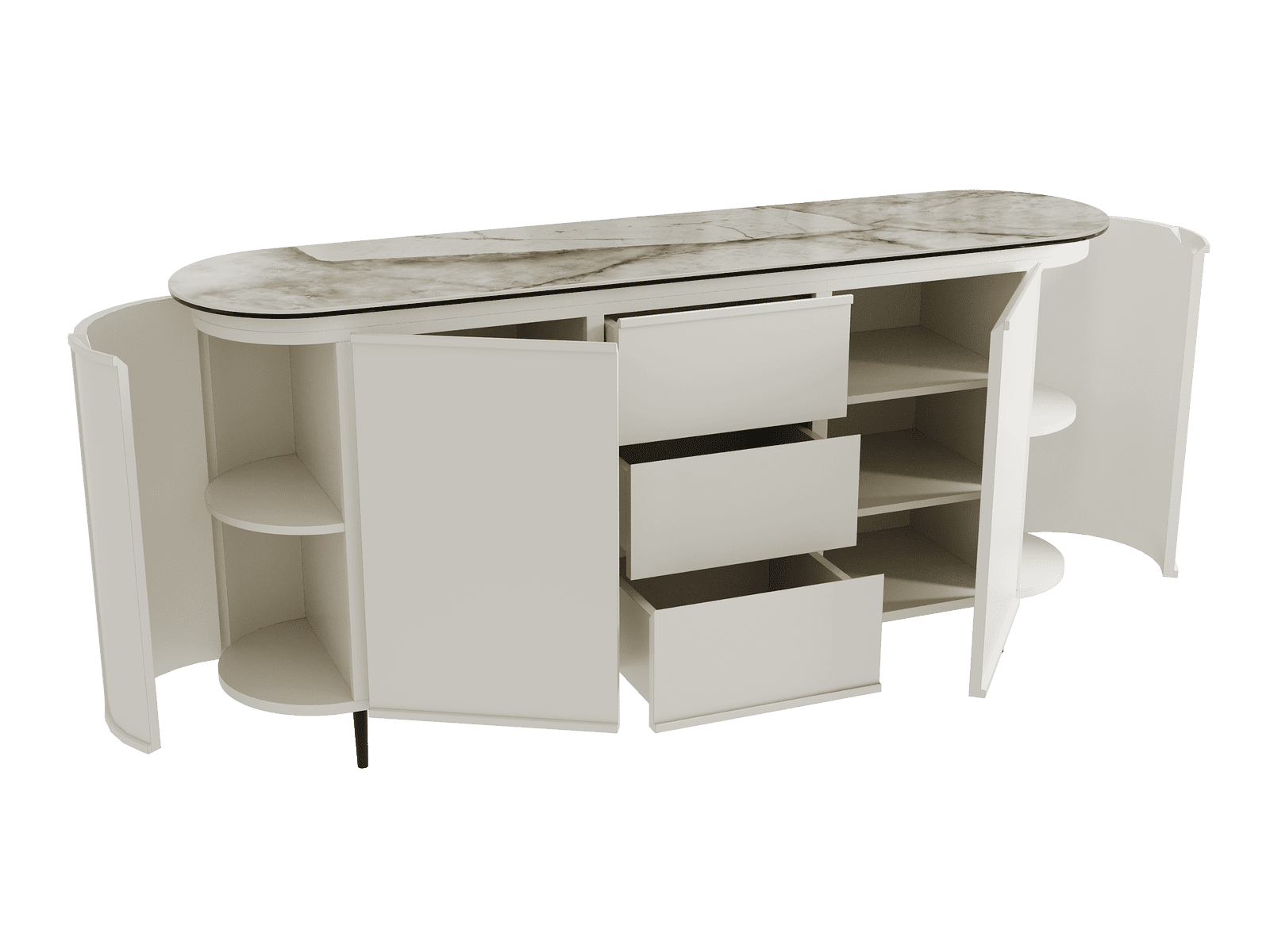 The OHIO sideboard combines the warmth of wood with the elegance of ceramic for a refined and functional style. It offers generous storage capacity thanks to its integrated shelves and drawers. Its top, available in ten ceramic finishes, blends harmoniously with any interior. Offered in two sizes (130 or 170 cm), the OHIO sideboard embodies a perfect balance between modernity and authenticity.