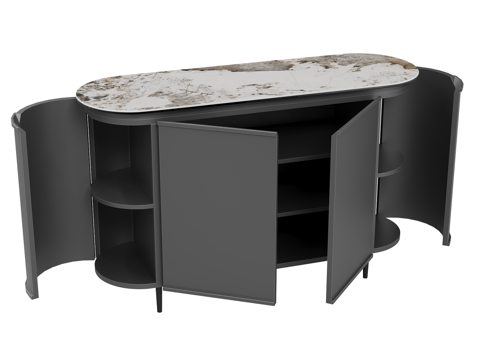 The OHIO sideboard combines the warmth of wood with the elegance of ceramic for a refined and functional style. It offers generous storage capacity thanks to its integrated shelves and drawers. Its top, available in ten ceramic finishes, blends harmoniously with any interior. Offered in two sizes (130 or 170 cm), the OHIO sideboard embodies a perfect balance between modernity and authenticity.