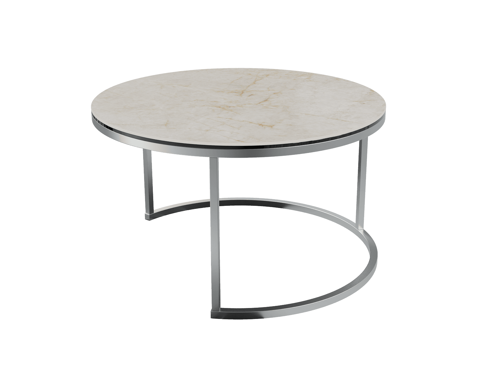 Afmetingen en details Nettogewicht : 15 Kg Kleur : Cremona Diameter : 75 cm Afmetingen : Ø 75 x 43 cm Hoogte : 43 cm Onderstel : gepolijst roestvrij staal Blad : 6 mm keramiek gekleefd op 6 mm glas INPI : 20215513