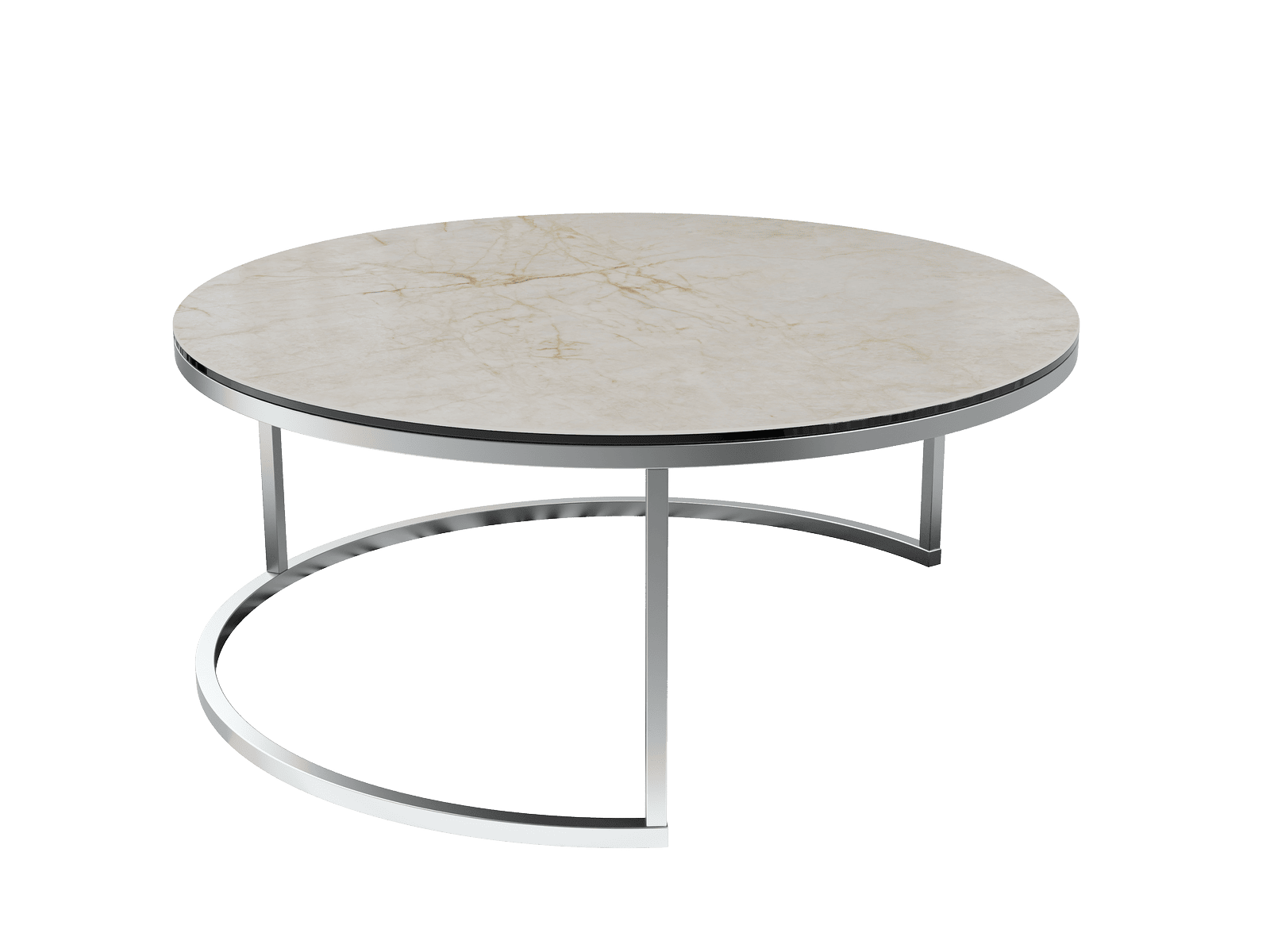 Afmetingen en details Nettogewicht : 20,5 Kg Diameter : 90 cm Afmetingen : Ø 90 x 38 cm Hoogte : 38 cm Onderstel : gepolijst roestvrij staal Blad : 6 mm keramiek gekleefd op 6 mm glas Stof per meter INPI : 20215513