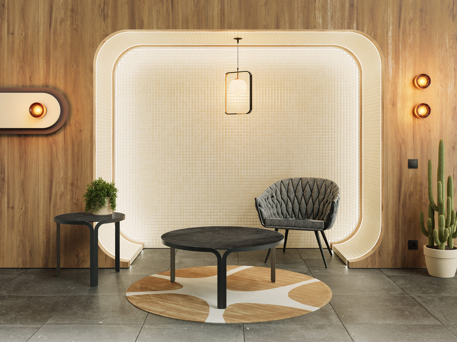 If an elegant coffee table is all that you have ever been dreaming of, try the Madura collection. This coffee table has a 90 cm diameter plate, perfect to welcome all of your guests. The 3 mm thick titanium ceramic glued upon a 6 mm glass pane will make your living room look modern. Combined with its matt black lacquered steel base, it will undoubtedly become your favourite piece of industrial-style furniture.